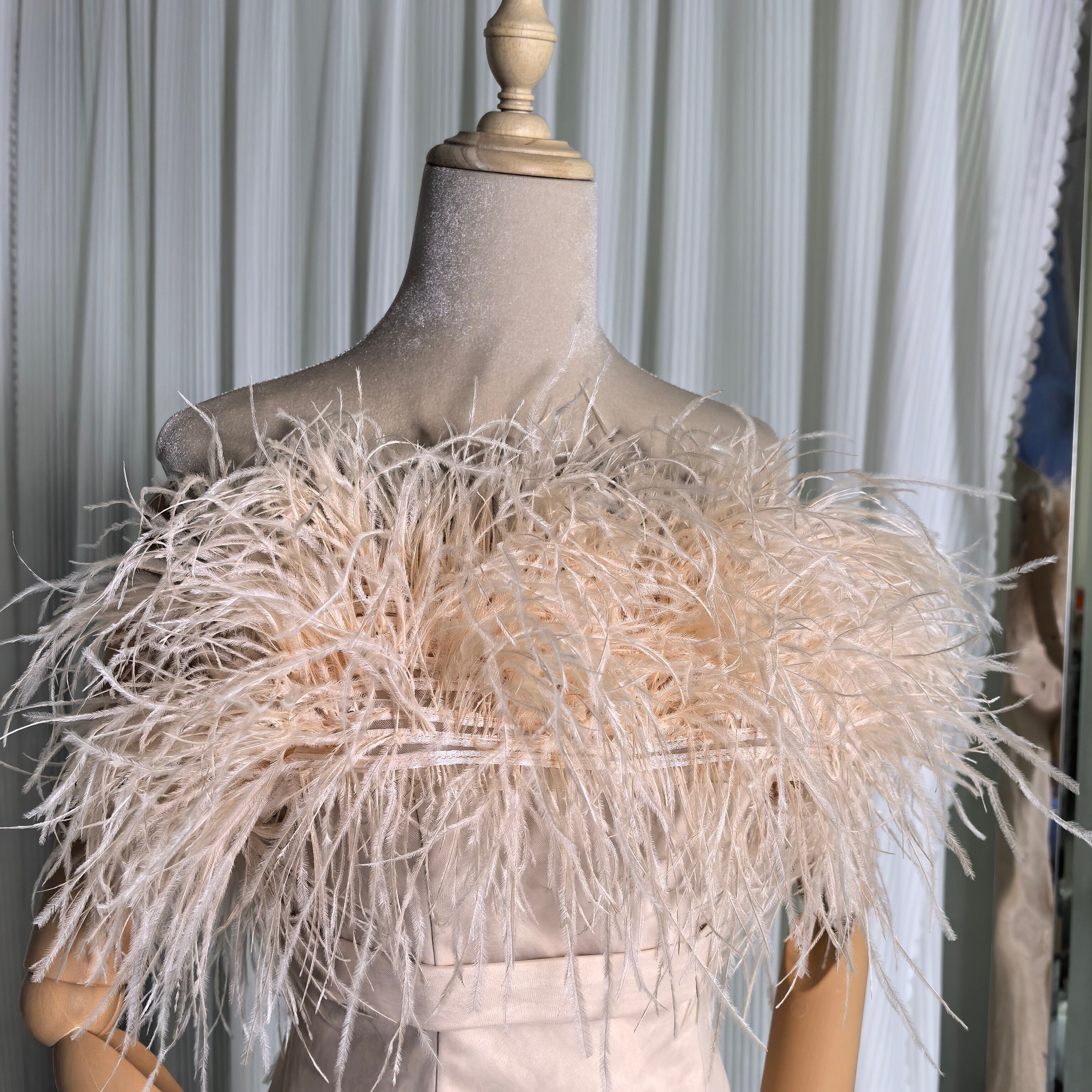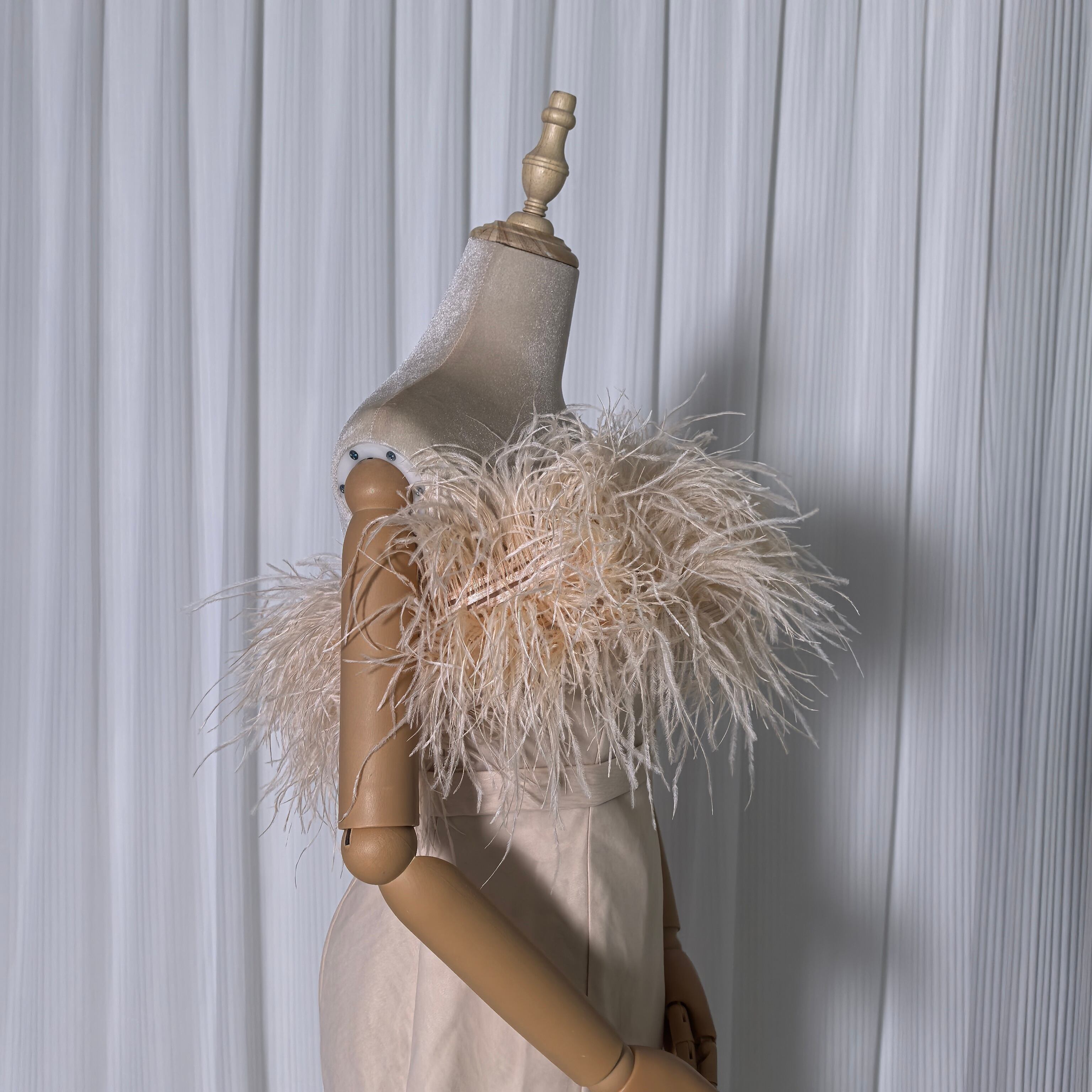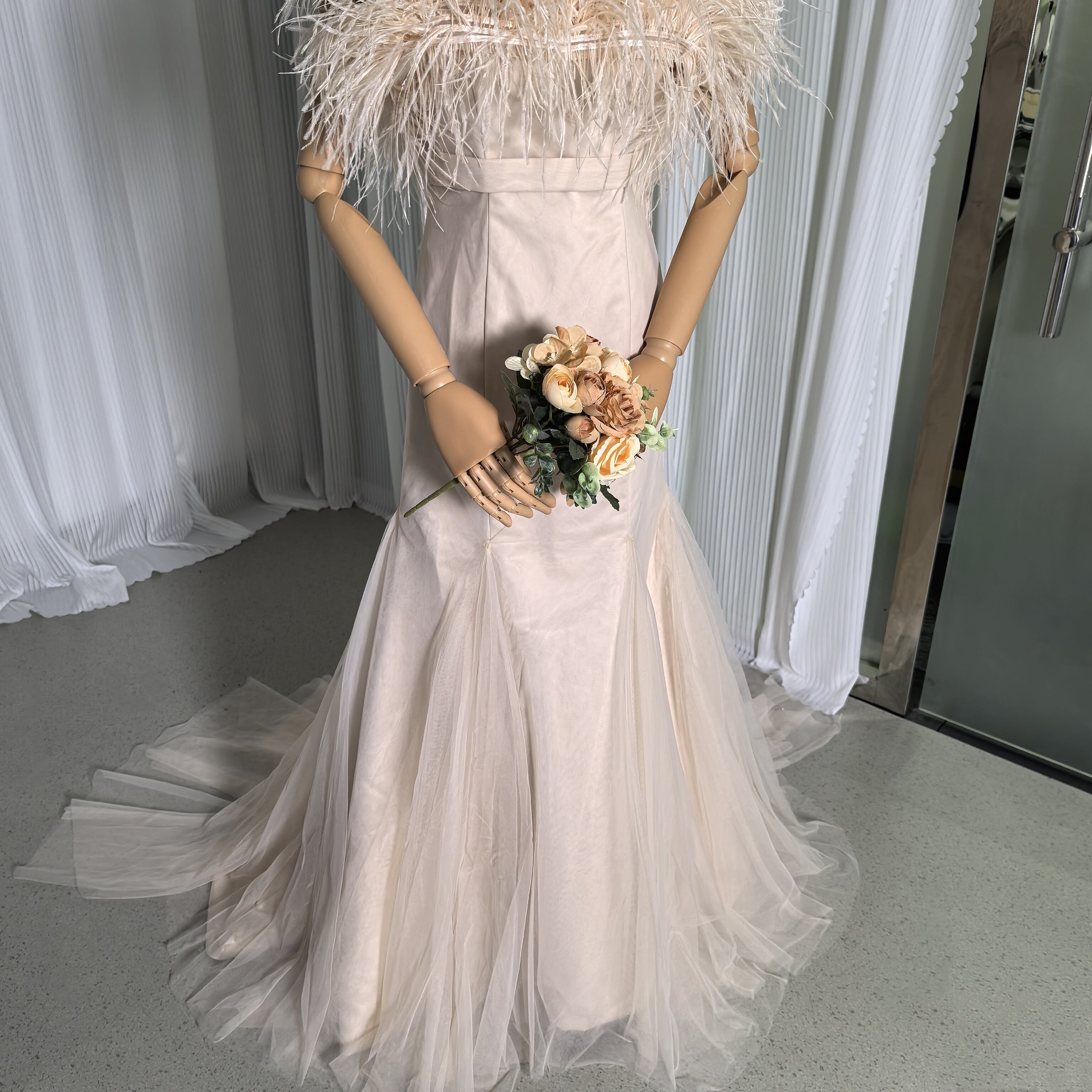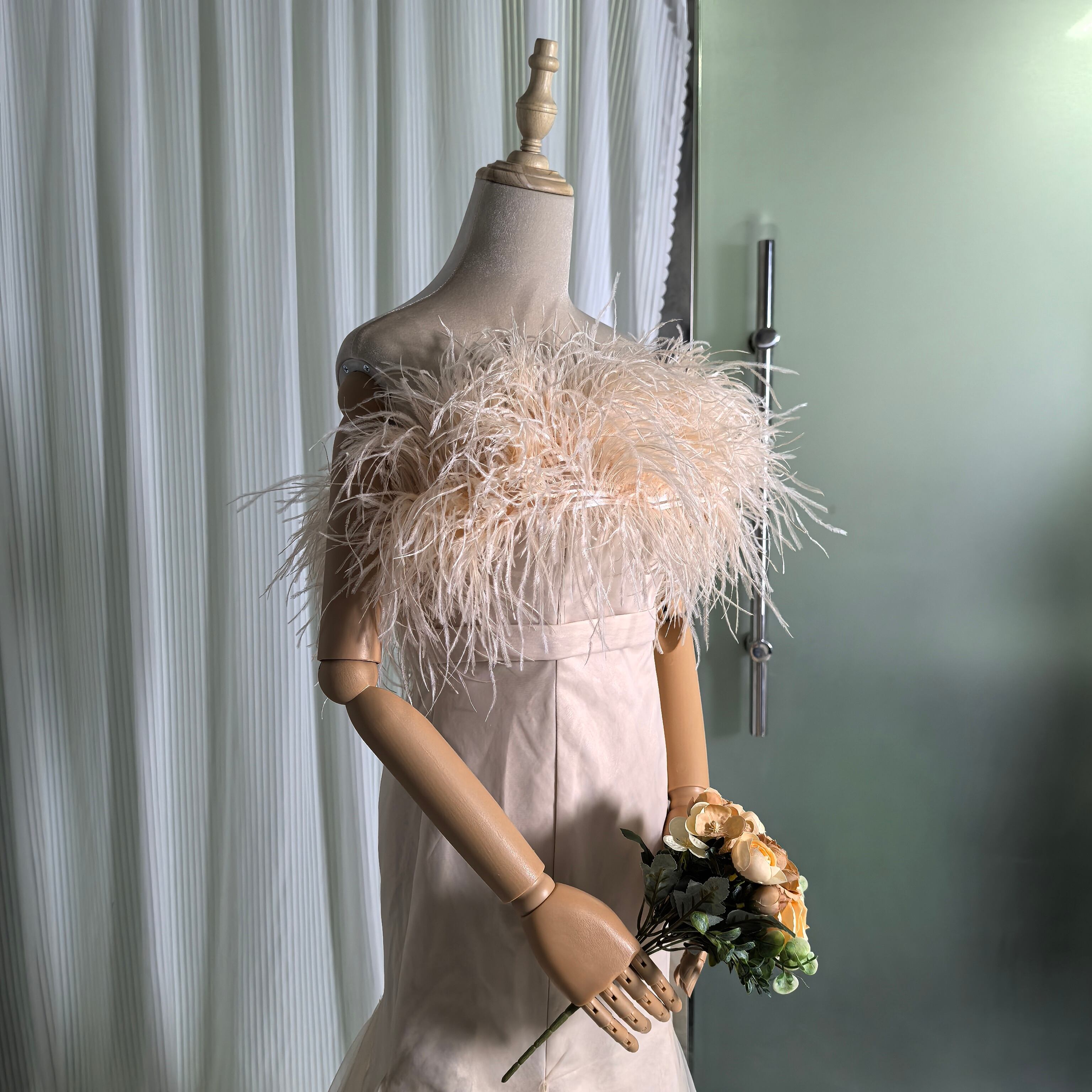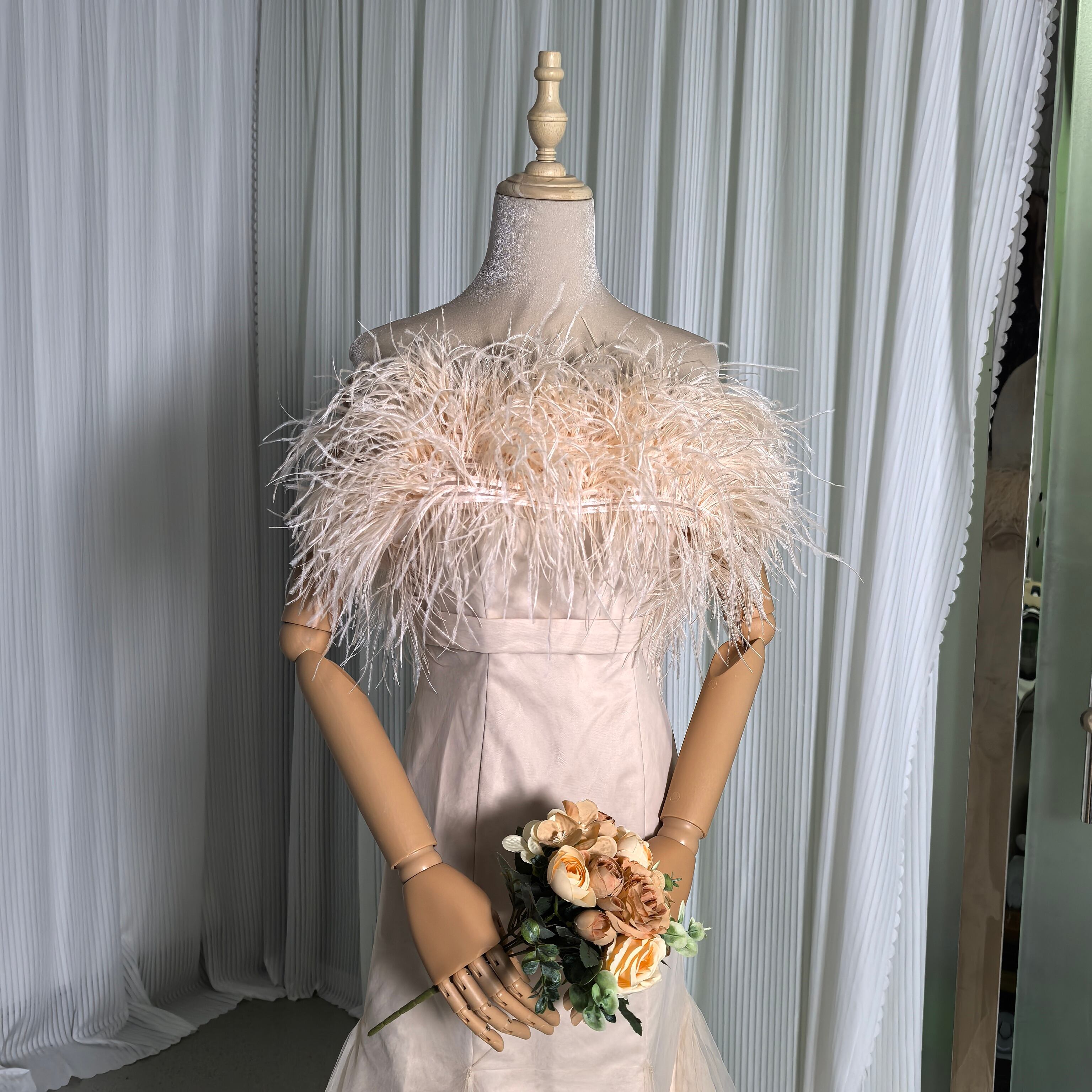 送料無料!薄ピンク カラードレス ファーフェザー オフショルダー ロングトレーン マーメイドパーティードレス 前撮り/花嫁