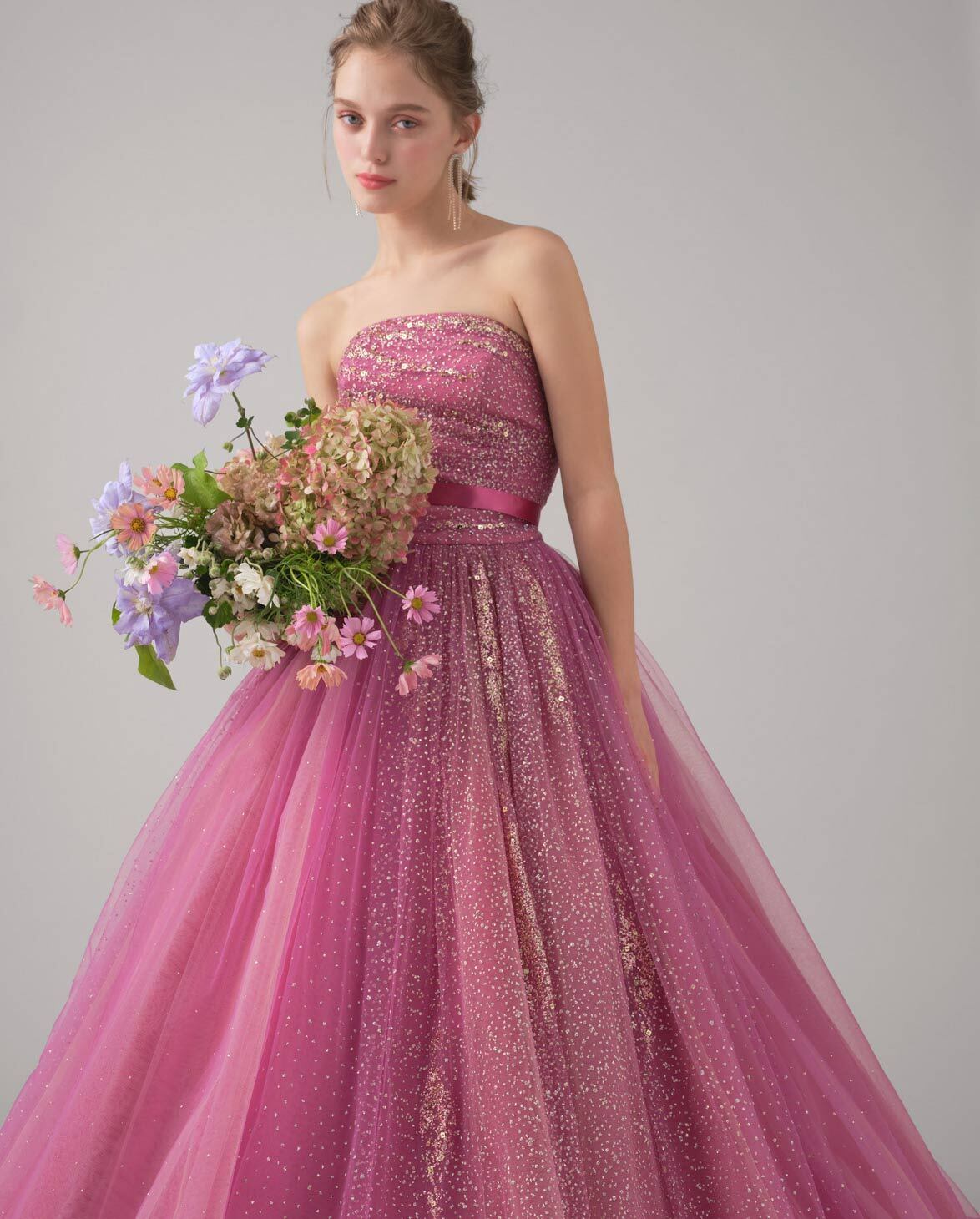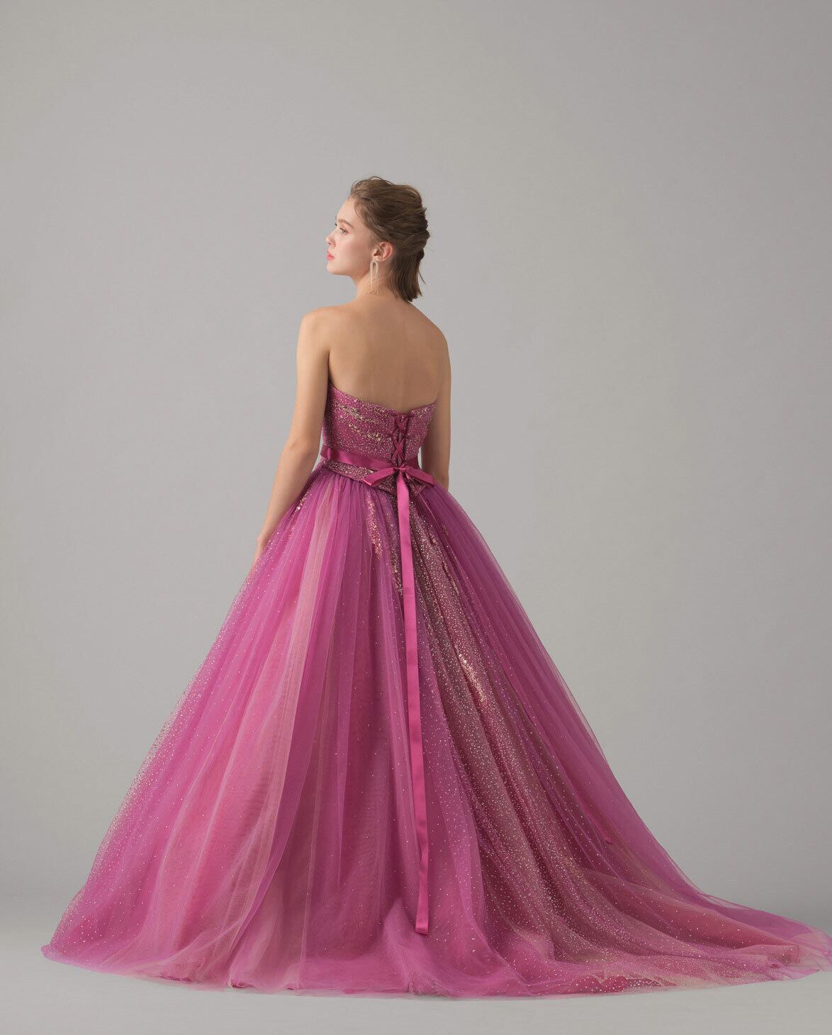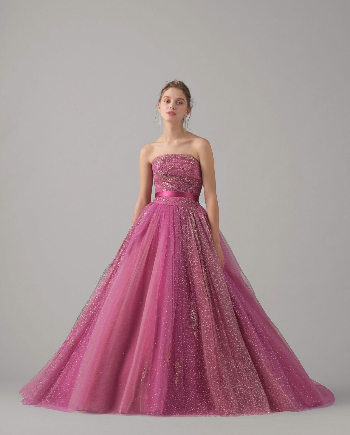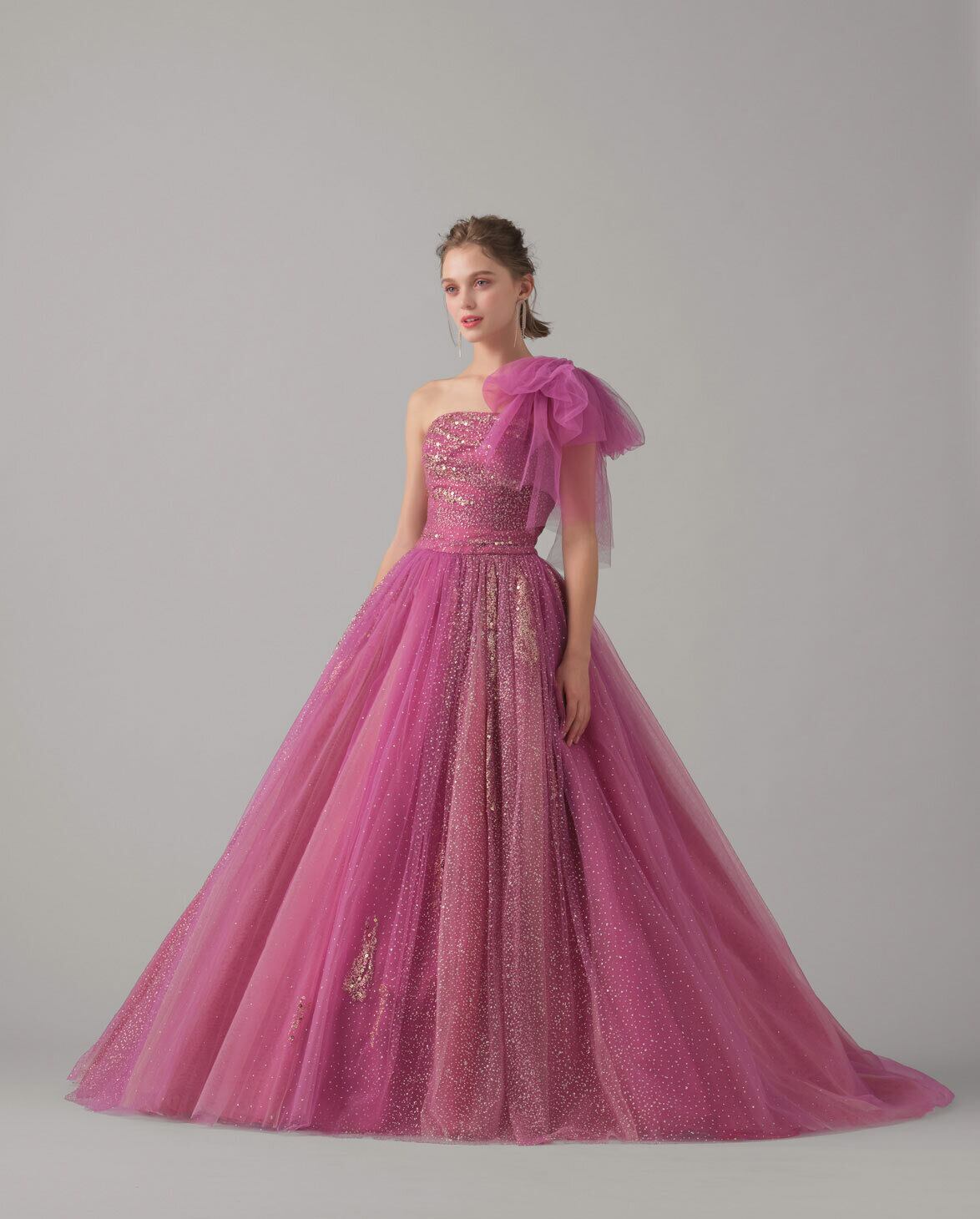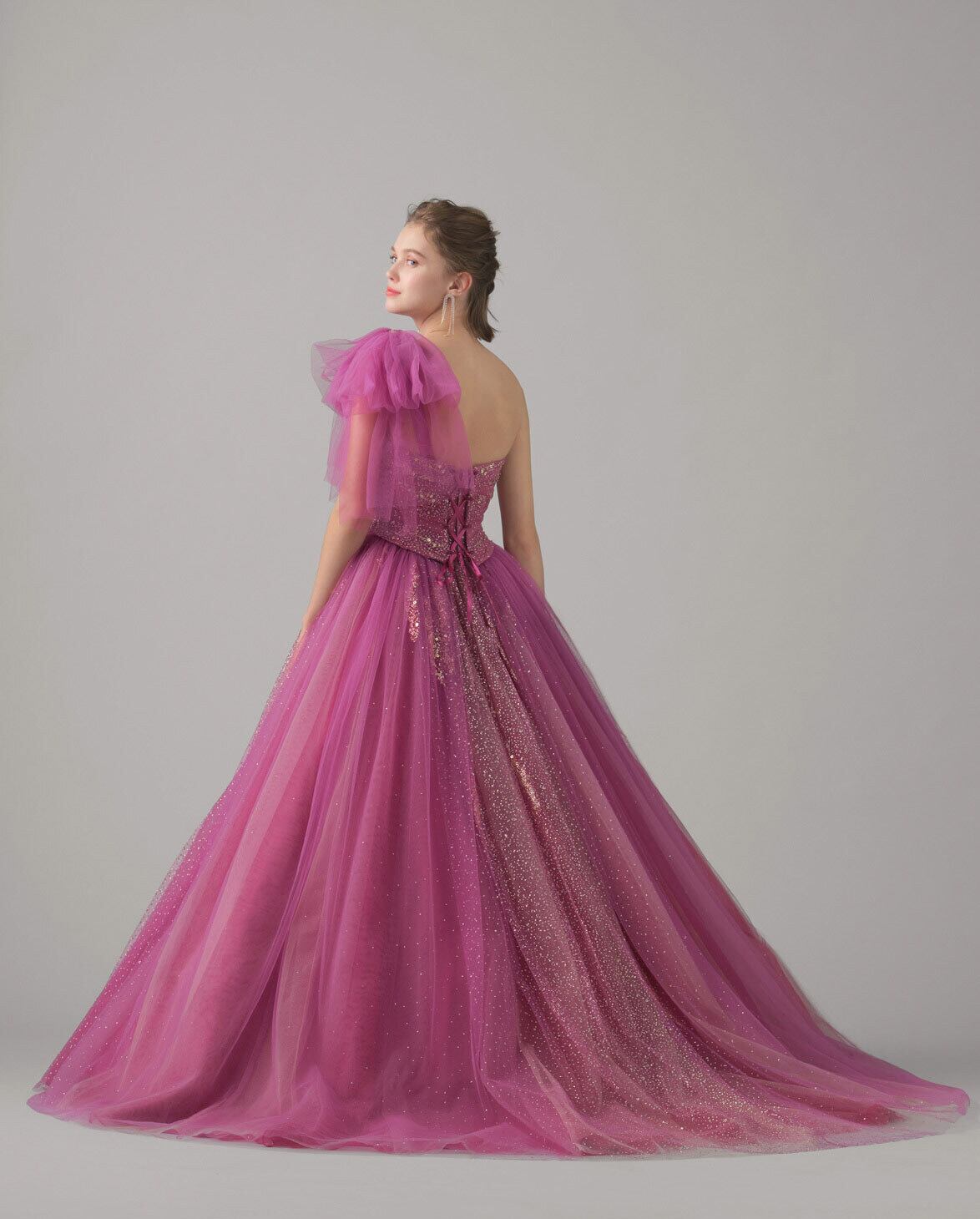 ゴージャス!ボリュームのあるワンショルダー カラードレス チェリーピンク オーロラ色 グリッターチュールドレス パーティードレス リボンストラップ/前撮り | David1021k Dress(ダヴィドレス)