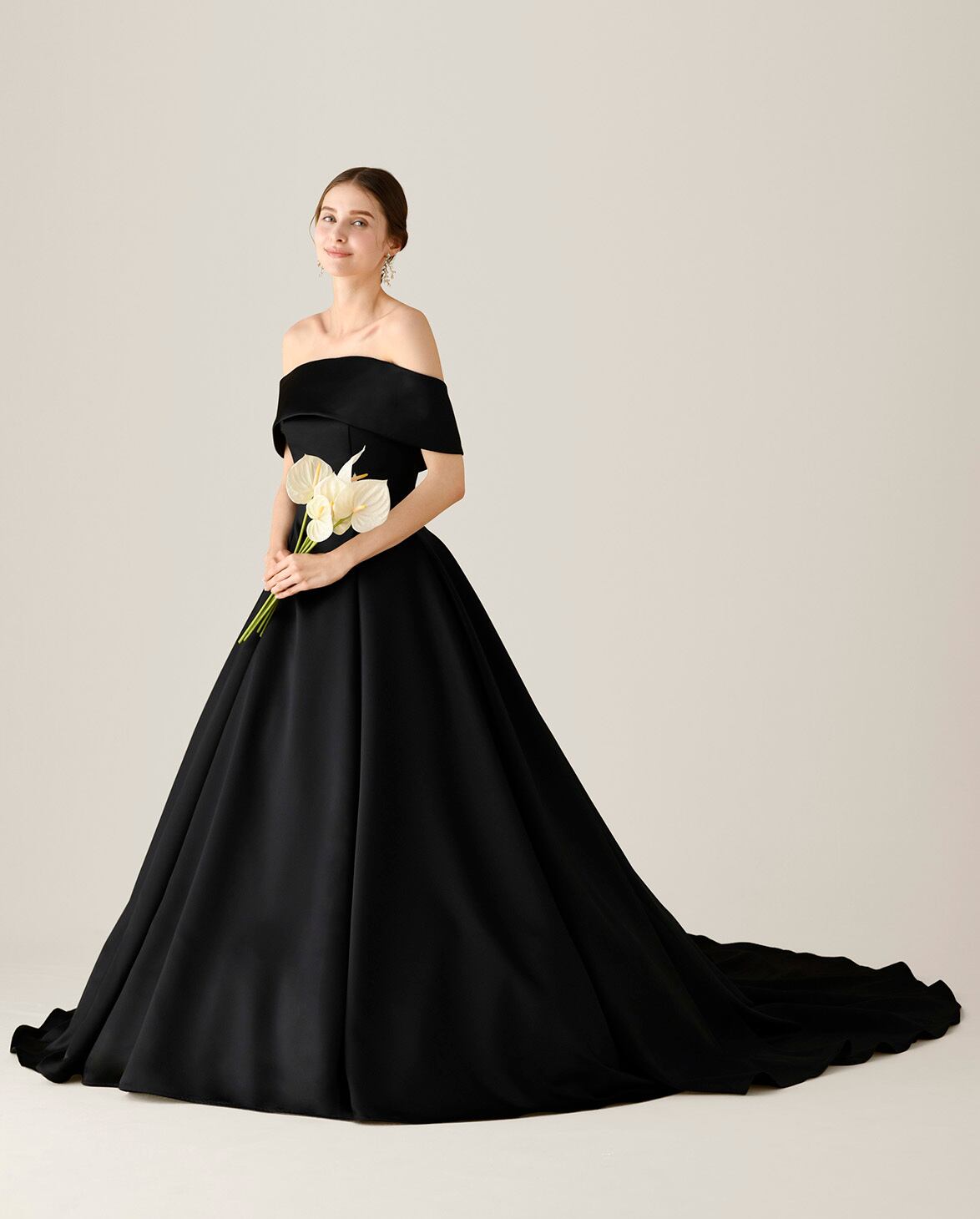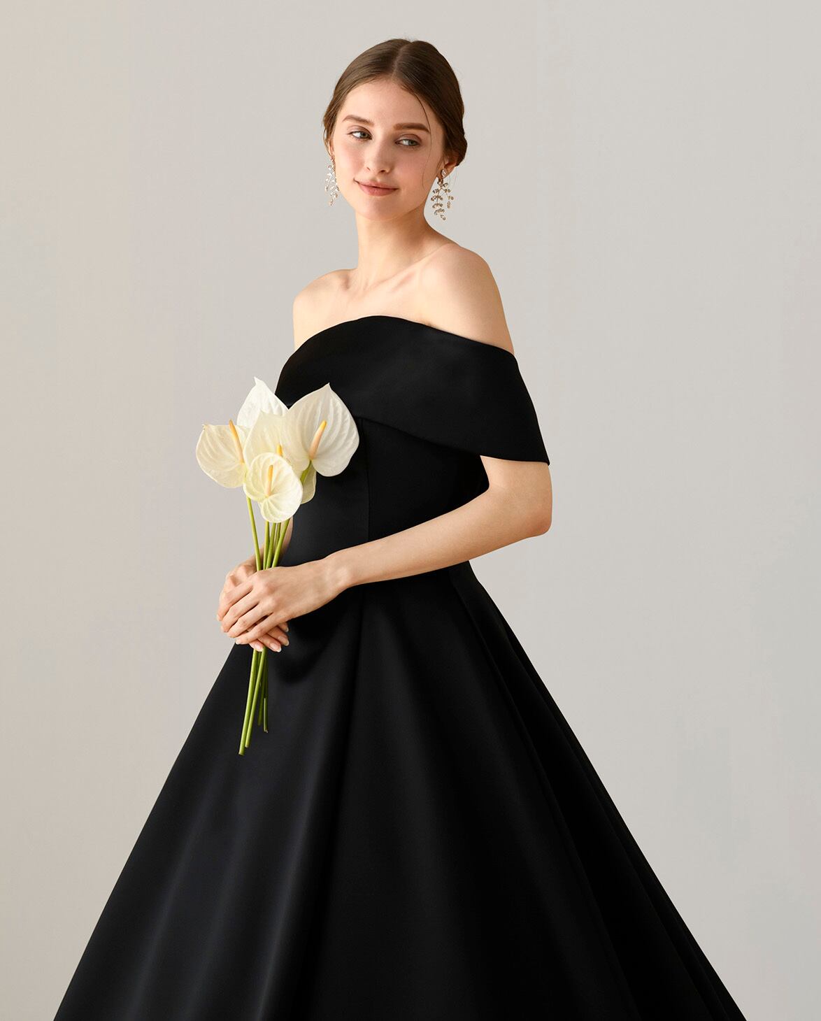 美品!大人気のカラードレス ブラック/黒 オフショルダー/ロールカラー 上品な光沢サテンドレス すっきりしたデコルテ パーティードレス 前撮り【色変更可能】 | David1021k Dress(ダヴィドレス)