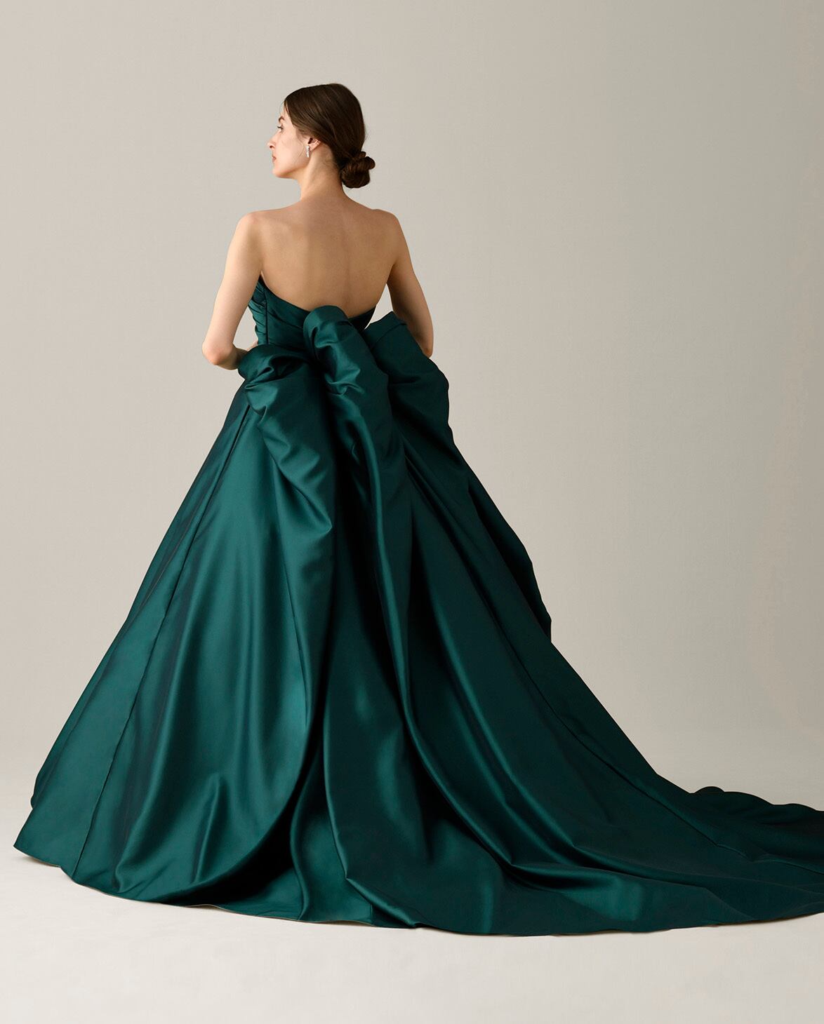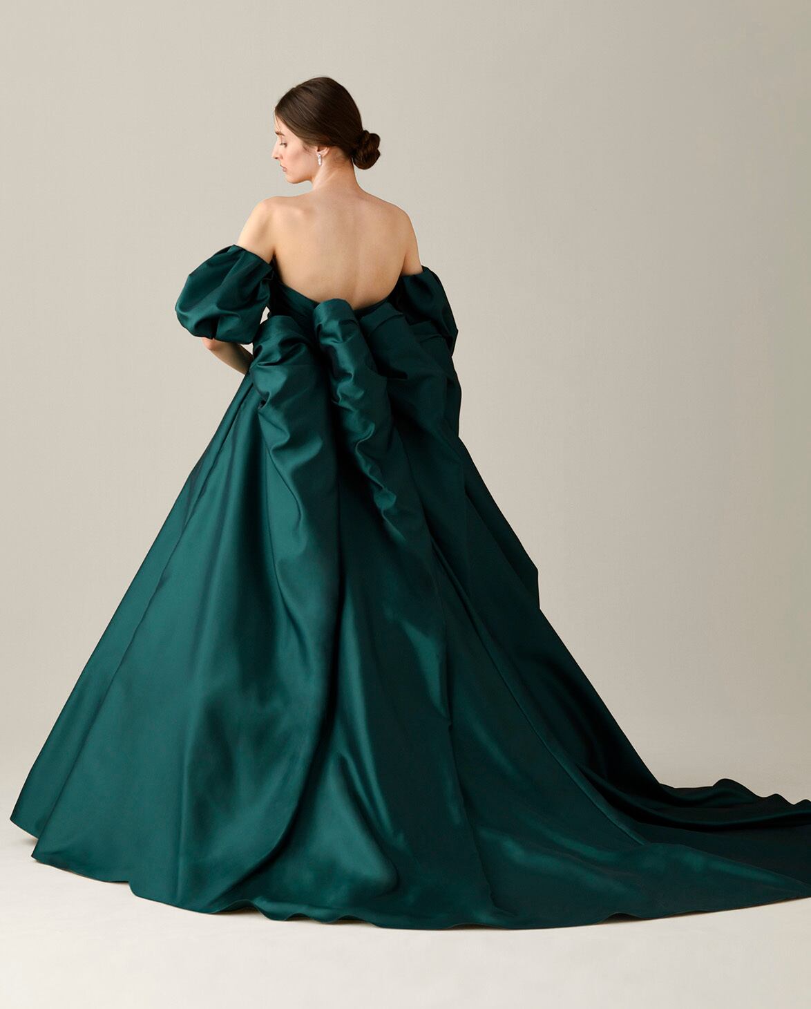 美品!大人気のカラードレス エメラルドグリーン ビスチェドレス パフスリーブ ビッグフリルトレーン パーティードレス 前撮り【色変更可能】