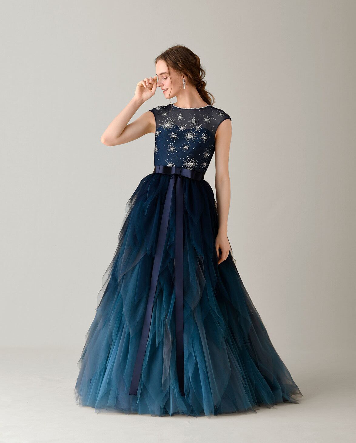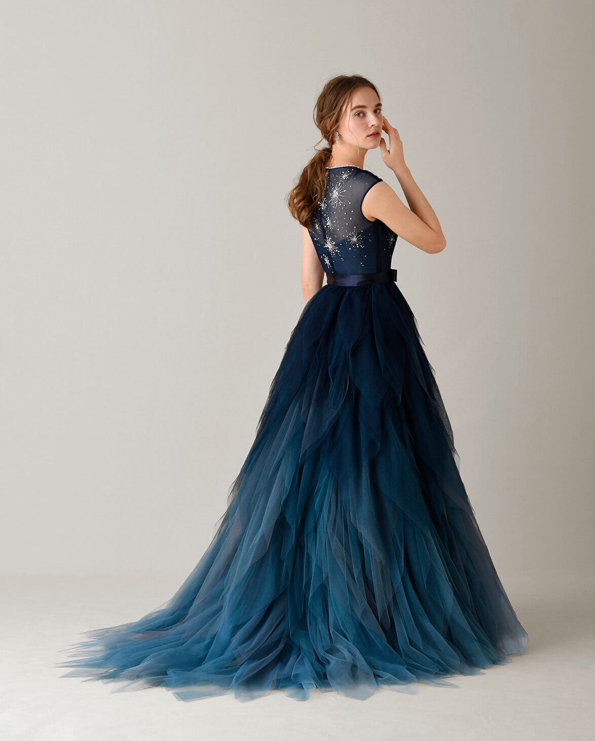 美品!ラッフルフリルドレス 夜空に輝く星をイメージしたカラードレス パーティードレス ブルー、エメラルドグリーン、グレーのグラデーション ナイトウエディング/前撮り | David1021k Dress(ダヴィドレス)