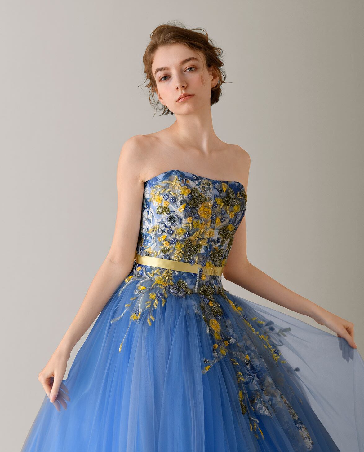 ラグジュアリー!映えるプリントレース インドビジュー 青色カラードレス ブルー パーティードレス ボリュームたっぷりなスカート レモンイエローのウエストリボン/前撮り | David1021k Dress(ダヴィドレス)
