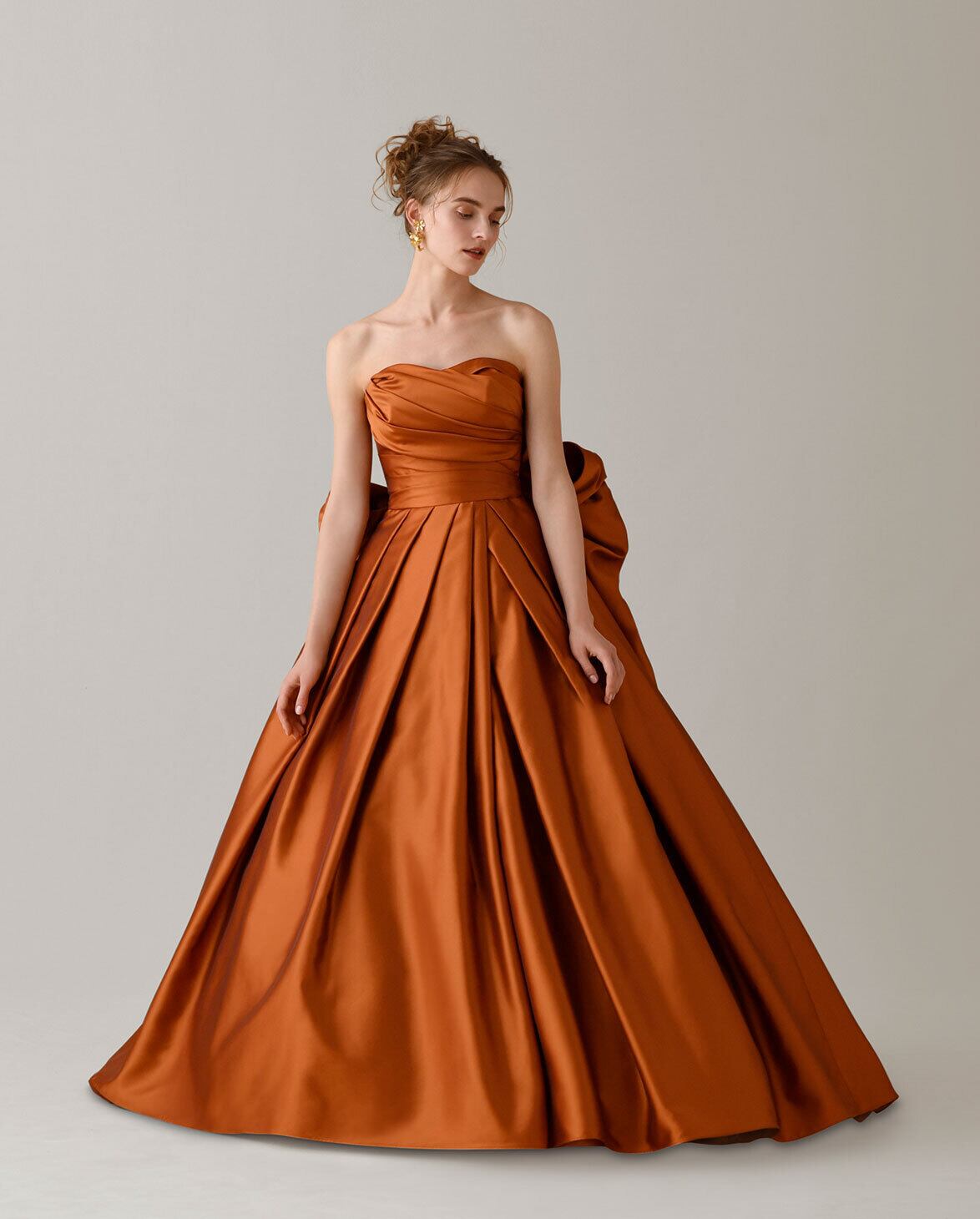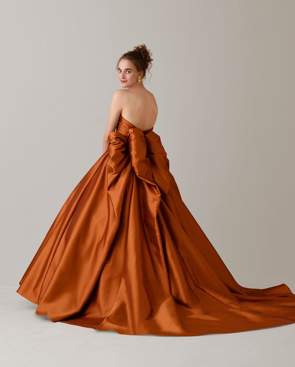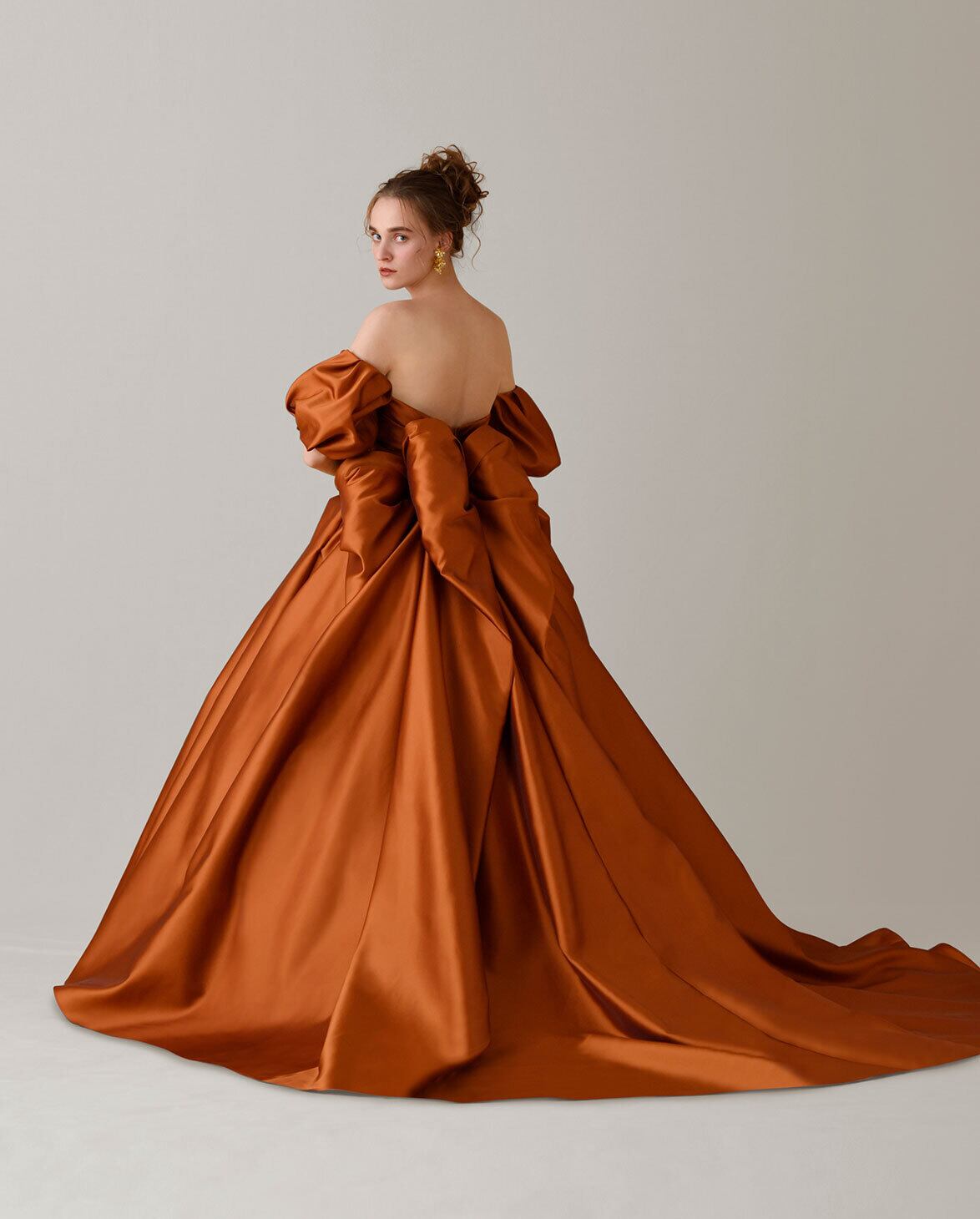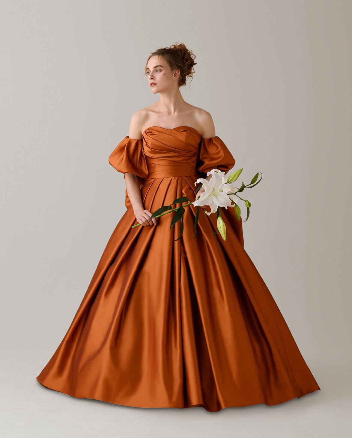 上品!深みのあるテラコッタカラー カラードレス キュートなパフスリーブ パーティードレス 優美なデコルテライン バックフリル 前撮り/二次会