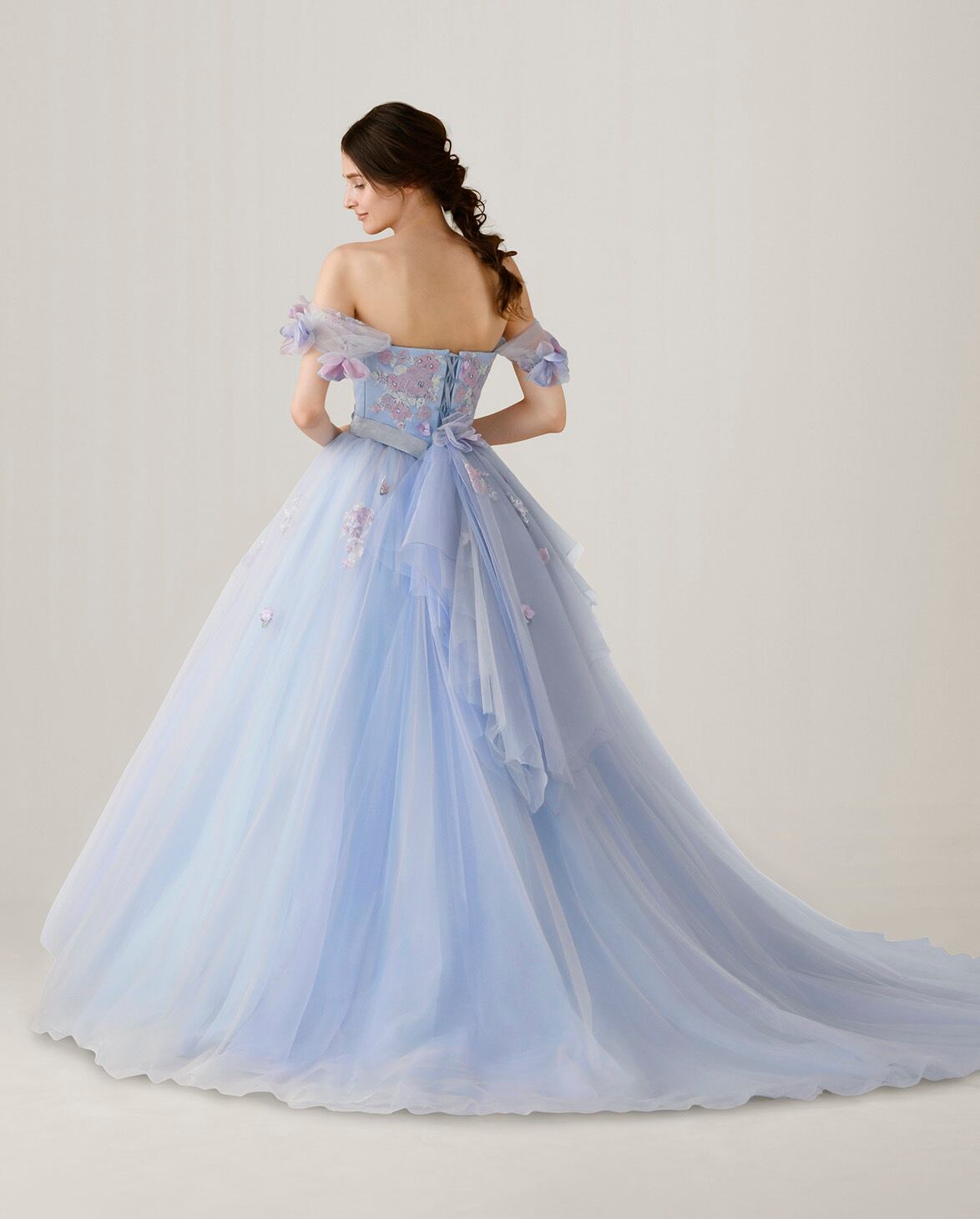 美品!立体的な3Dフラワー 水色カラードレス ゼニスブルー/スカイブルー オフショルダー パーティードレス 可憐なバックスタイル デコルテライン 前撮り | David1021k Dress(ダヴィドレス)