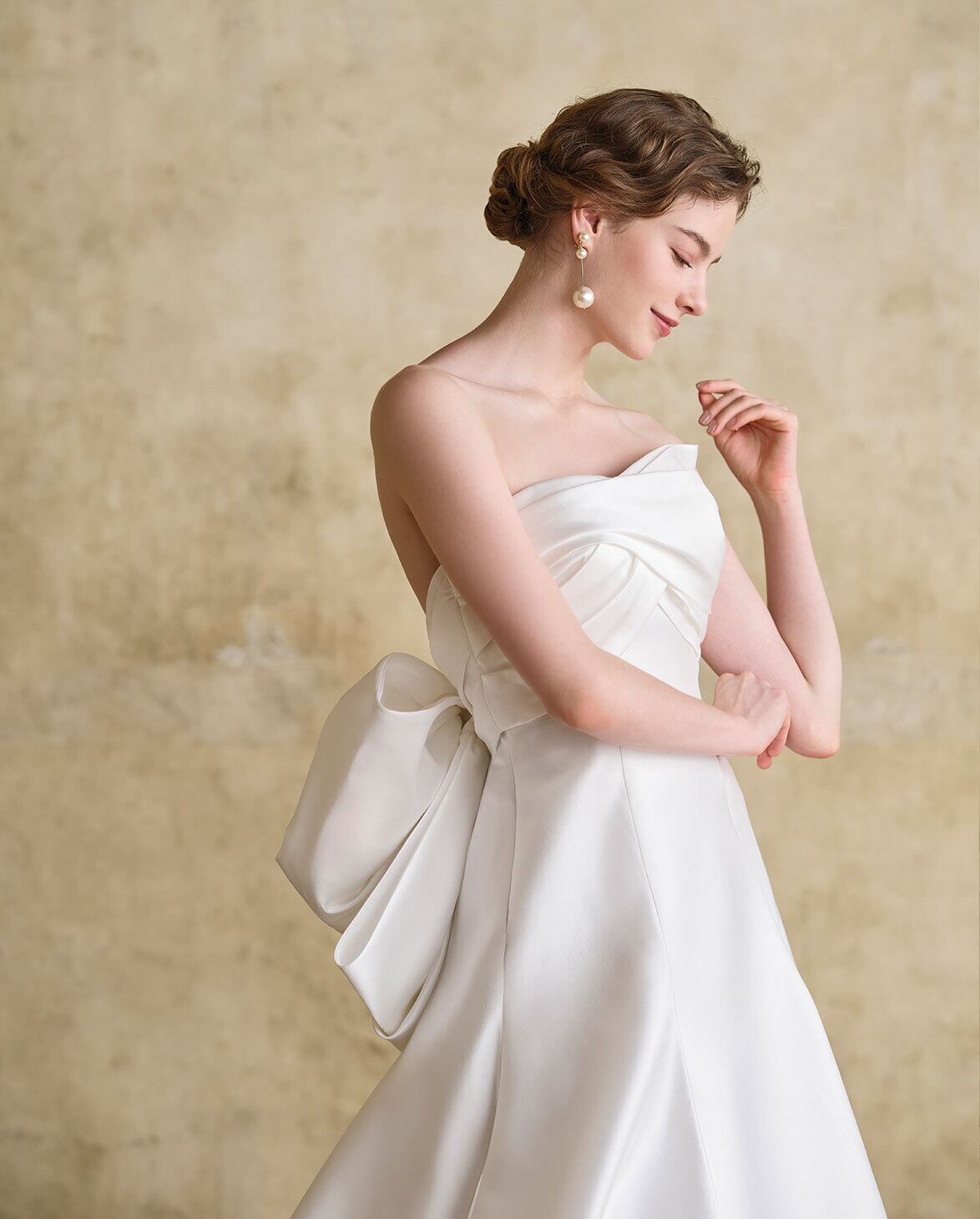 美品!フレアのスカート 軽やかなウエディングドレス 上品な光沢をもつミカドシルク 美しいシルエット 幅広のケープとバックリボン 前撮り/オーダーメイド! | David1021k Dress(ダヴィドレス)
