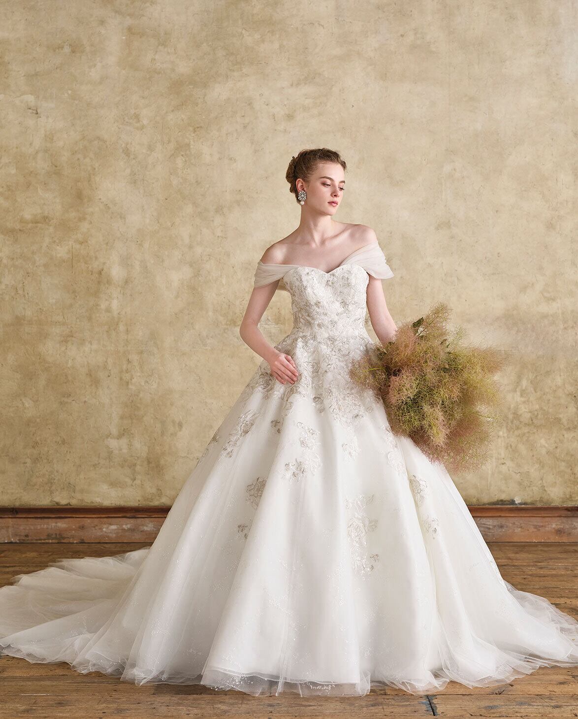 美品!贅沢な花モチーフ刺繡 スパコール 軽やかなウエディングドレス シルバー糸 ふんわりと広がるスカート 美しいシルエット オフショルダードレス 前撮り/オーダーメイド! | David1021k Dress(ダヴィドレス)