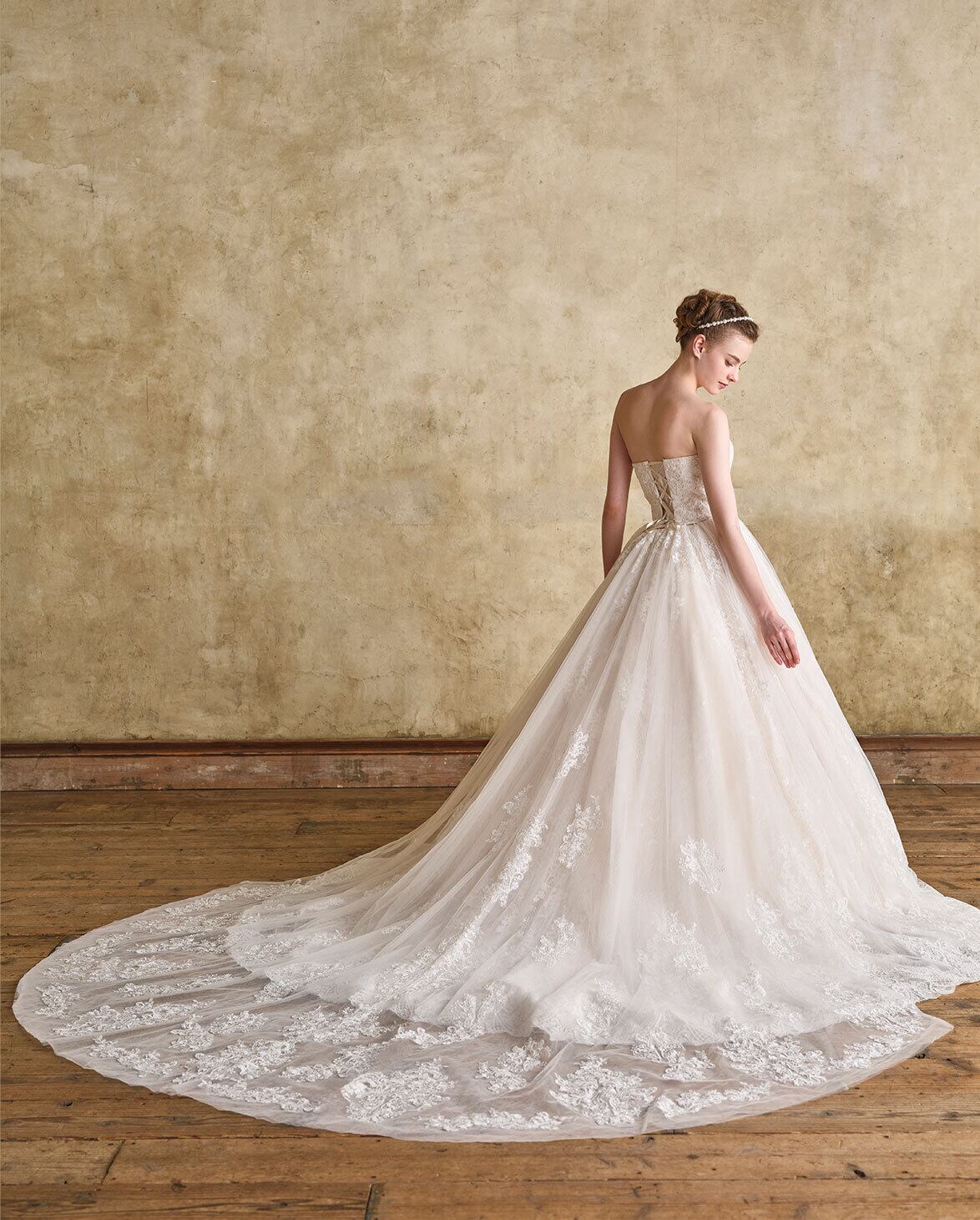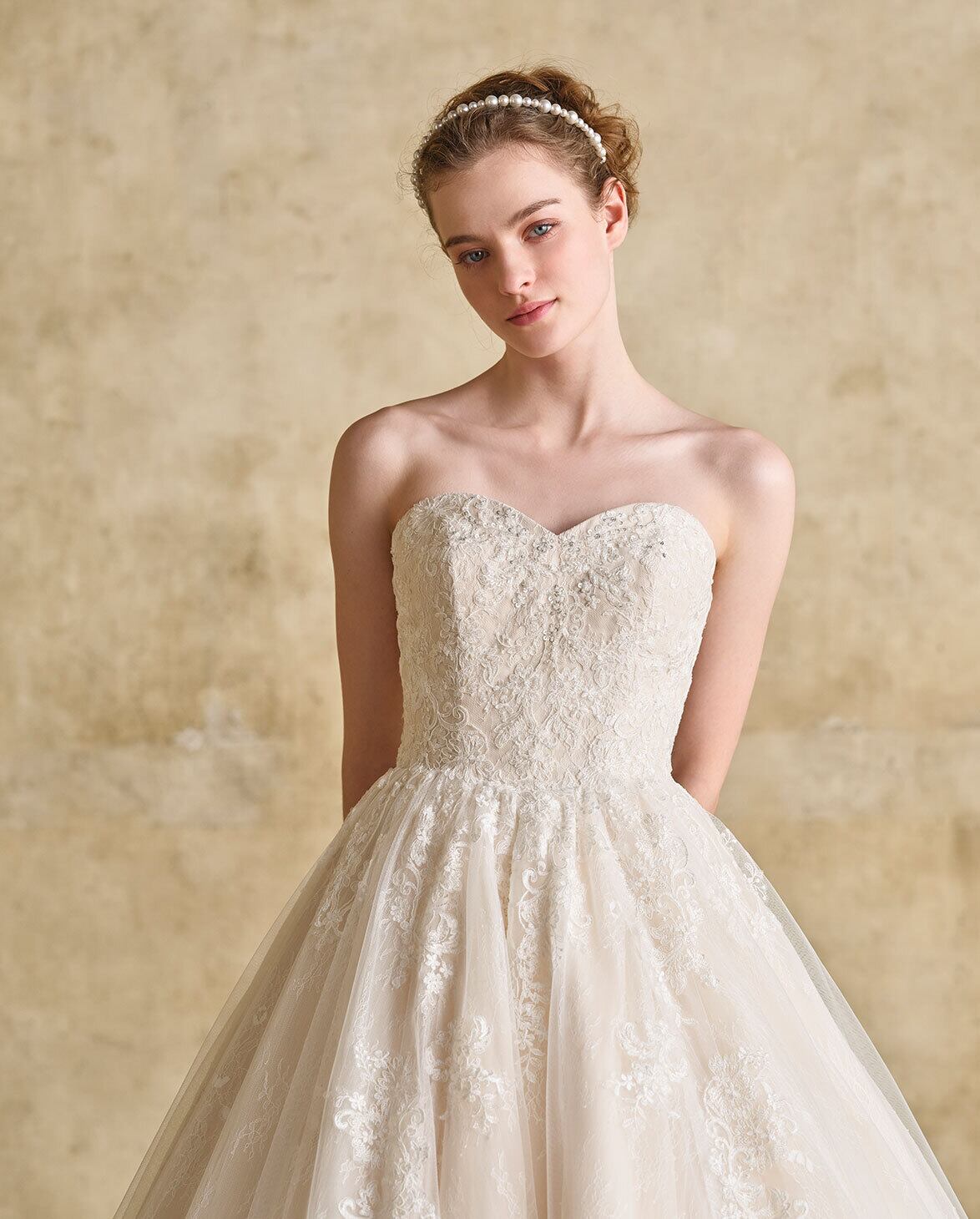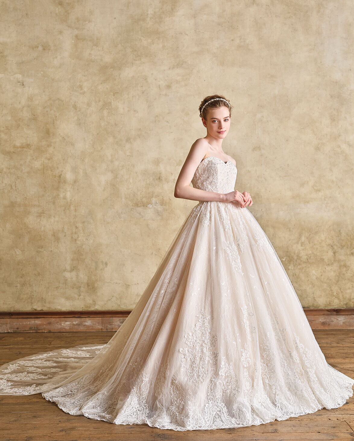 美品!繊細花レースドレス 贅沢な花モチーフ刺繡 ハートネック ベージュ色ウエディングドレス ロングトレーン プリンセスライン 美しいシルエット 前撮り | David1021k Dress(ダヴィドレス)