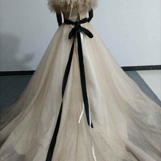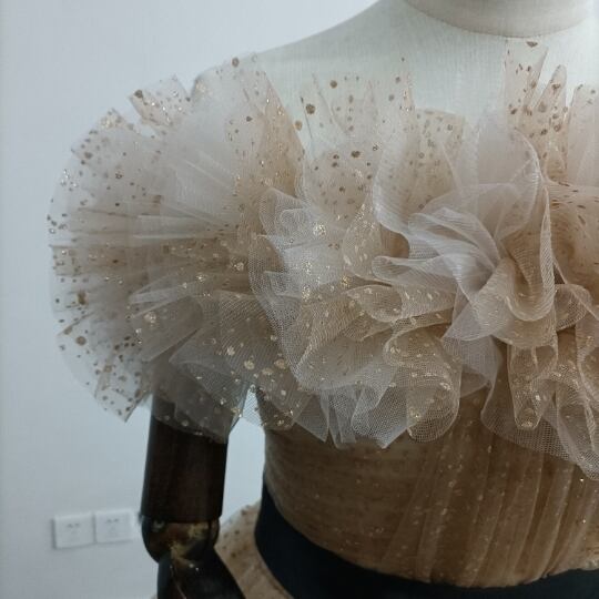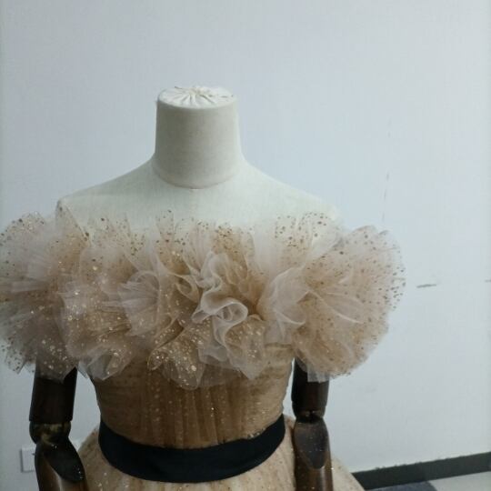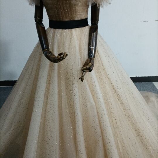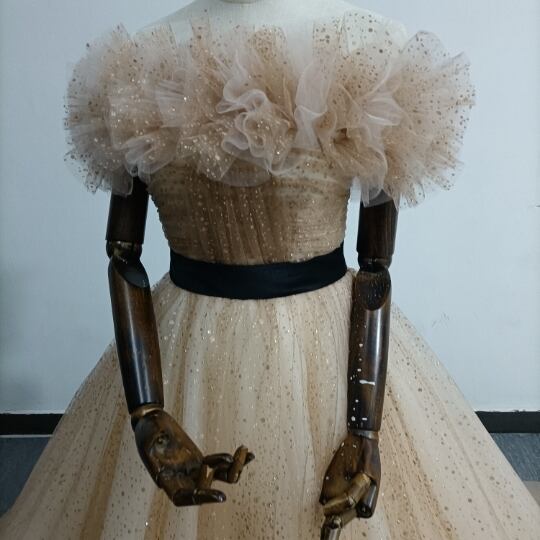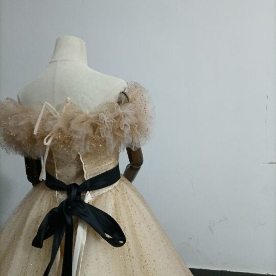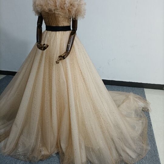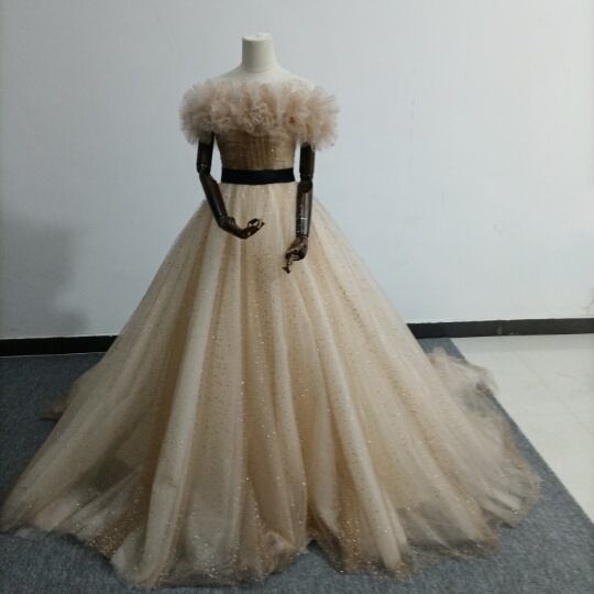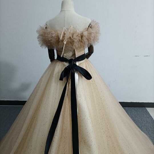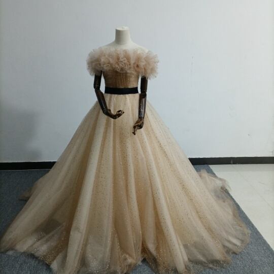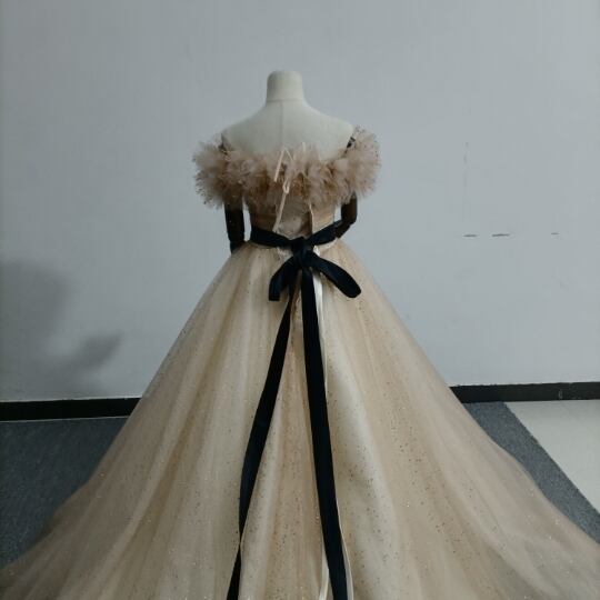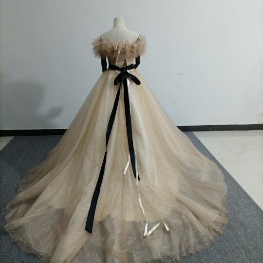 高品質! カラードレスシャンパン色 ソフトチュール ロングトレーン 取り外しオフショルダー 結婚式/披露宴 二次会