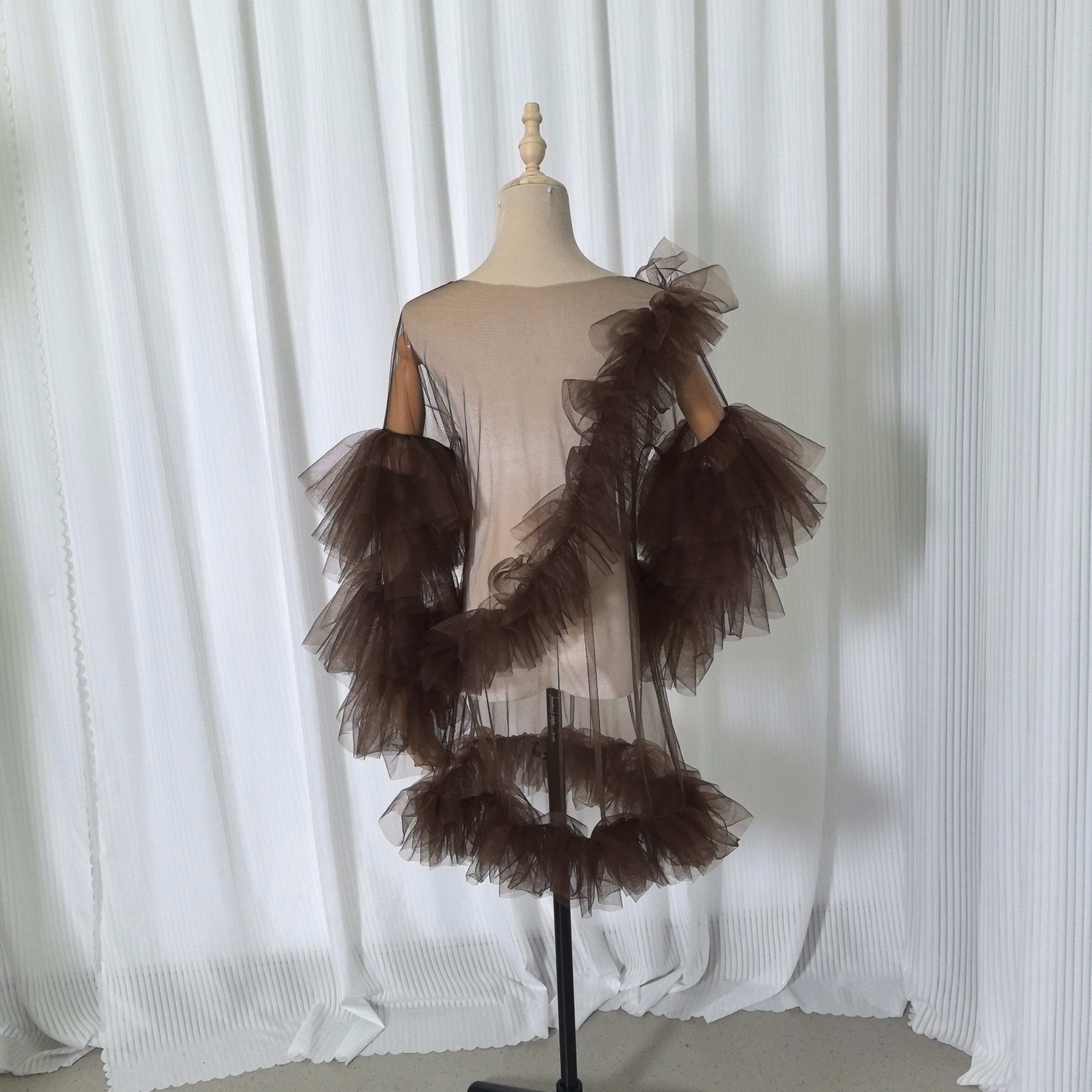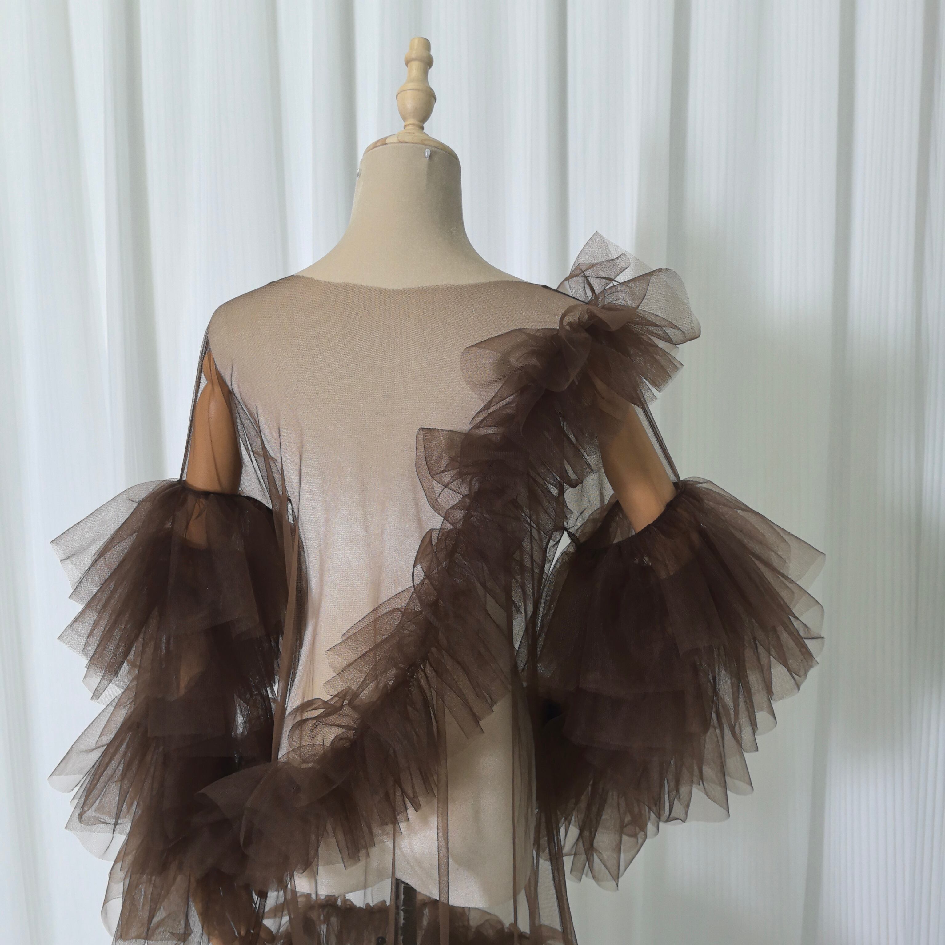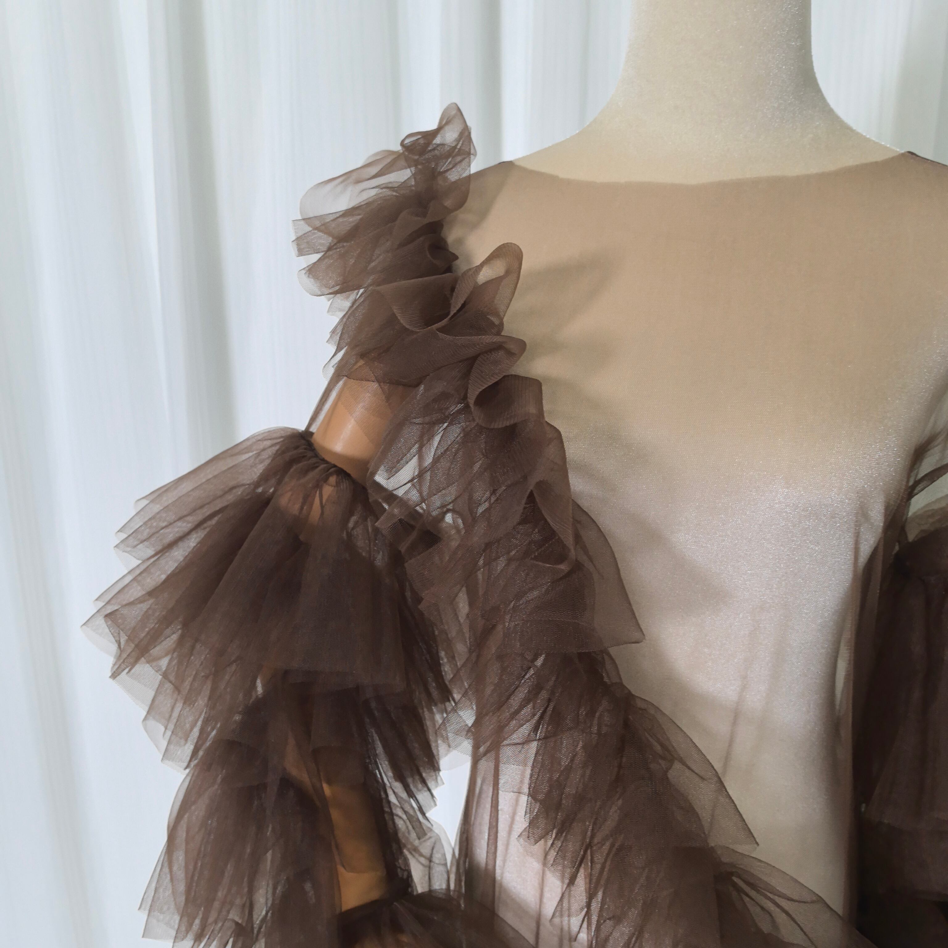 送料無料!コーヒーの色 抜群のおしゃれ見えカーディガン(ボレロ) ソフトチュール ラッフルフリルトップス 前撮り