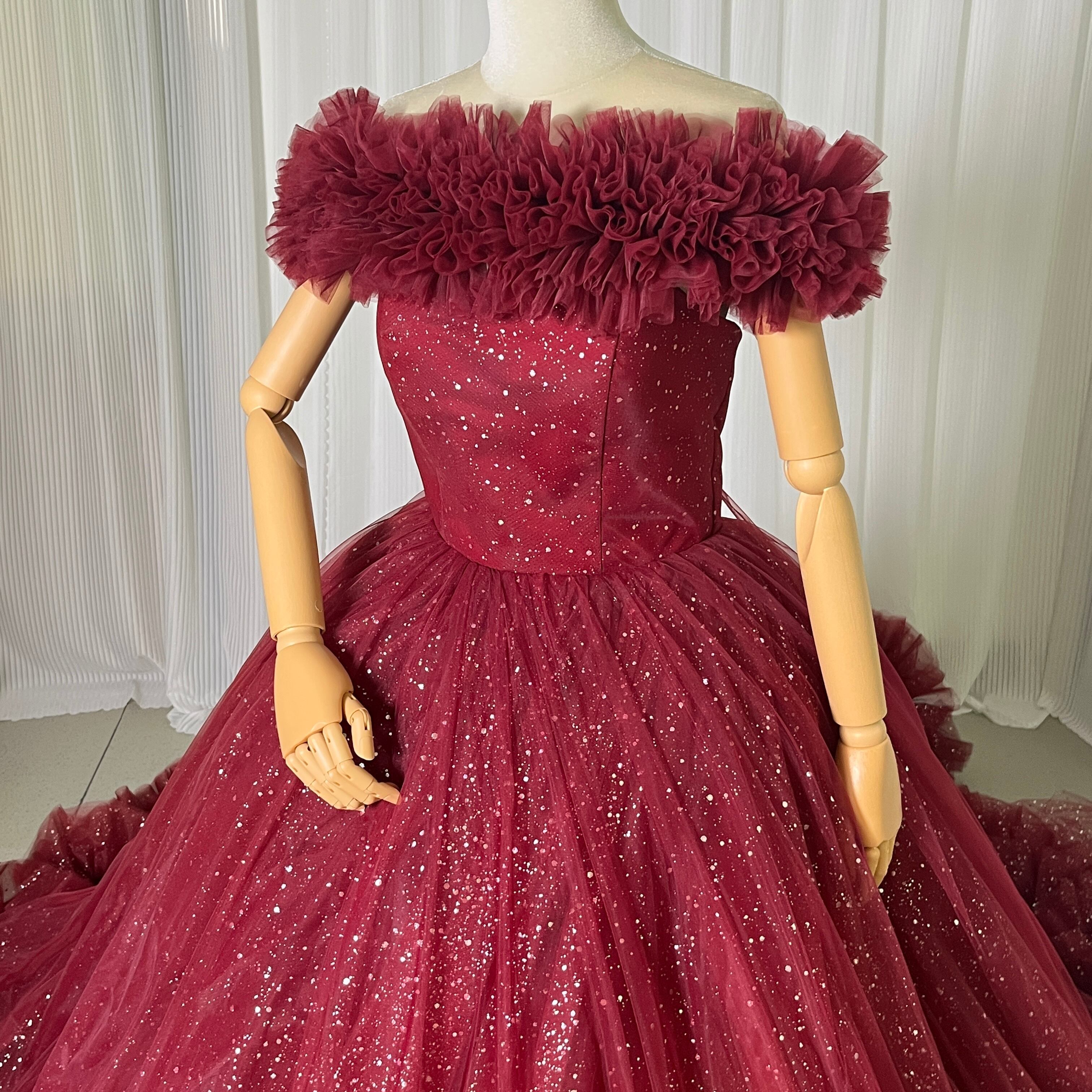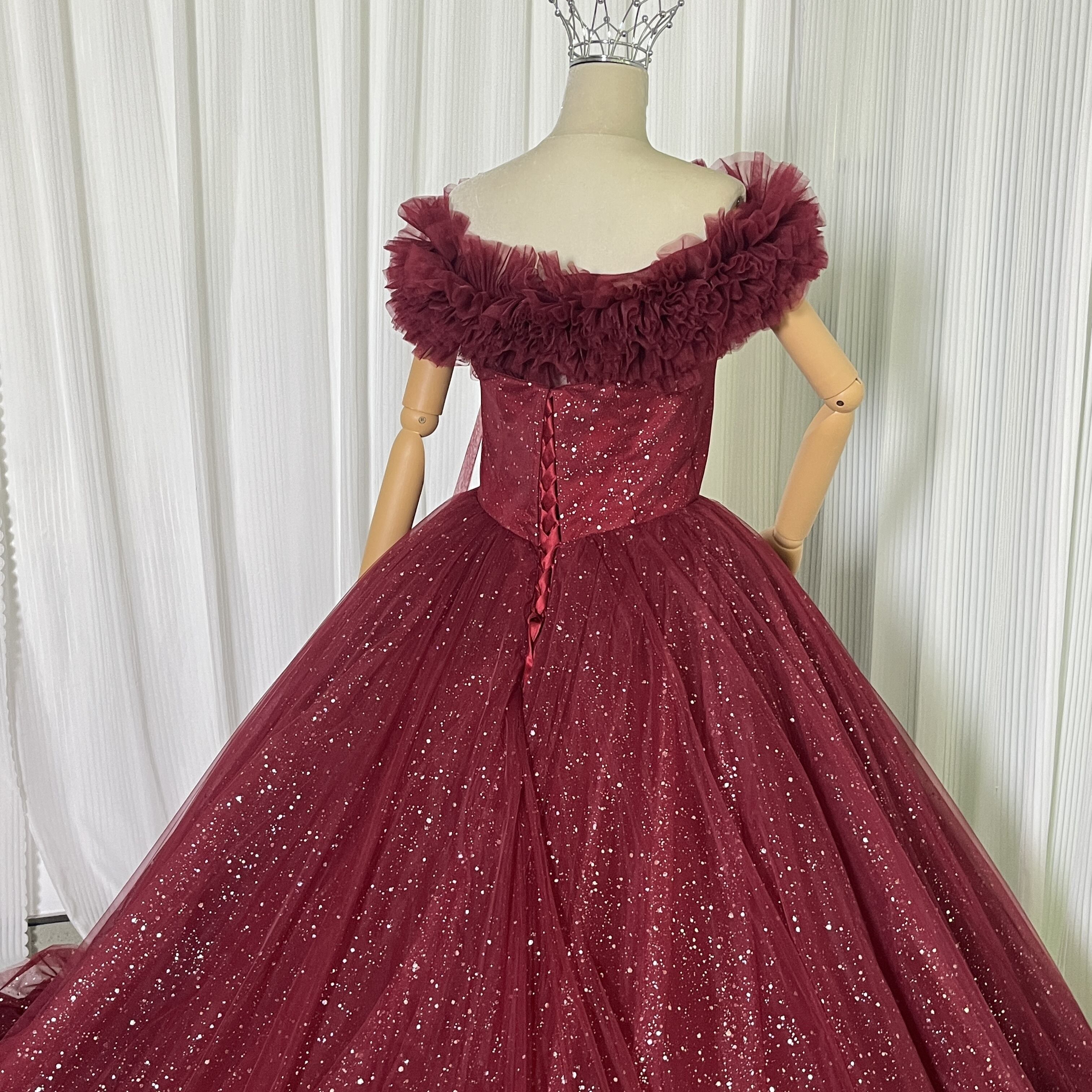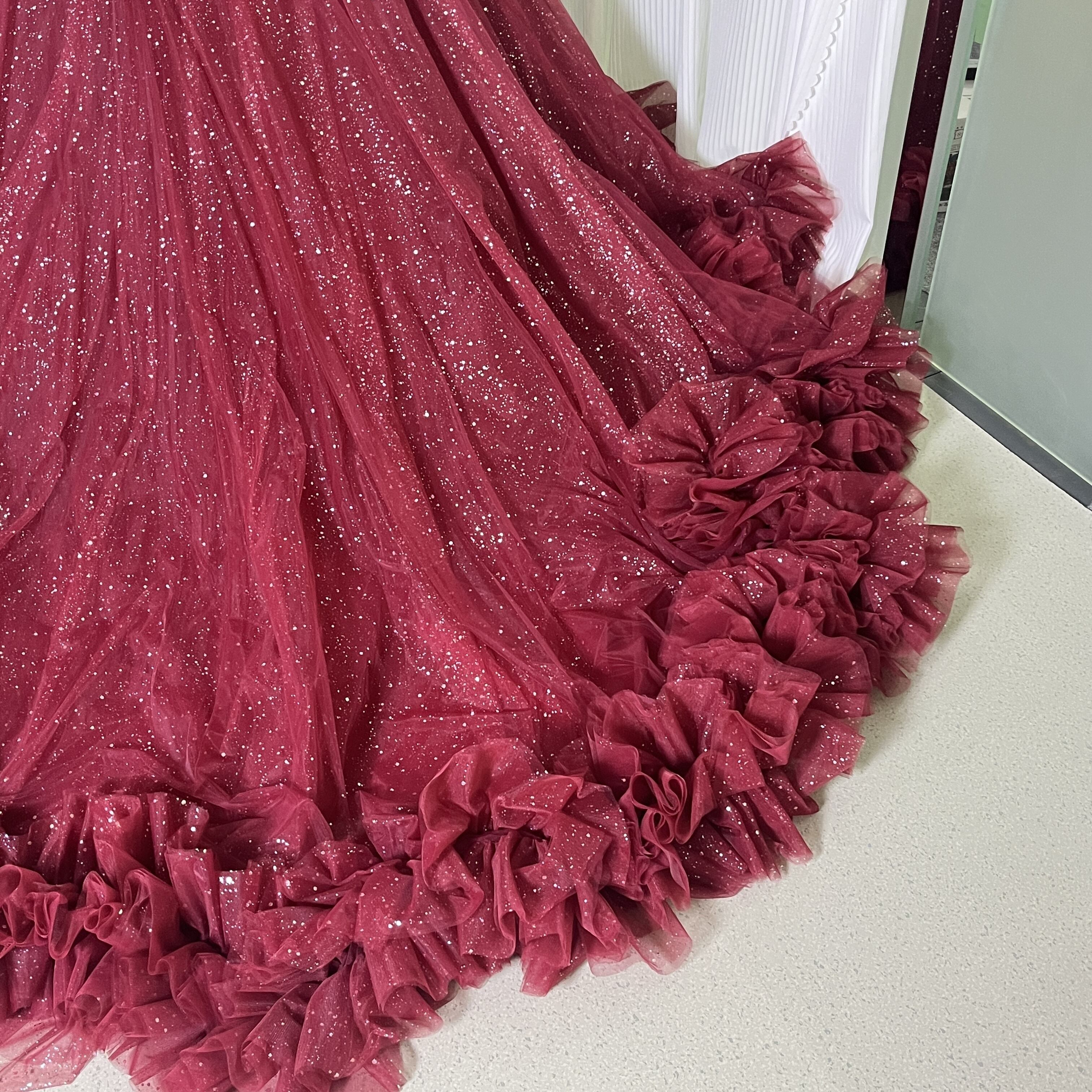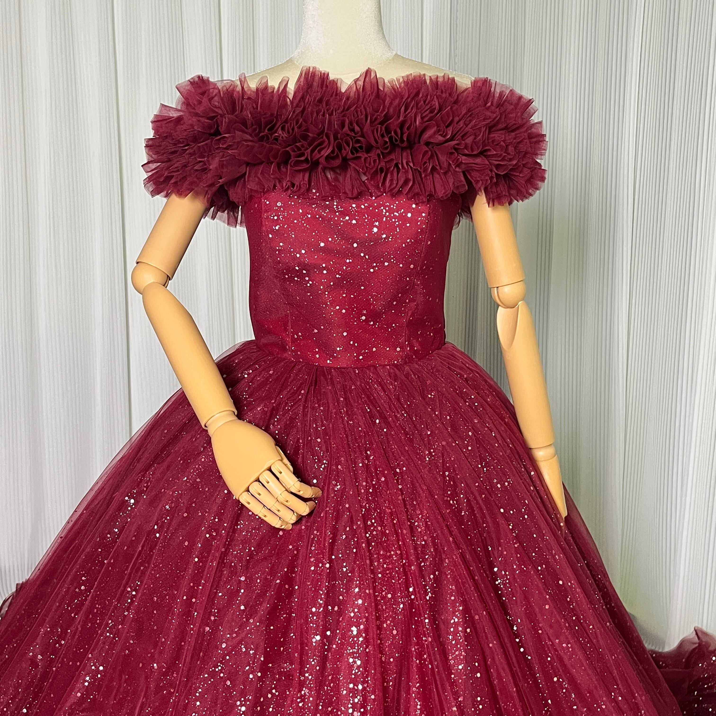 ワインレッド カラードレス 取り外しオフショルダー キラキラチュール パーティードレス 優美なデコルテライン バックフリル 前撮り/二次会