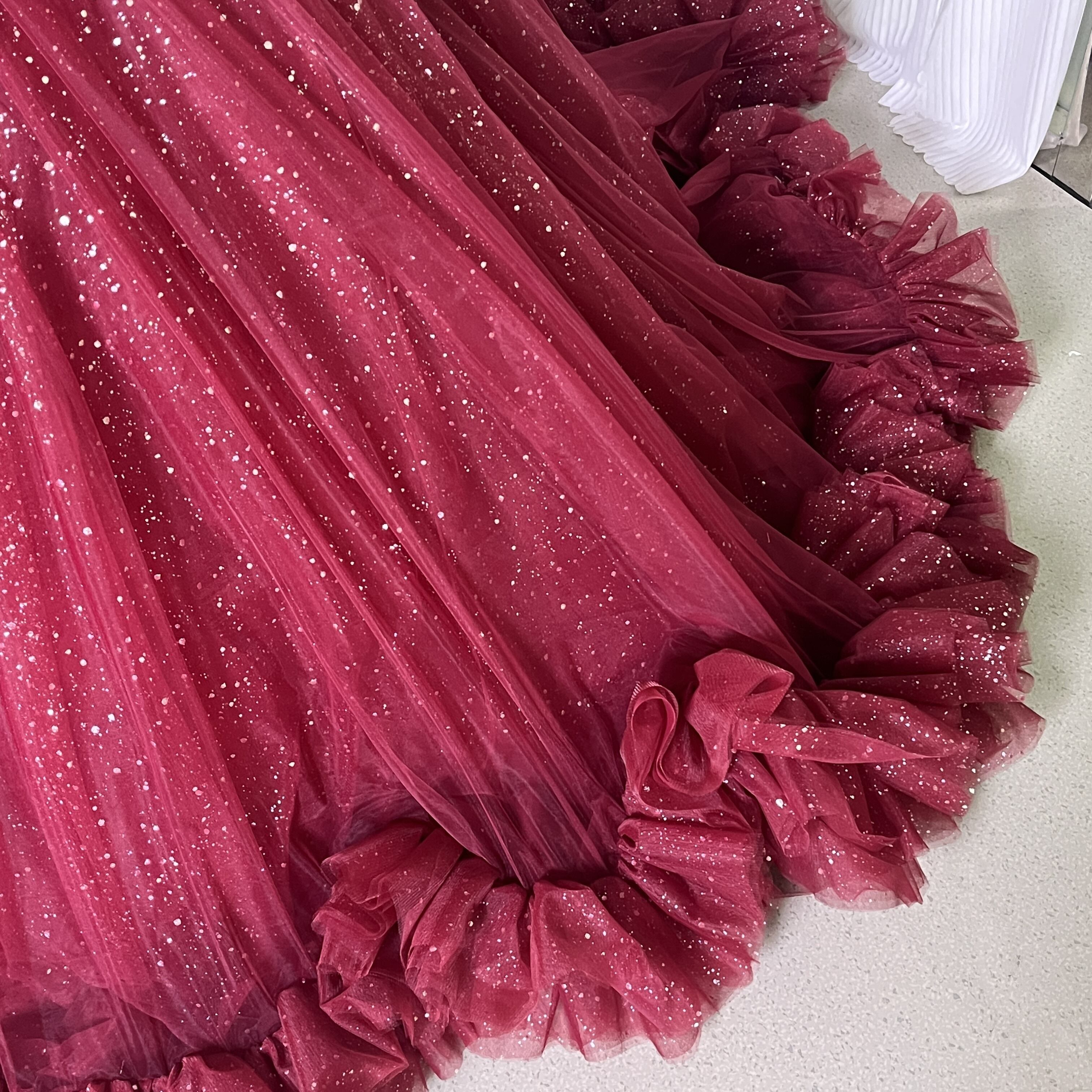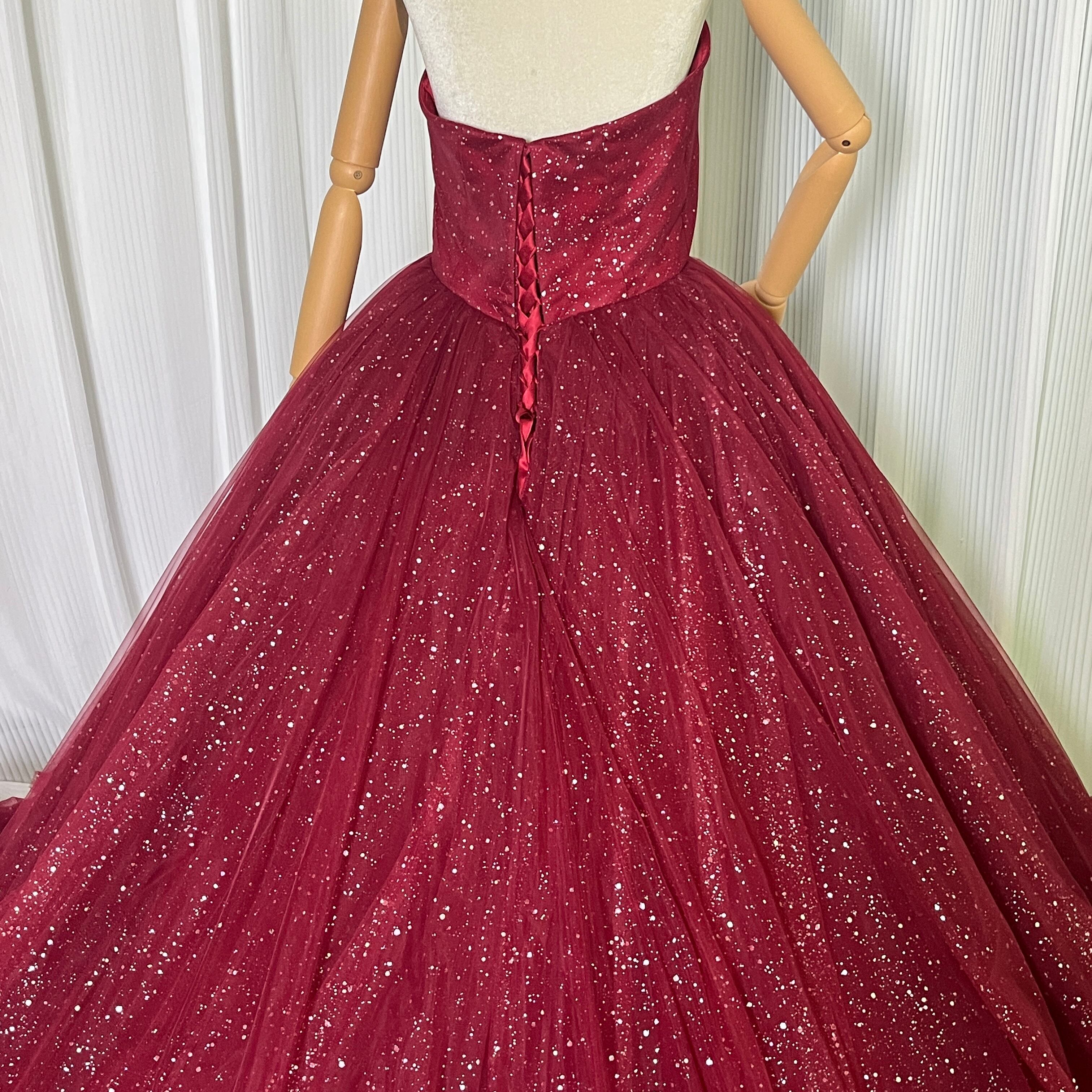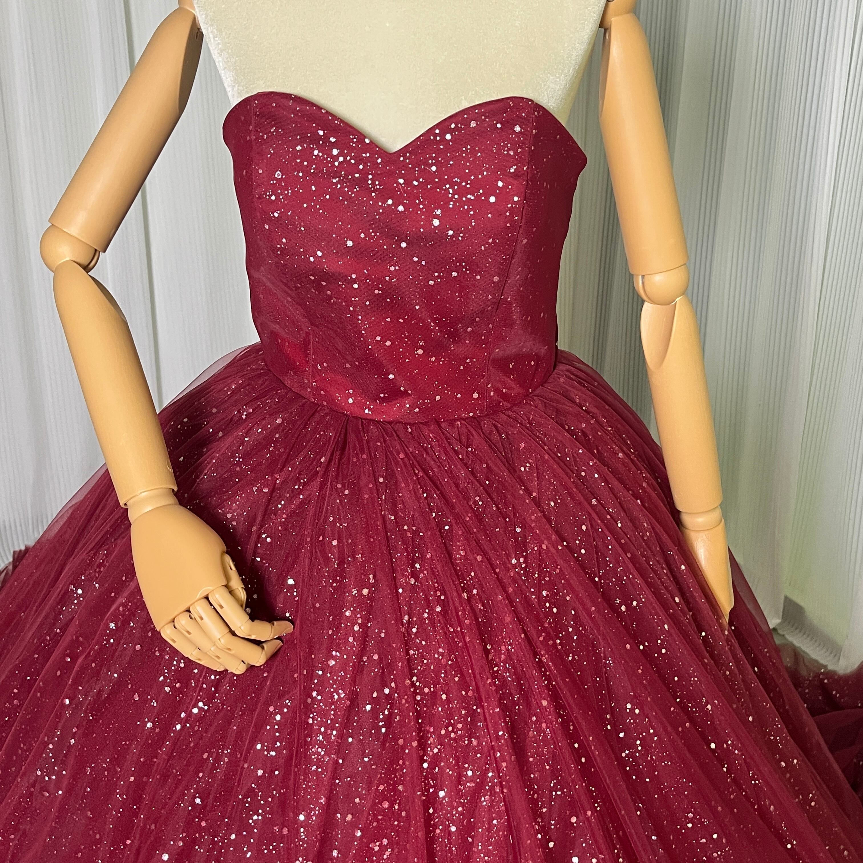 ワインレッド ベアトップ カラードレス キラキラチュール パーティードレス 優美なデコルテライン バックフリル 前撮り/二次会