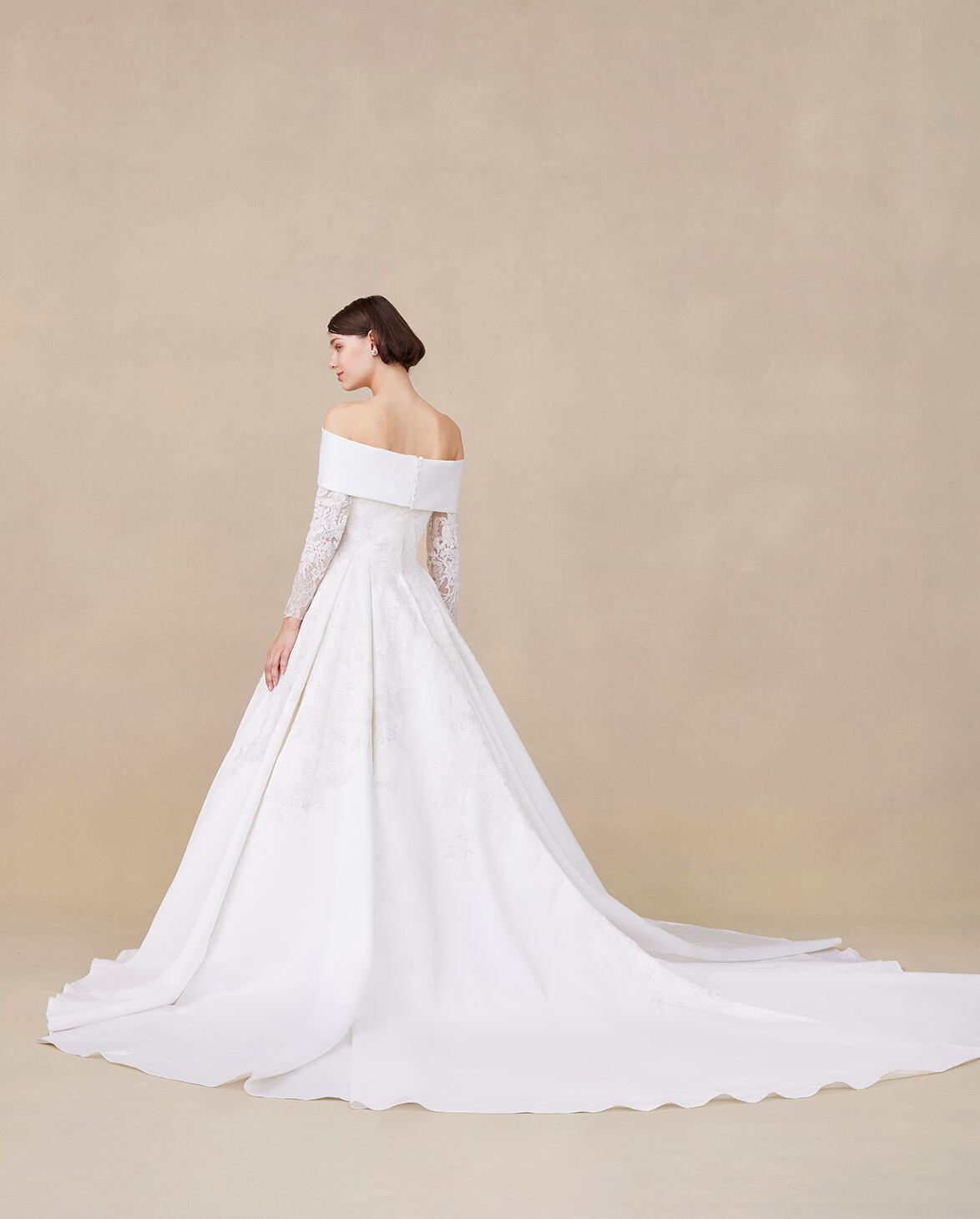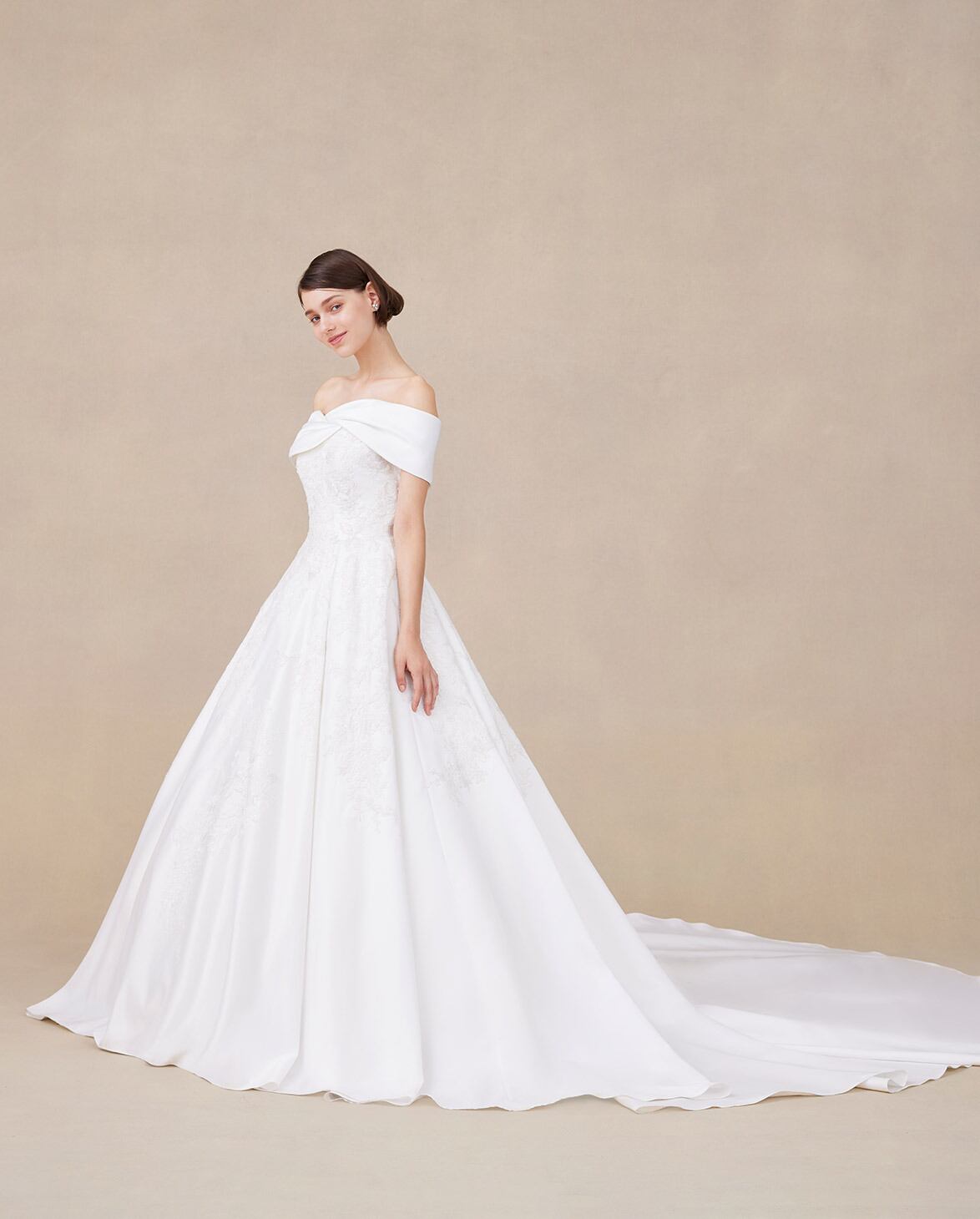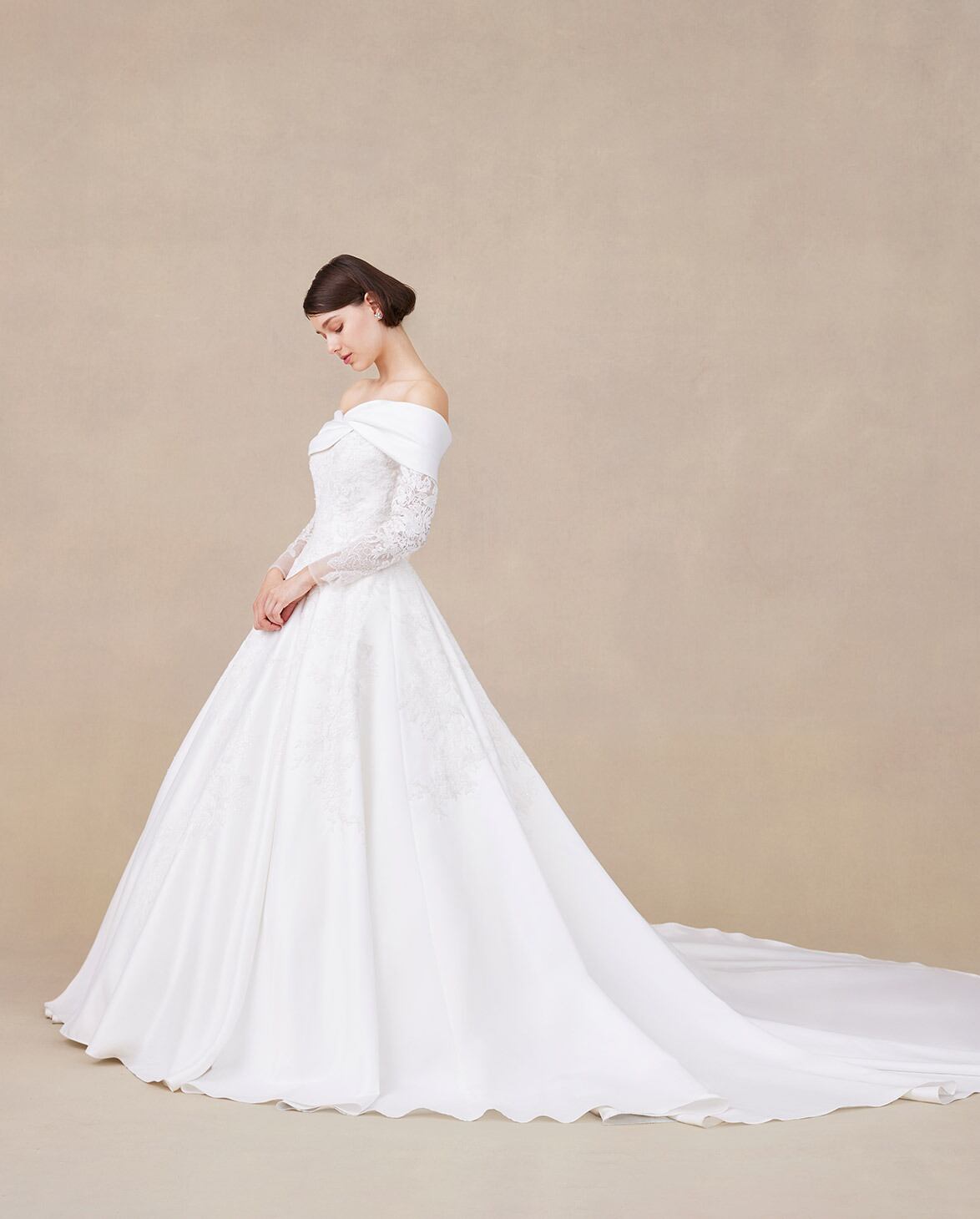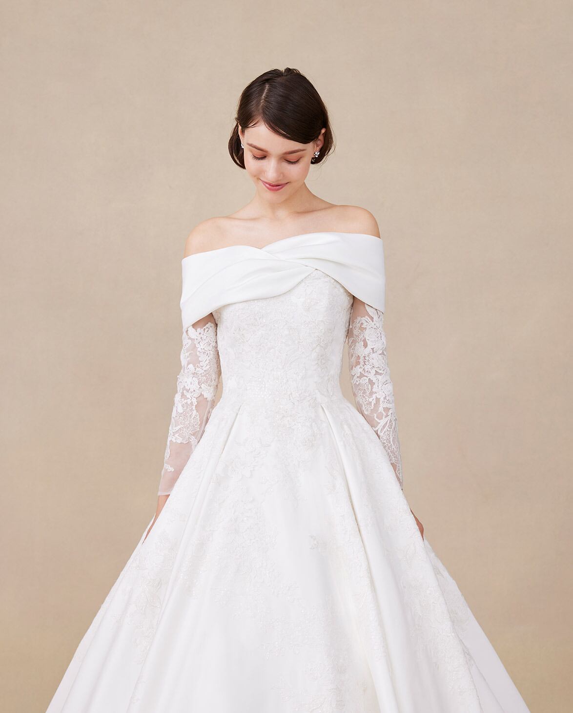 美品!クラシックなウエディングドレス 繊細レース オフショルダー ボックスプリーツ ロングトレーン ケープ、袖取り外し可能 前撮り/披露宴