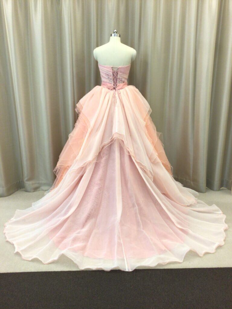 美品!コーラルピンク コーラルオレンジ カラードレス フリル パーティードレス ロングトレーン ビジュー ミディアムドレス 花嫁/前撮り