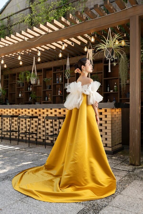 美品!マスタード色 イエロー/黄色 カラードレス マント パーティードレス ふわふわチュール袖 スレンダーライン ロングトレーン ナイトウエディング/前撮り | David1021k Dress(ダヴィドレス)
