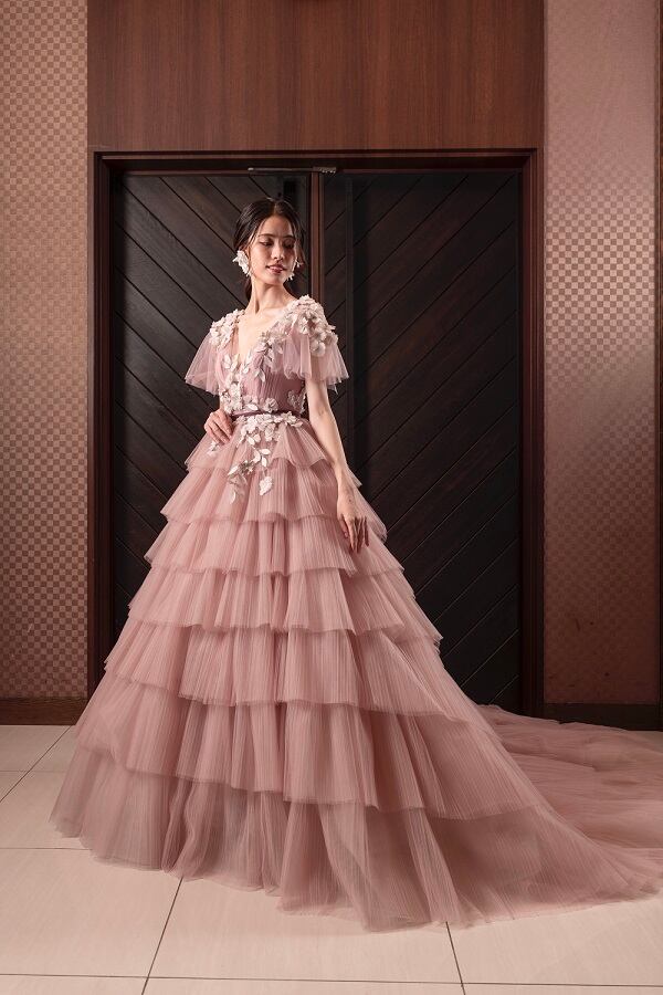 美品!ティアードのドレス 3D立体レース刺繍 カラードレス 薄ピンク くすんだピンク プリーツドレス パープル/紫 チュールドレス vネック お色直し 花嫁/挙式/前撮り | David1021k Dress(ダヴィドレス)