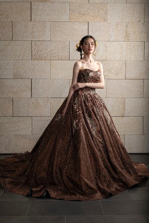 美品!ラメレースドレス ダークブラウン コーヒー色 カラードレス キラキラグリッターチュール vネックトップス お色直し 花嫁/挙式/前撮り