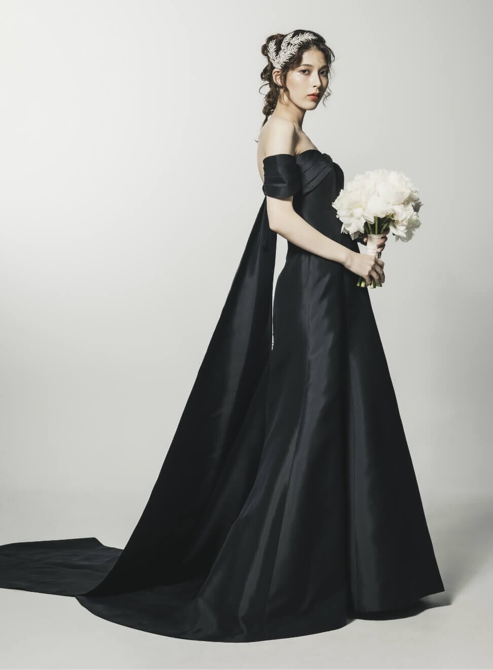 美品!マント ブラック/黒 カラードレス 付け袖 ミカドシルク パーティードレス ソフトマーメイド 美しいバックスタイル お色直し 挙式/前撮り