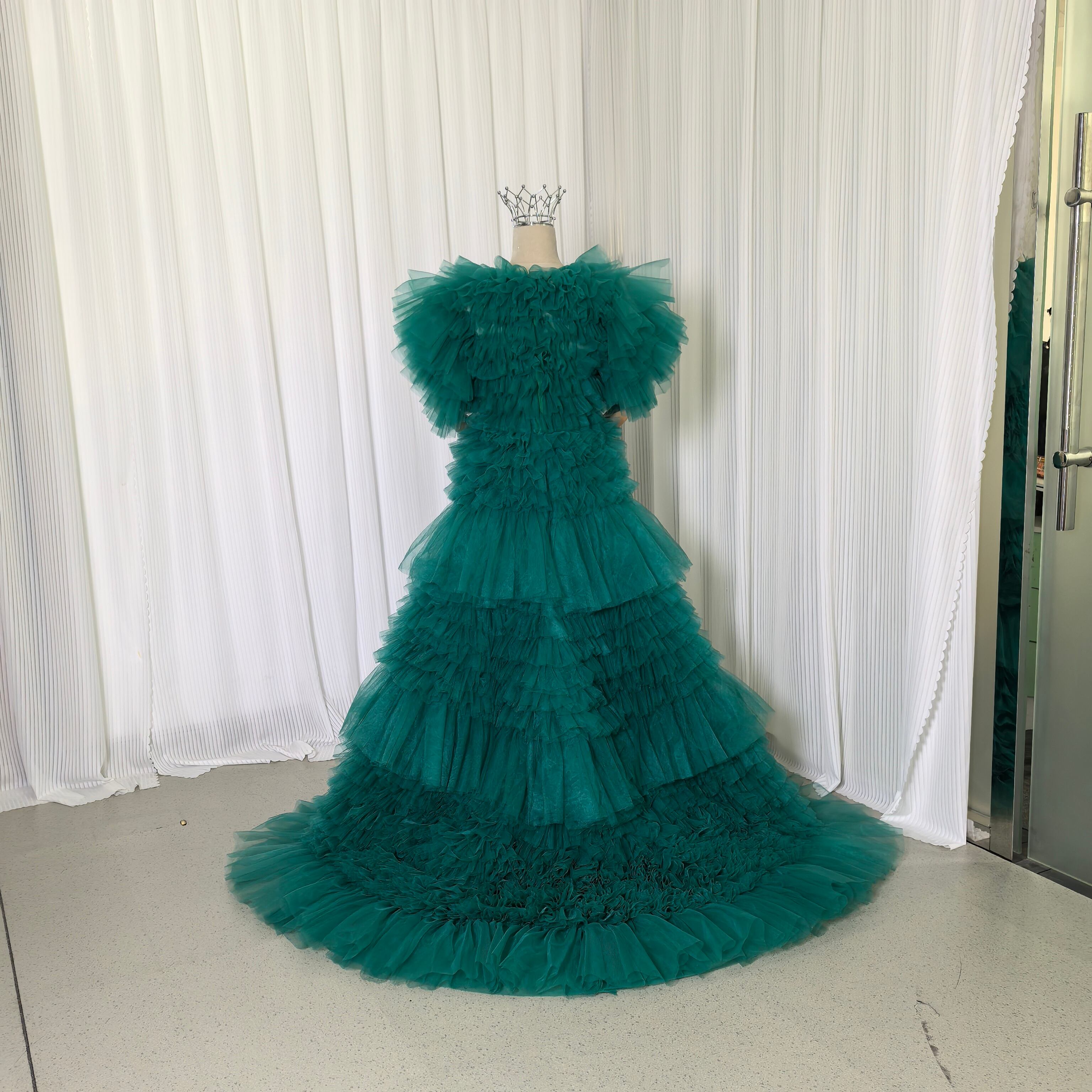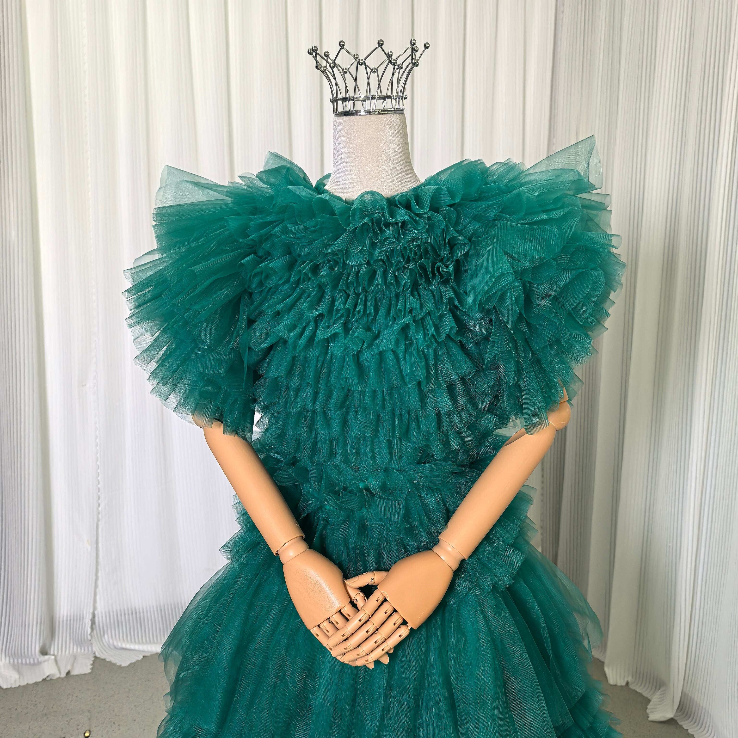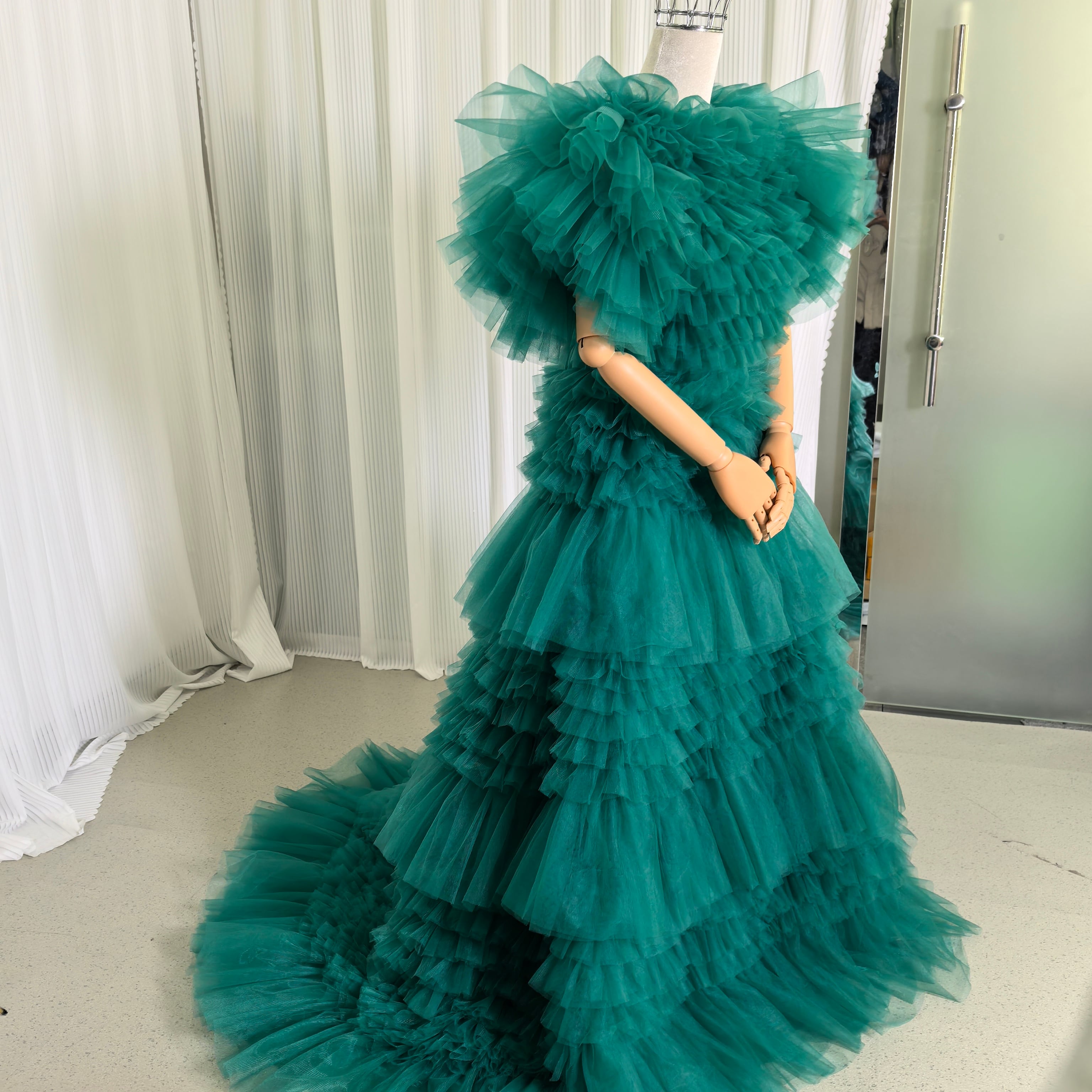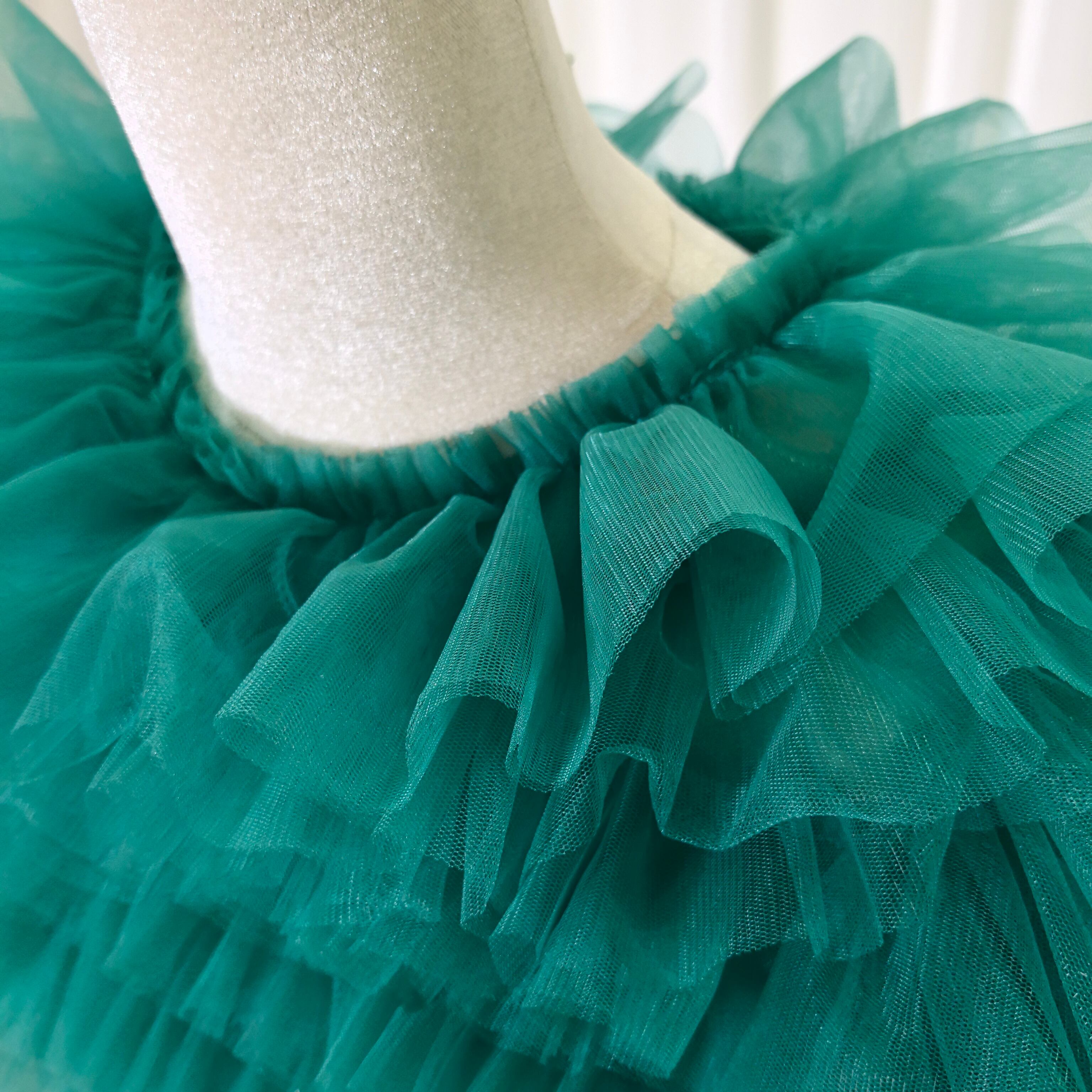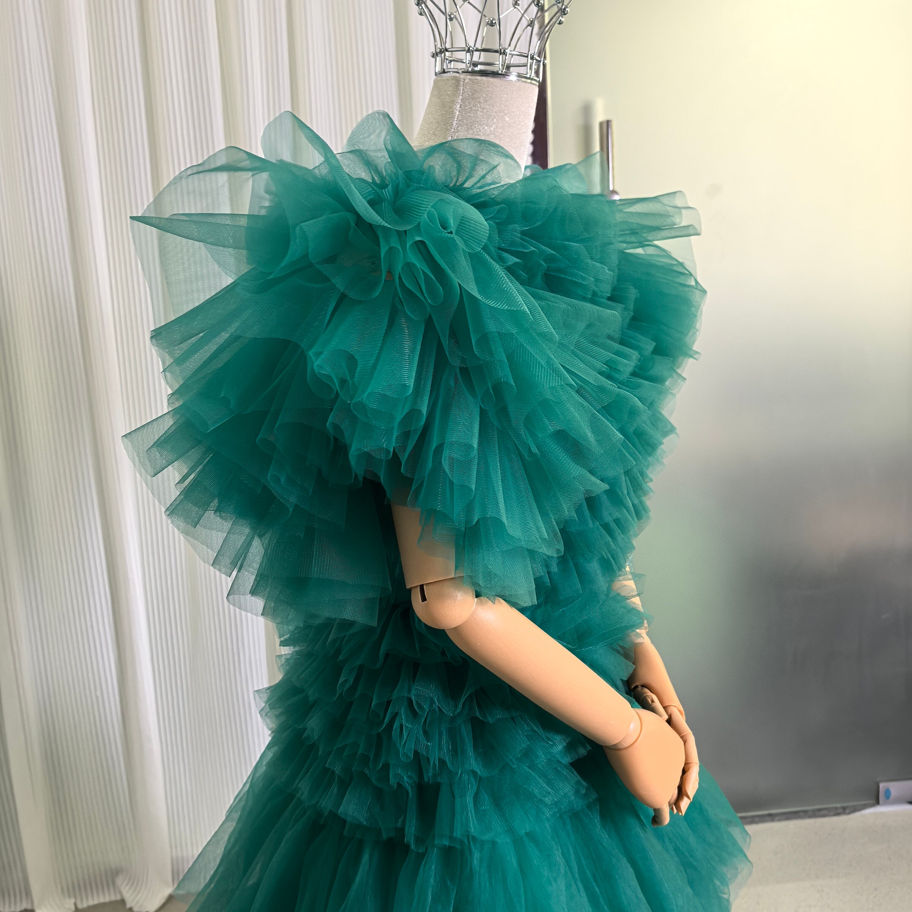 深緑カラードレス もこもこチュールドレス フリルオフショルダー 冬婚お色直し ふわふわボリュームドレス+グリーントップス
