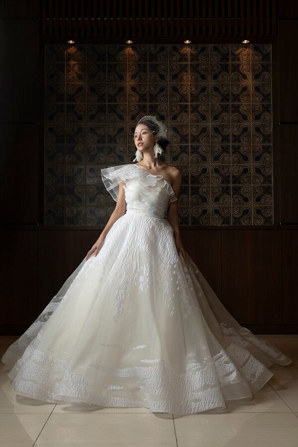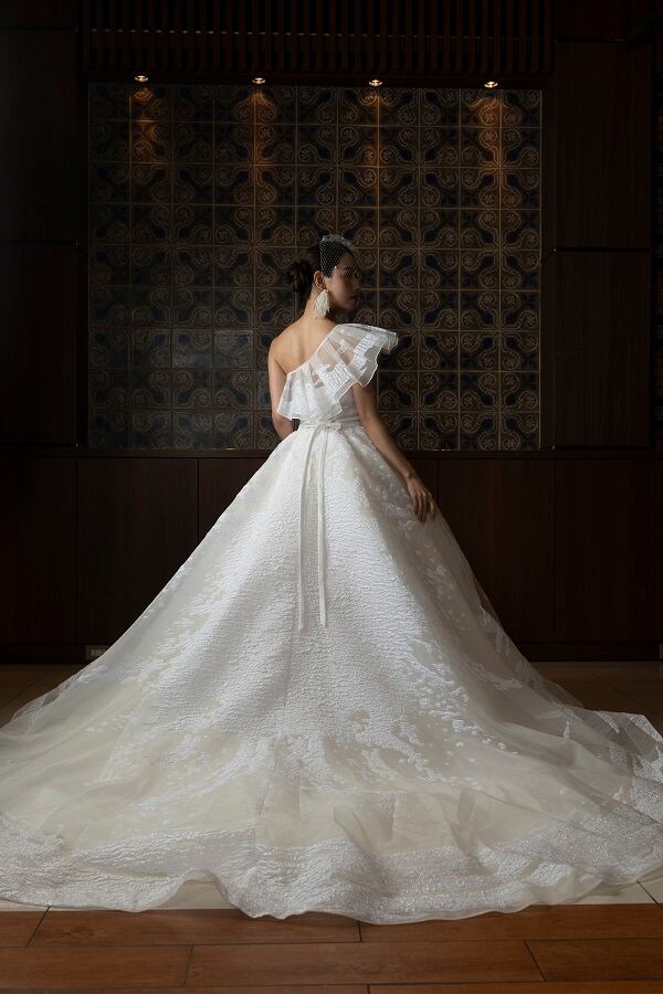 豪華!Aライン アイボリー色 ワンショルダー クラシックなウエディングドレス ロングトレーン ジャカード生地 ふんわりチュールドレス 前撮り