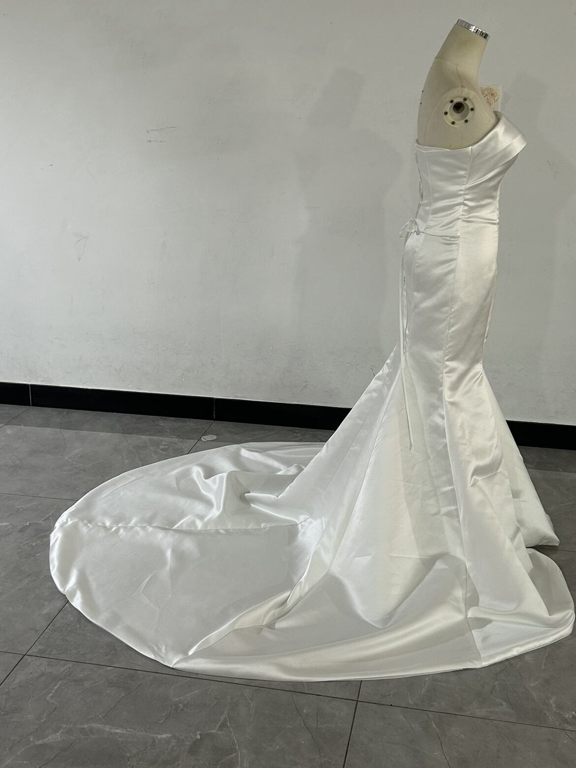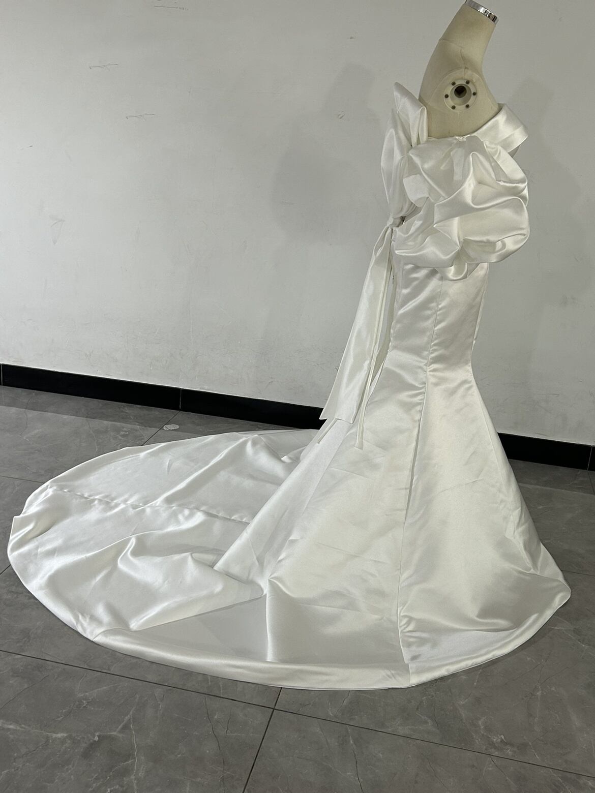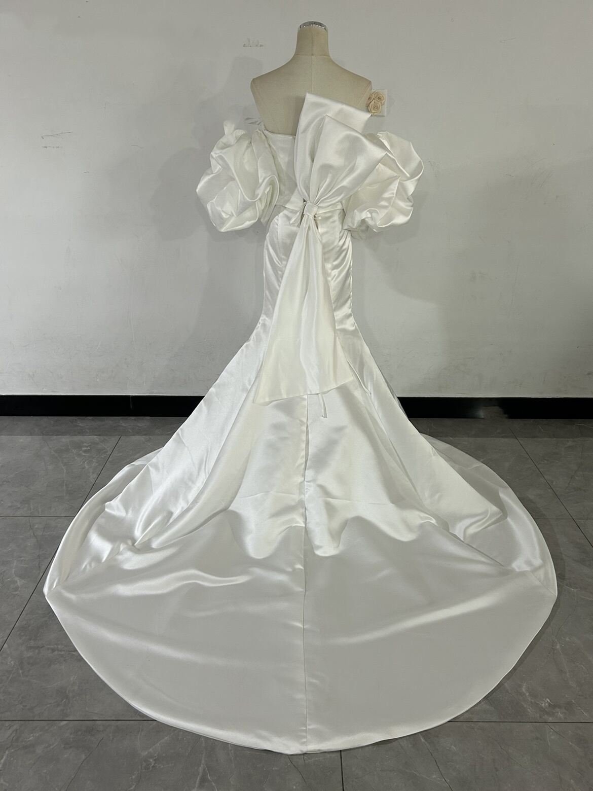人気上昇!オフショルダー オフホワイト ウエディングドレス マーメイドライン ふっくら柔らかなバックリボン 取り外し袖 結婚式/前撮り