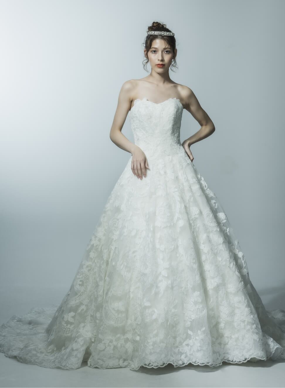 美品!花モチーフ刺繡 ウエディングドレス 総レースドレス 高みせ 細見えシルエット Aラインドレス オシャレ 教会式/前撮り