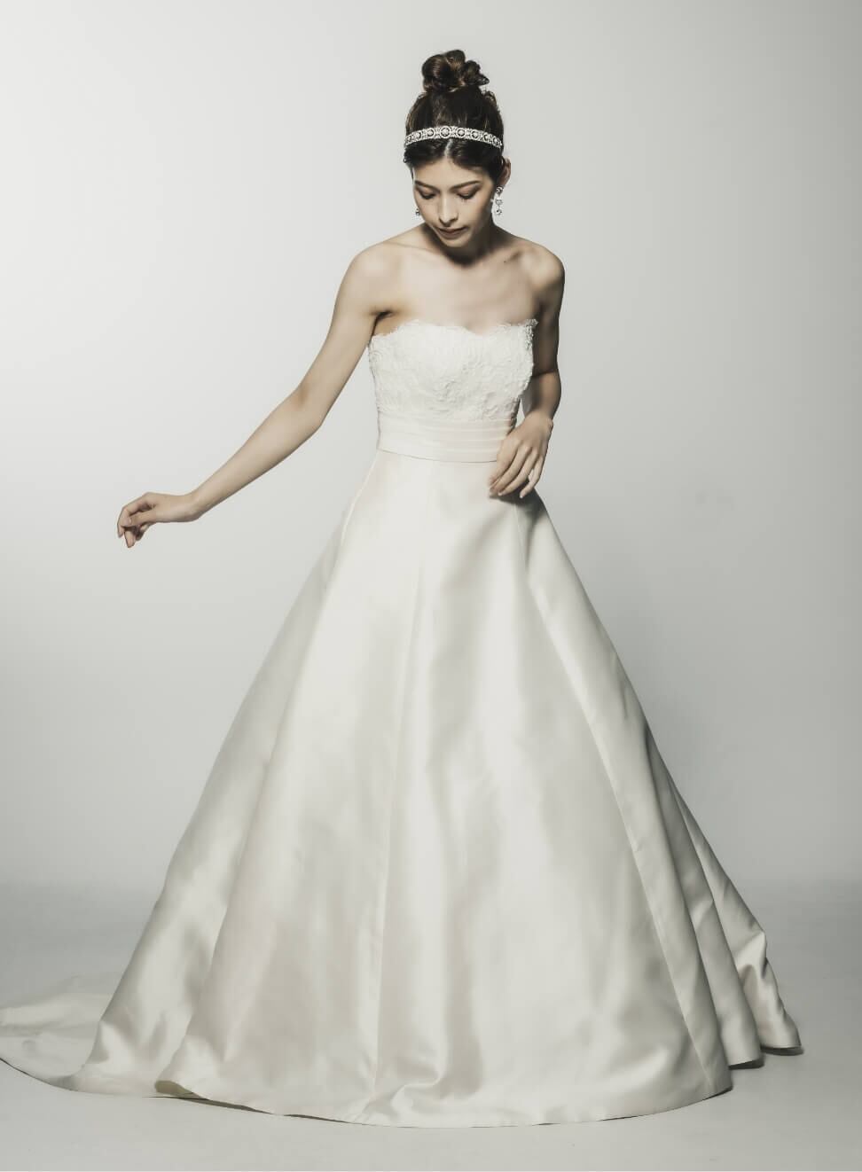美品!繊細レース ウエディングドレス パーティードレス 細見えシルエット Aラインドレス ミカドシルク ベアトップ オシャレ 教会式/前撮り