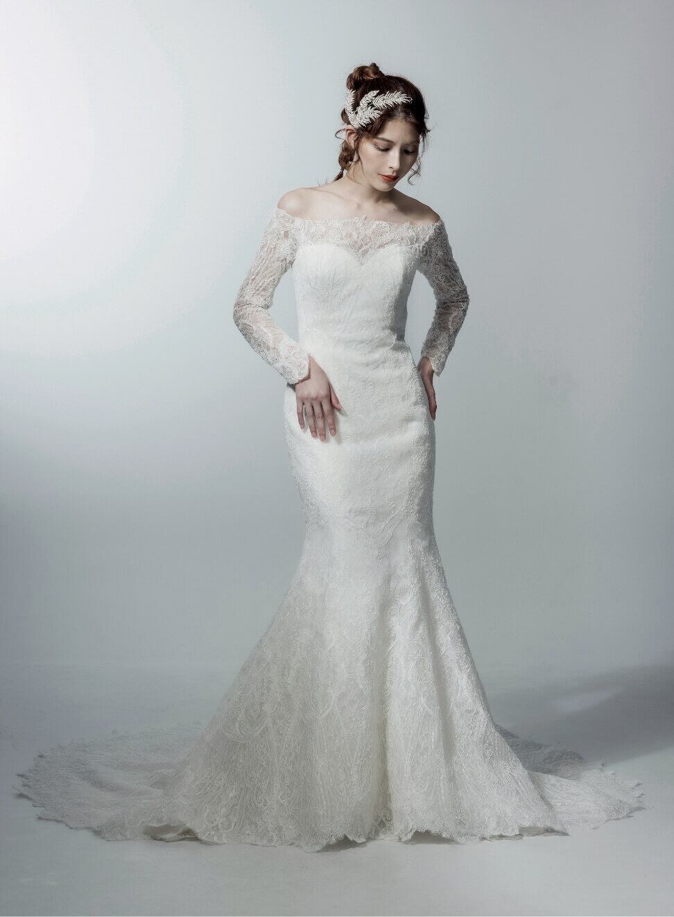 美品!総レースドレス 大人なウエディングドレス ロングスリーブ レースボレロ 細見えシルエット スレンダーライン オフショルダー マーメードドレス 前撮り