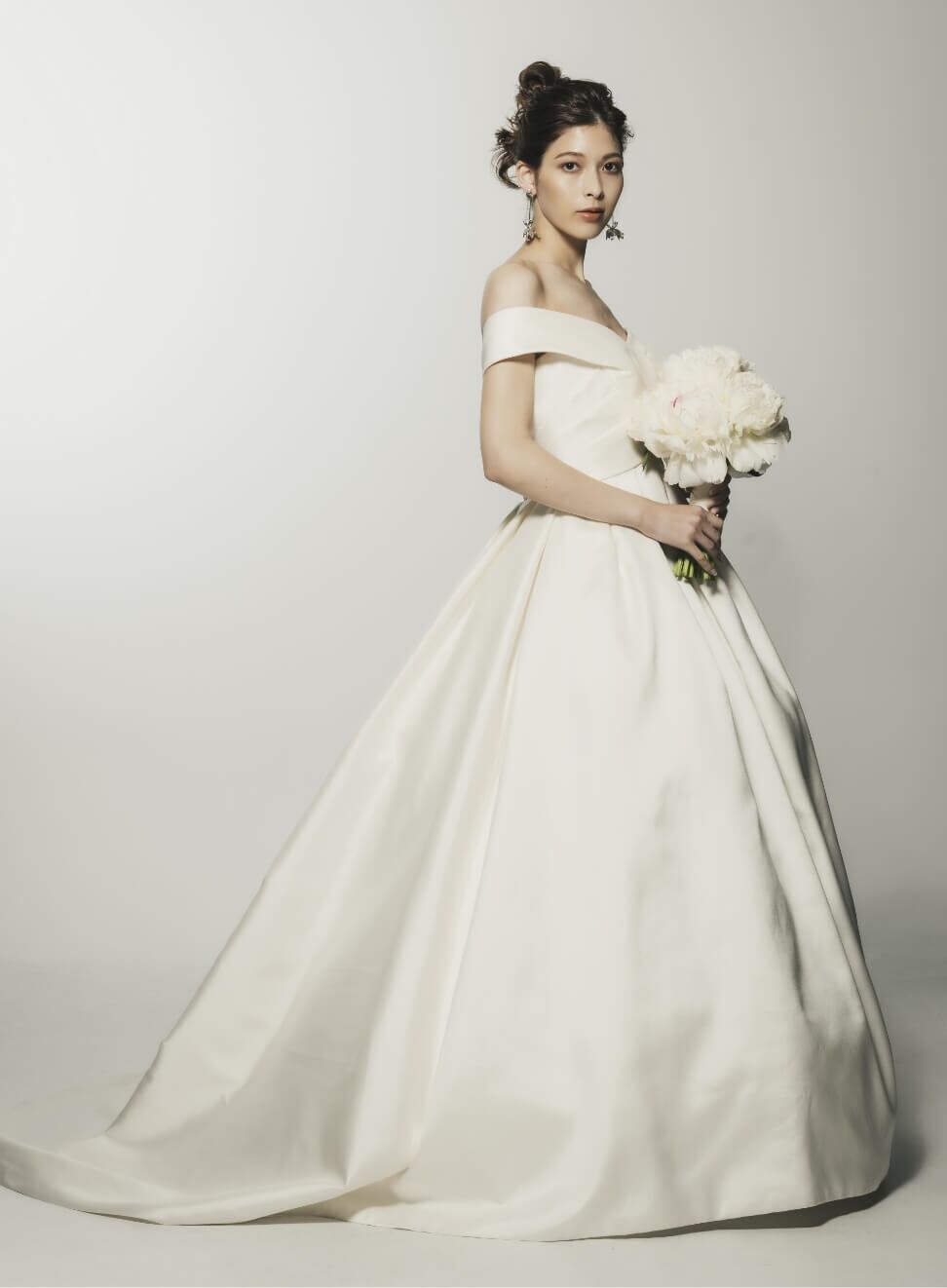美品!ミカドシルク クラシックなウエディングドレス メリハリのあるオフショルダードレス 妊婦ドレス エンパイアライン マタニティ 前撮り/結婚式