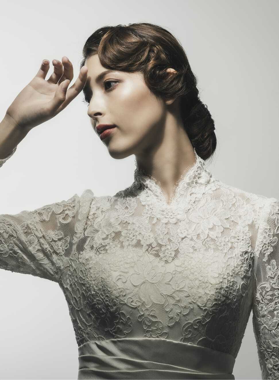 美品!繊細レーストップス ウエディングドレス ハイネック ロングスリーブ 細見えシルエット Aラインドレス ミカドシルク 教会式/前撮り