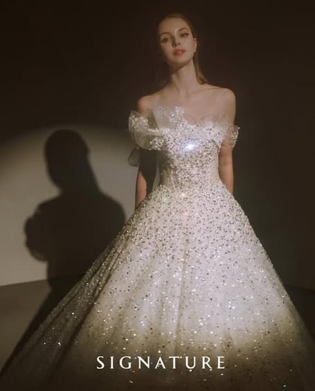 華やか!韓国風ドレス ウエディングドレス キラキラビジュードレス オフショルダー アシンメトリー風 Aラインドレス ボリューミー 教会式/前撮り