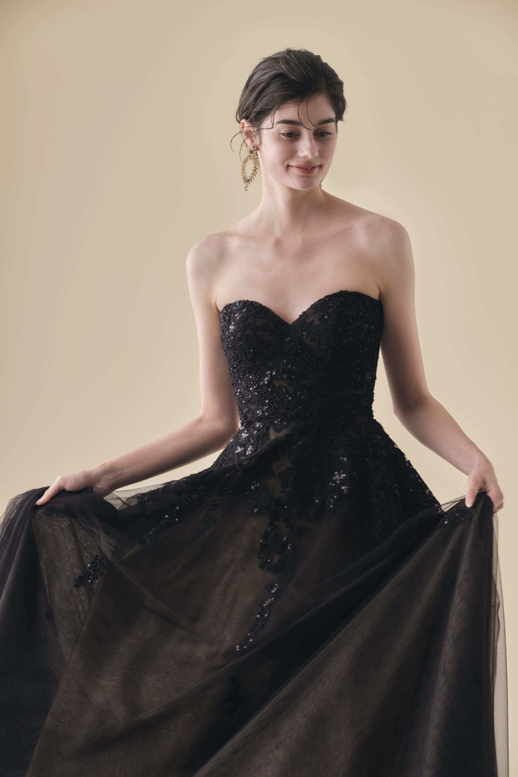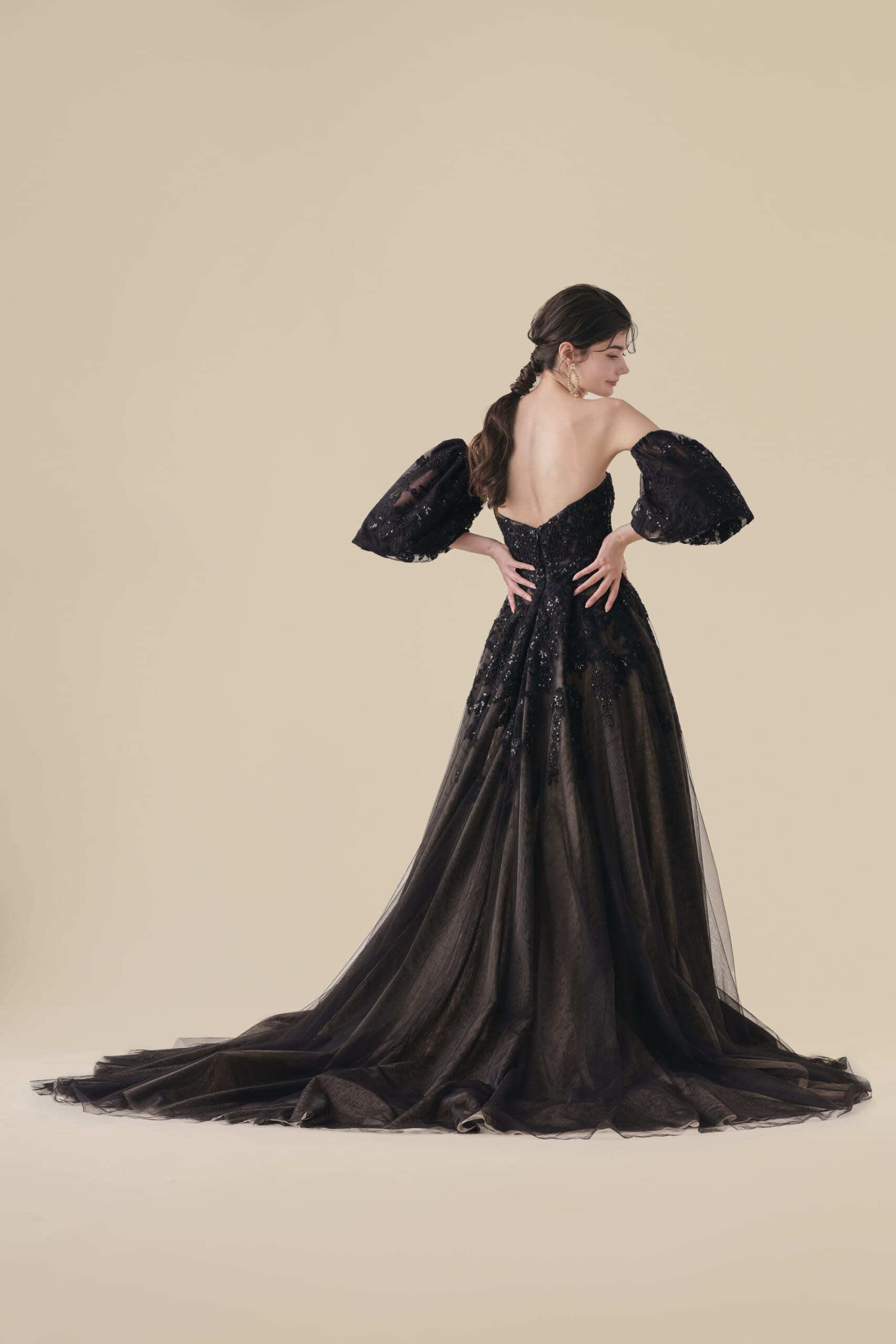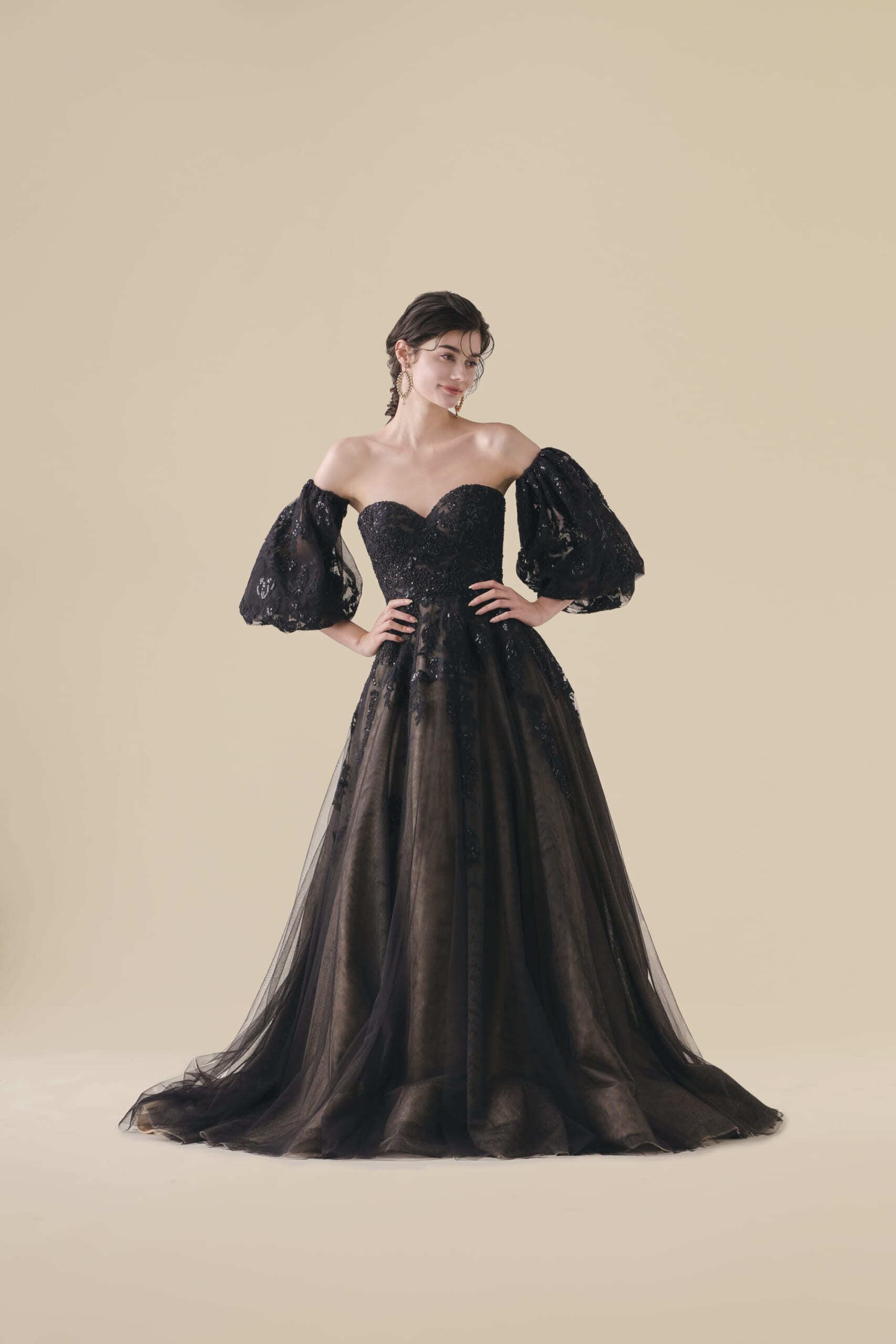 美品!ブラック/黒 パフスリーブ キラキラと輝くレースドレス カラードレス パーティードレス ビスチェスタイル シャンパンゴールド