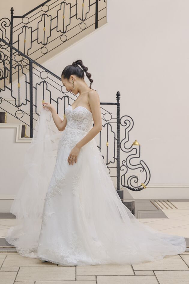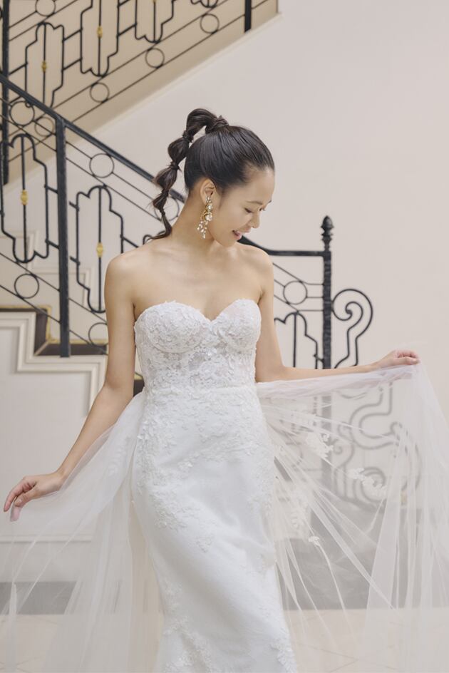 美品!軽やかなウエディングドレス マーメイドシルエット 取り外しのトレーン フラワーモチーフ コンパクトなビスチェスタイル 前撮り
