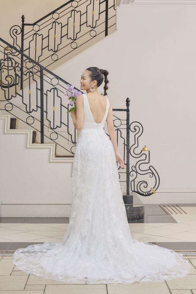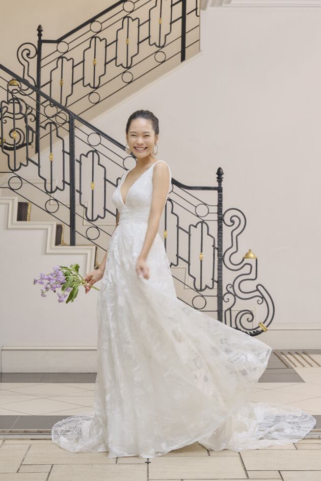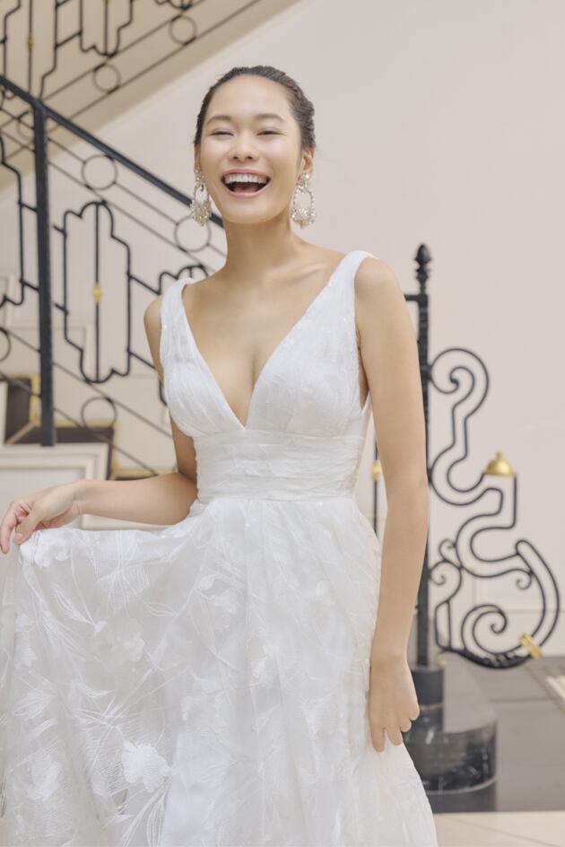 大人な雰囲気!軽やかなウエディングドレス 総レースドレス フローラルレースたっぷり ノースリーブ×ディープVネック パーティードレス 前撮り