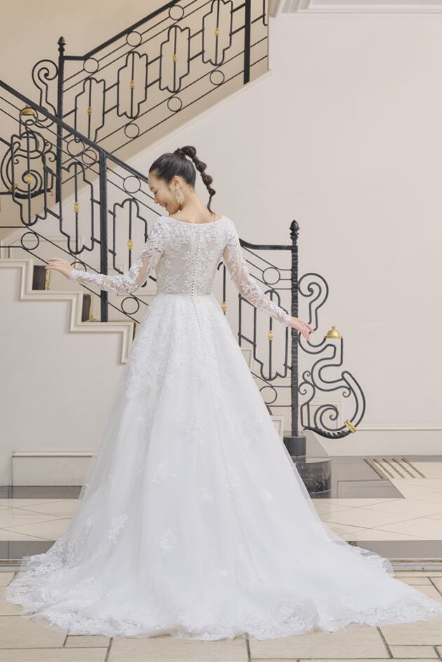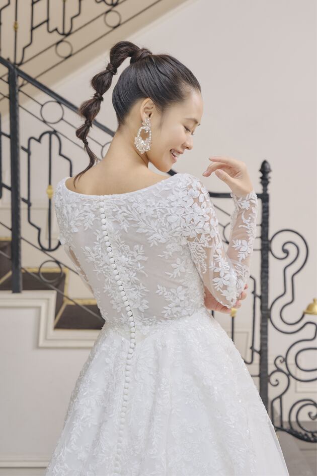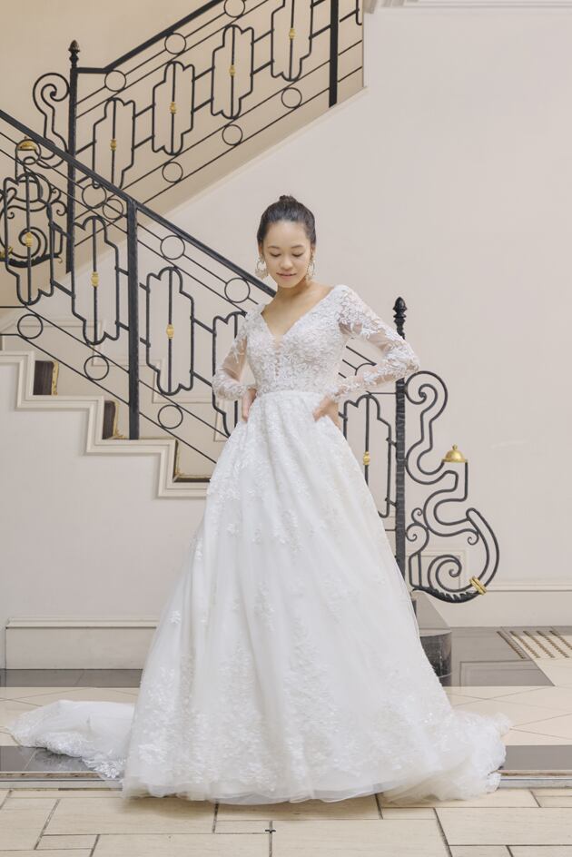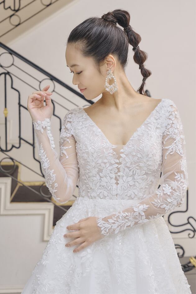 大人な雰囲気!軽やかなウエディングドレス Aラインシルエット フローラルレースたっぷり 透け感のあるロングスリーブ Vネック パーティードレス 前撮り | David1021k Dress(ダヴィドレス)