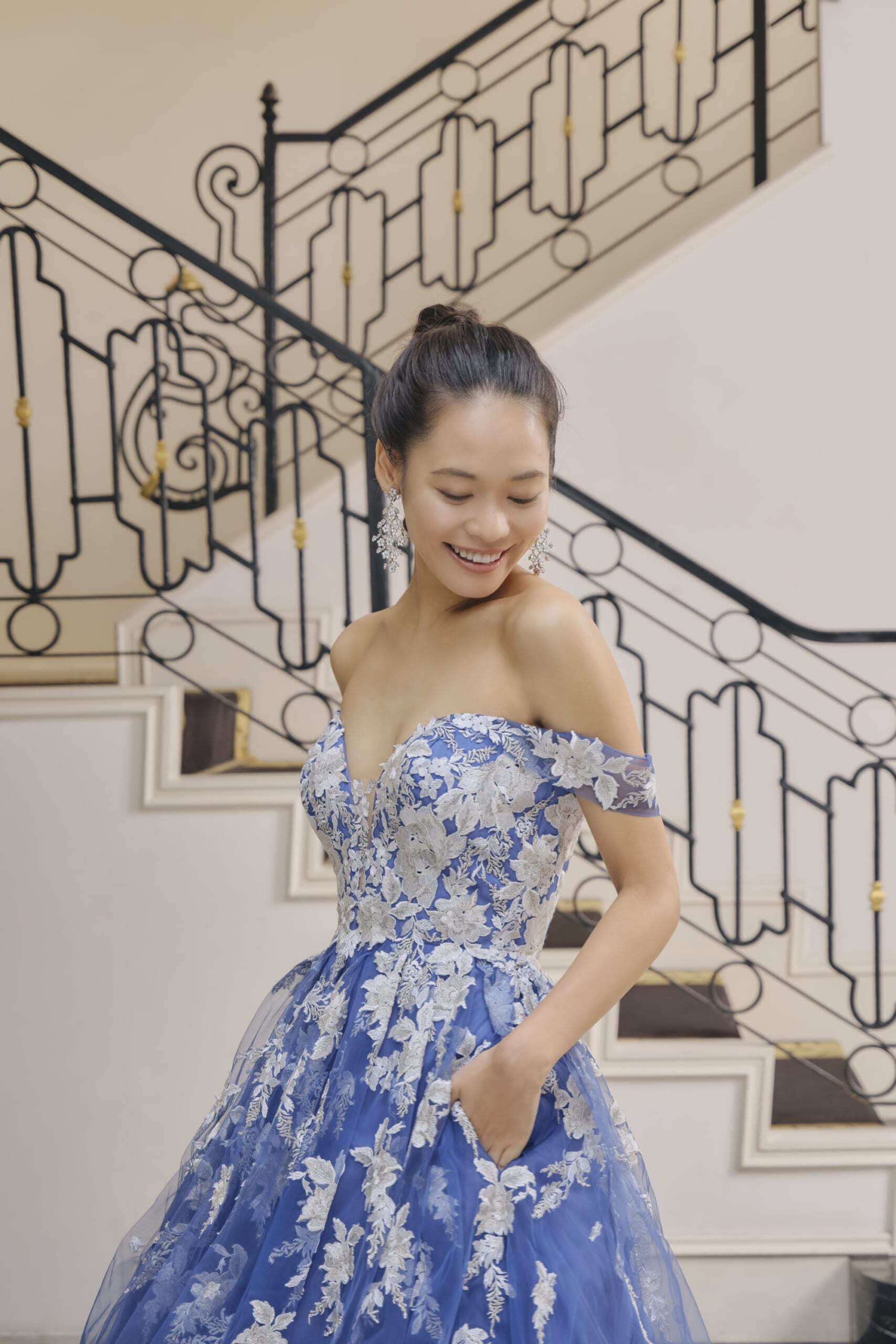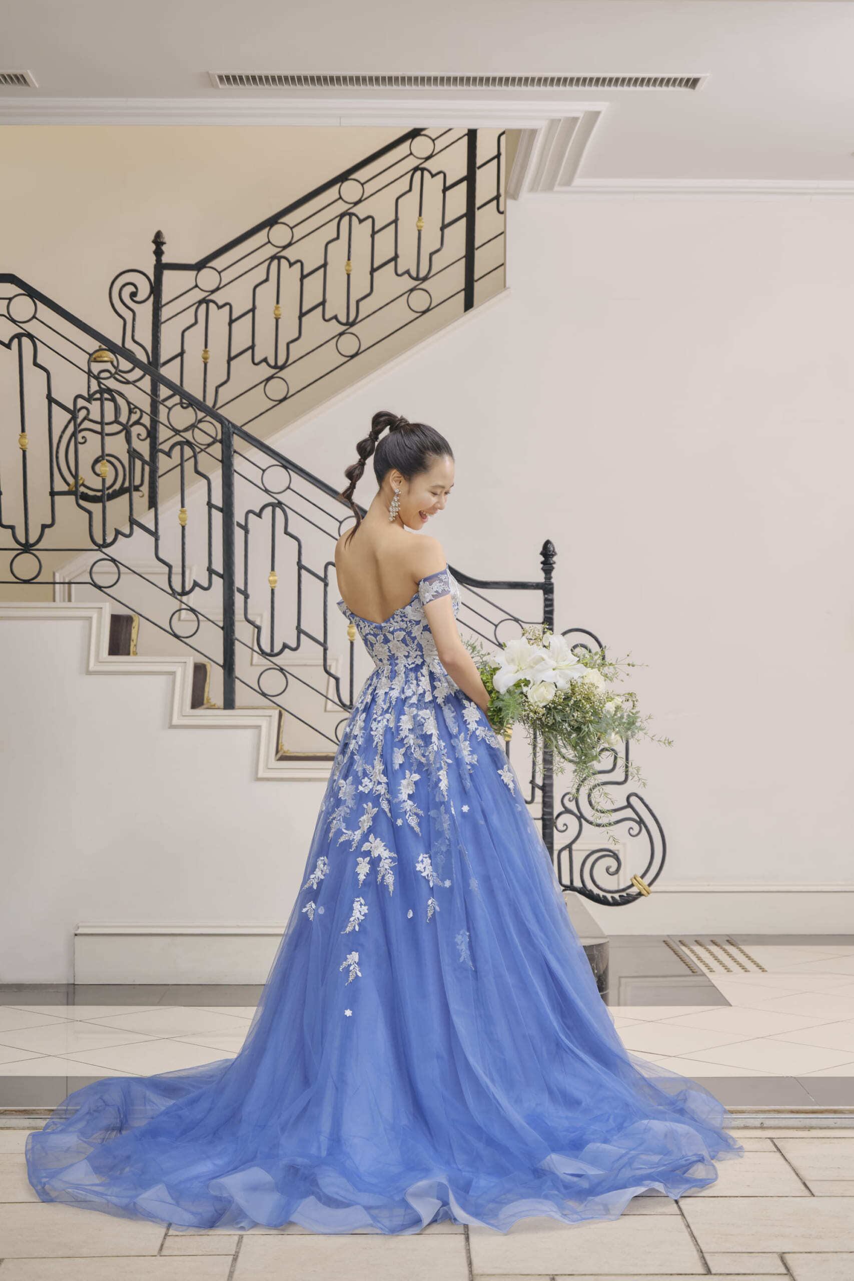 爽やかなブルー カラードレス 裾にホースヘア パーティードレス フラワーモチーフ 柔らかなチュール オフショルダー ナイトドレス/二次会