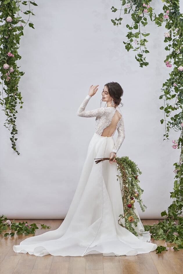 上品!ウエディングドレス ディープVネック ロングスリーブ ロングトレーン 背中見せ/バックレス パーティードレス