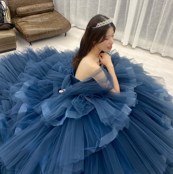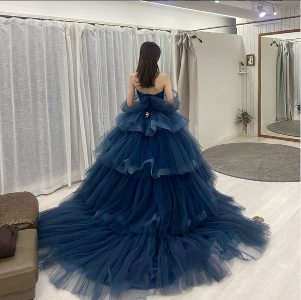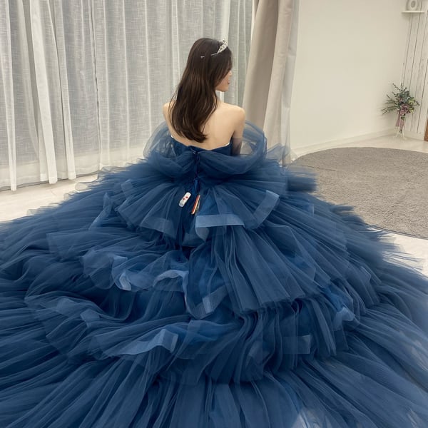 美品!ネイビーブルー 深いブルー カラードレス ティアードスカート チュールドレス パーティードレス 裾にホースヘア