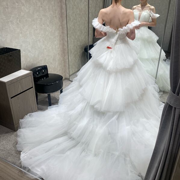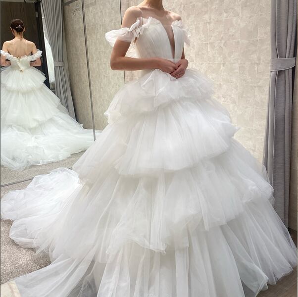 美品!ざっくり開いた胸元 ウエディングドレス ティアードスタイル 雲のようなふわふわチュールドレス ディープVネック ボリュームドレス