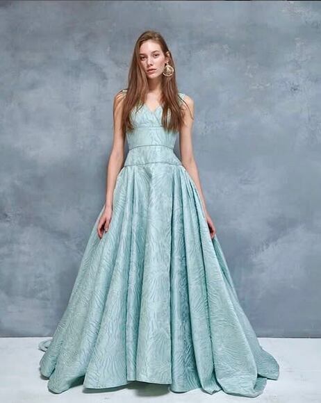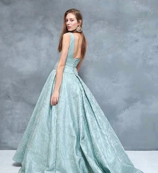 美品!ノースリーブ vネック カラードレス ジャカード生地 Aラインドレス メリハリのあるパーティードレス ボリューム