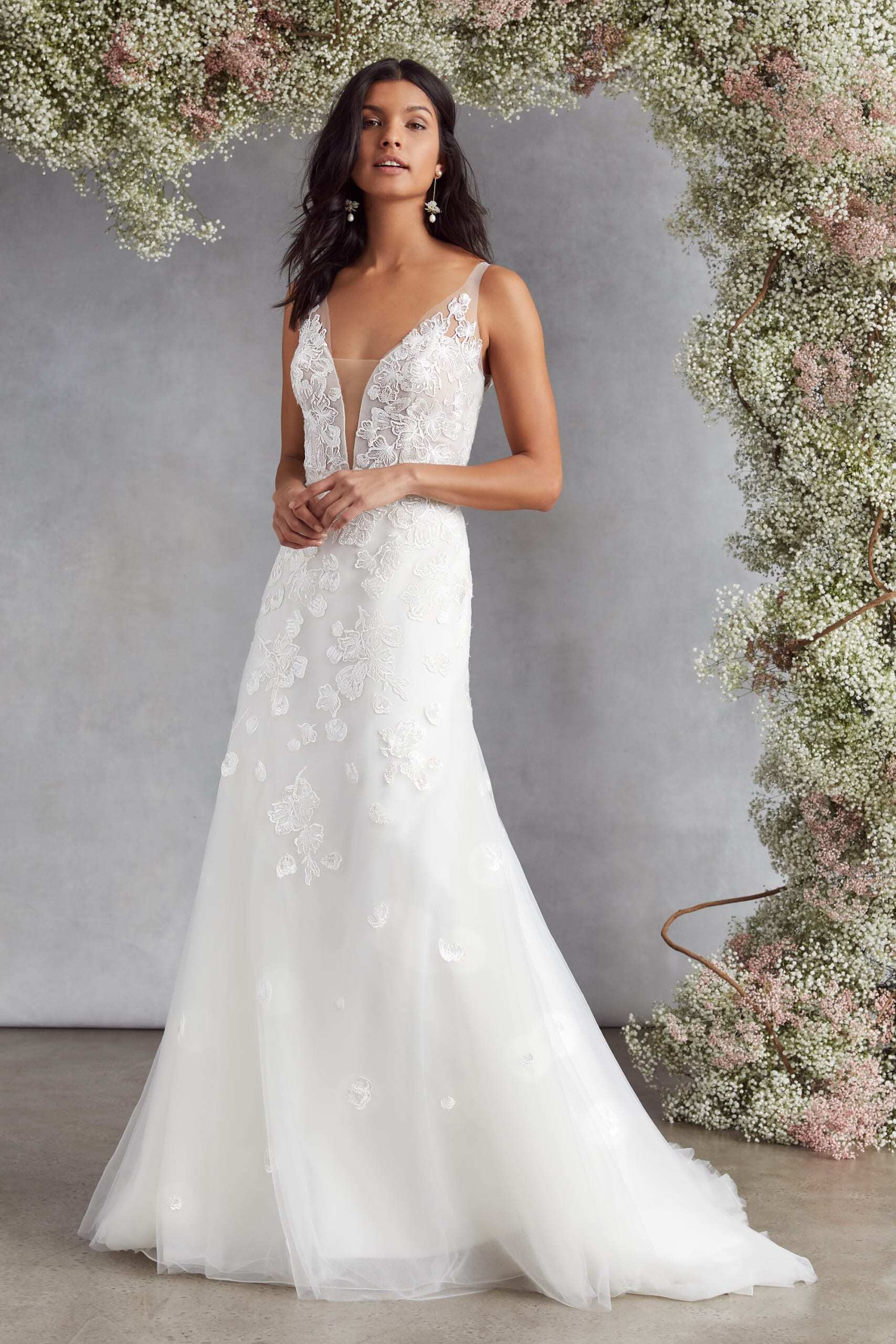 上品!ソフトチュールドレス ディープVネック セクシー 花モチーフ刺繡 ウエディングドレス ソフトマーメイド 背中見せ/バックレス