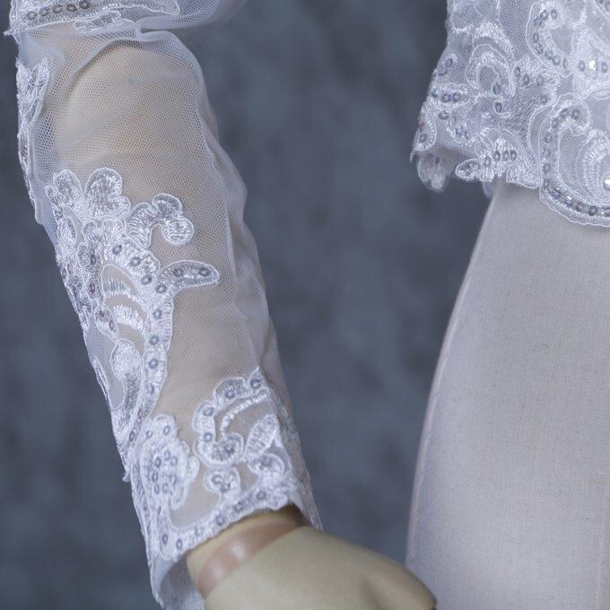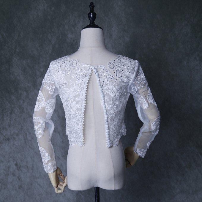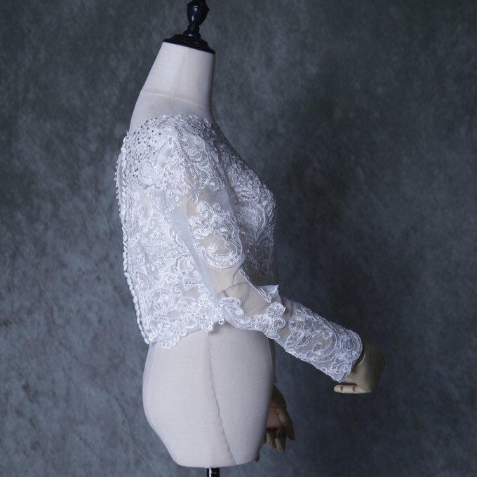 実例写真 .高品質!ウエディングドレス ボレロ オフショル 総レース くるみボタン ビジュートップス長袖 結婚式 二次会 前撮り