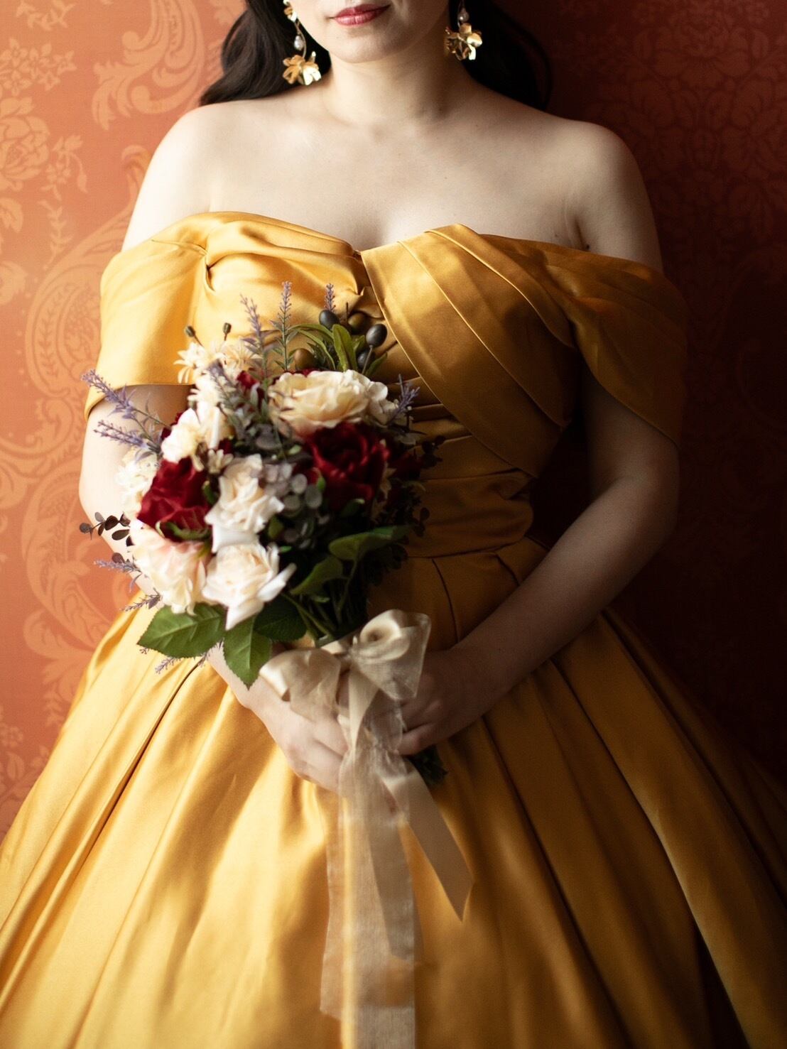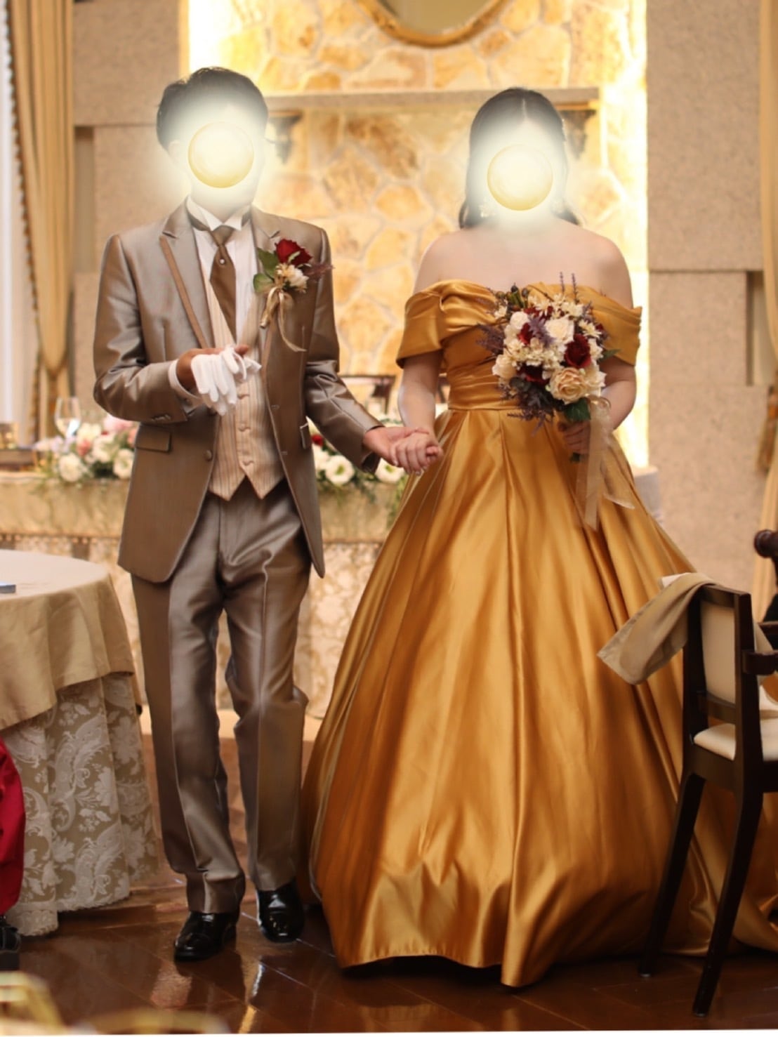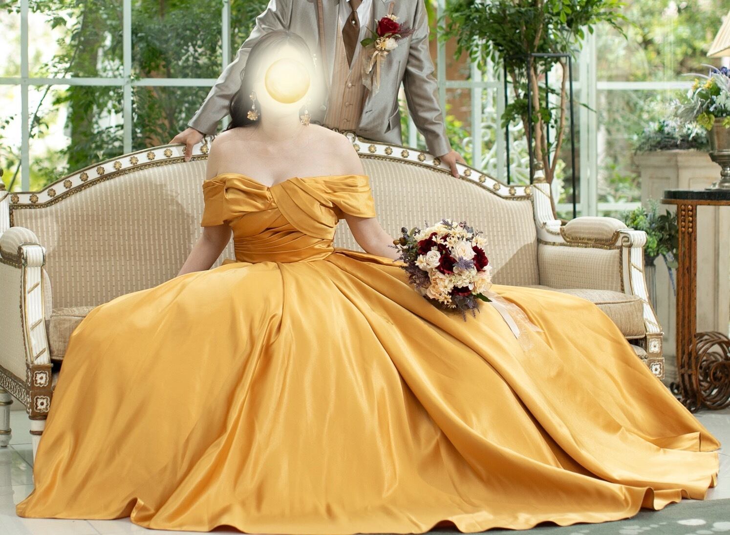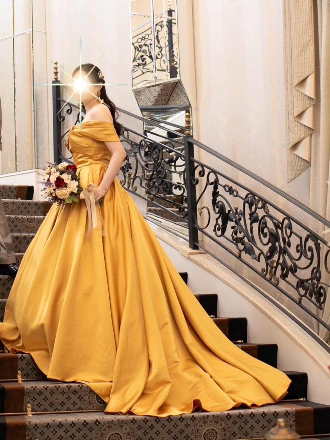 実例写真!高品質!イエロー オフショルダー カラードレス 華やかなトレーン 前撮り結婚式 2次会