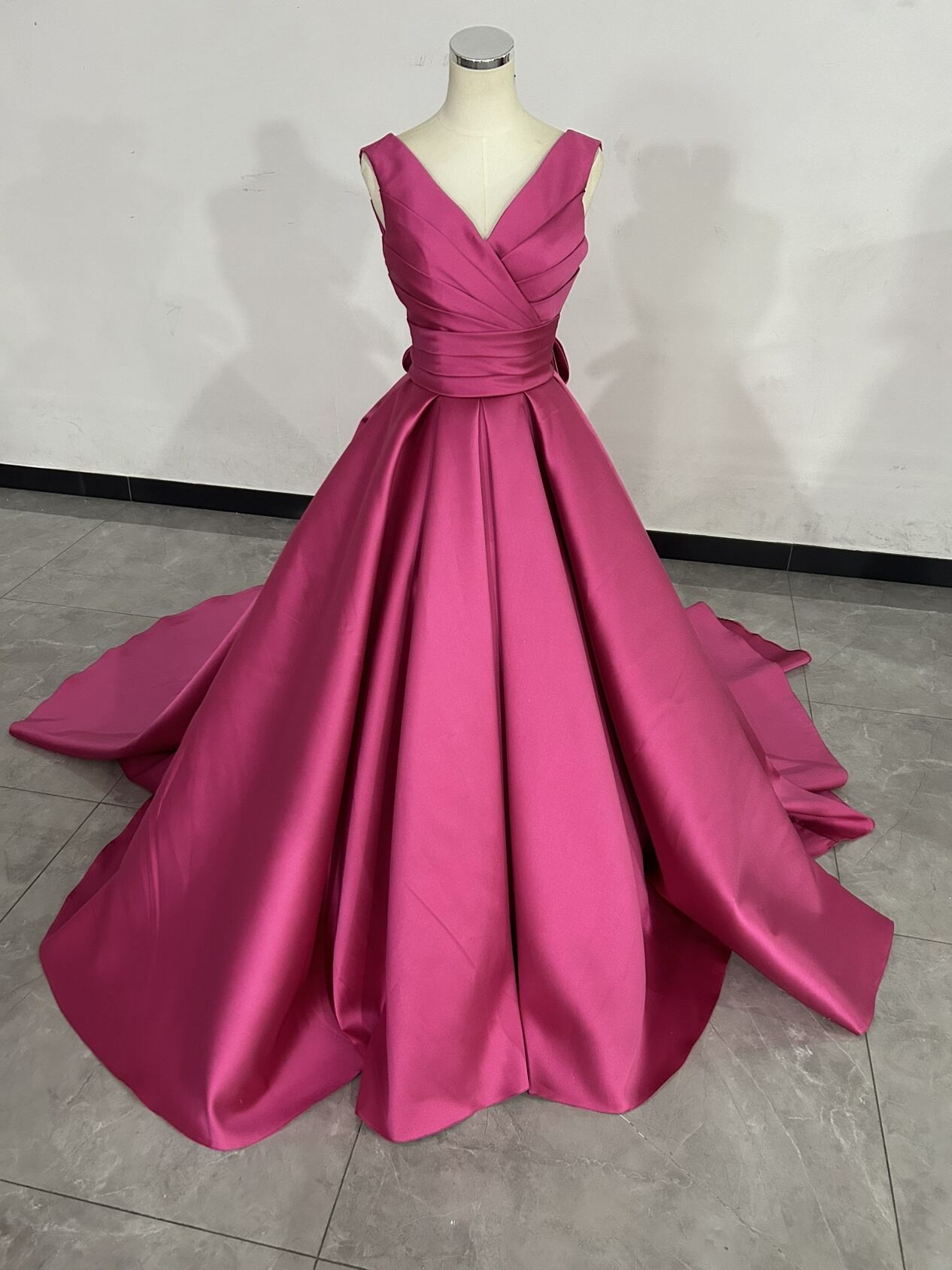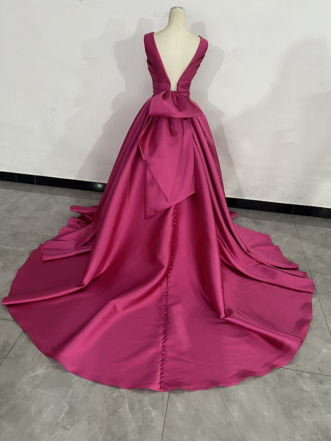 人気上昇!高級 ビビッドピンク 光沢感を抑えた重厚感のあるミカドサテン カラードレス ふっくら柔らかなバックリボン 結婚式 パーティードレス