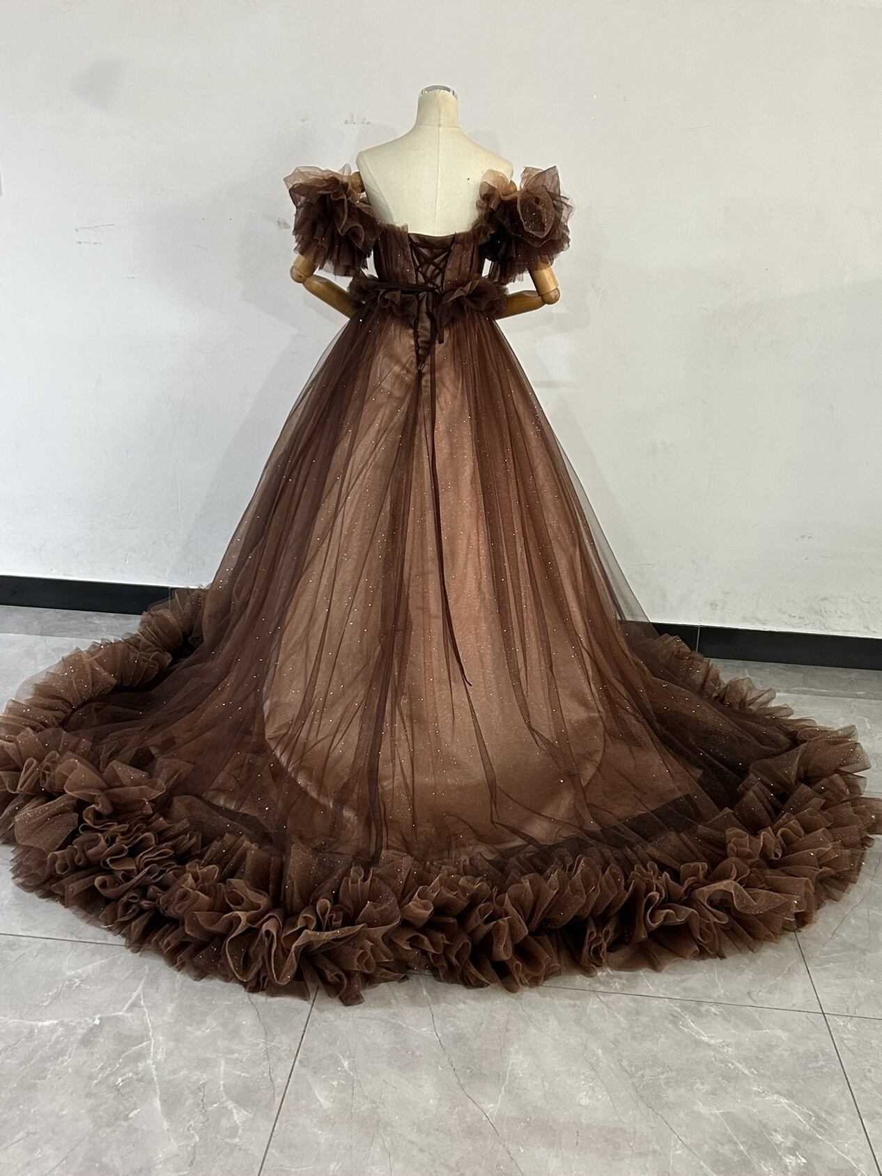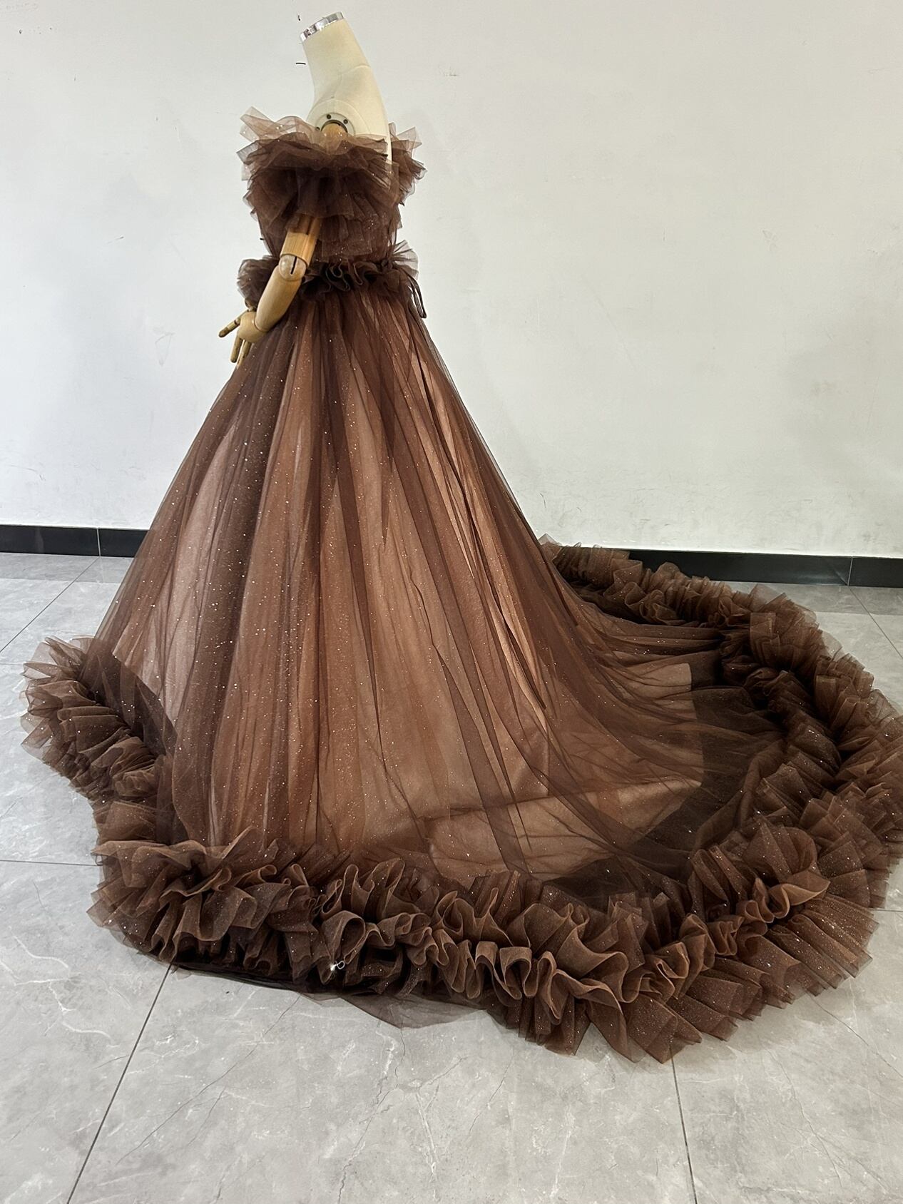 送料無料!コーヒーの色 キラキラチュール 取り外し袖 カラードレス ソフィア ソフトチュール 前撮り 結婚式披露宴