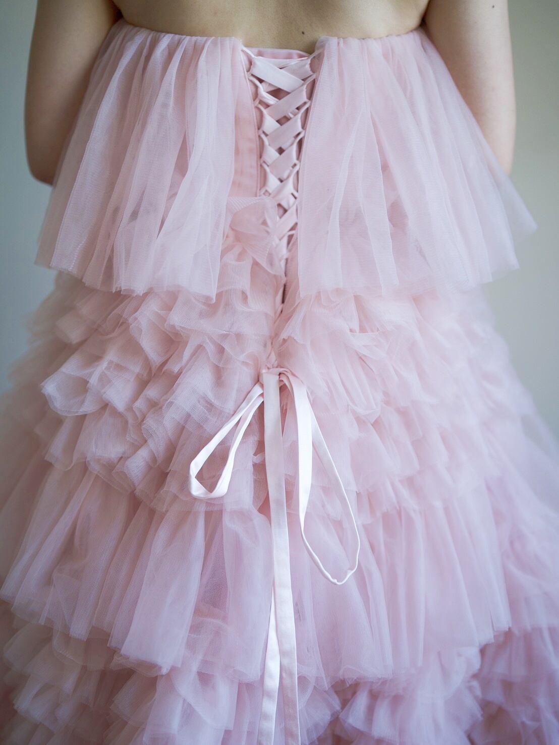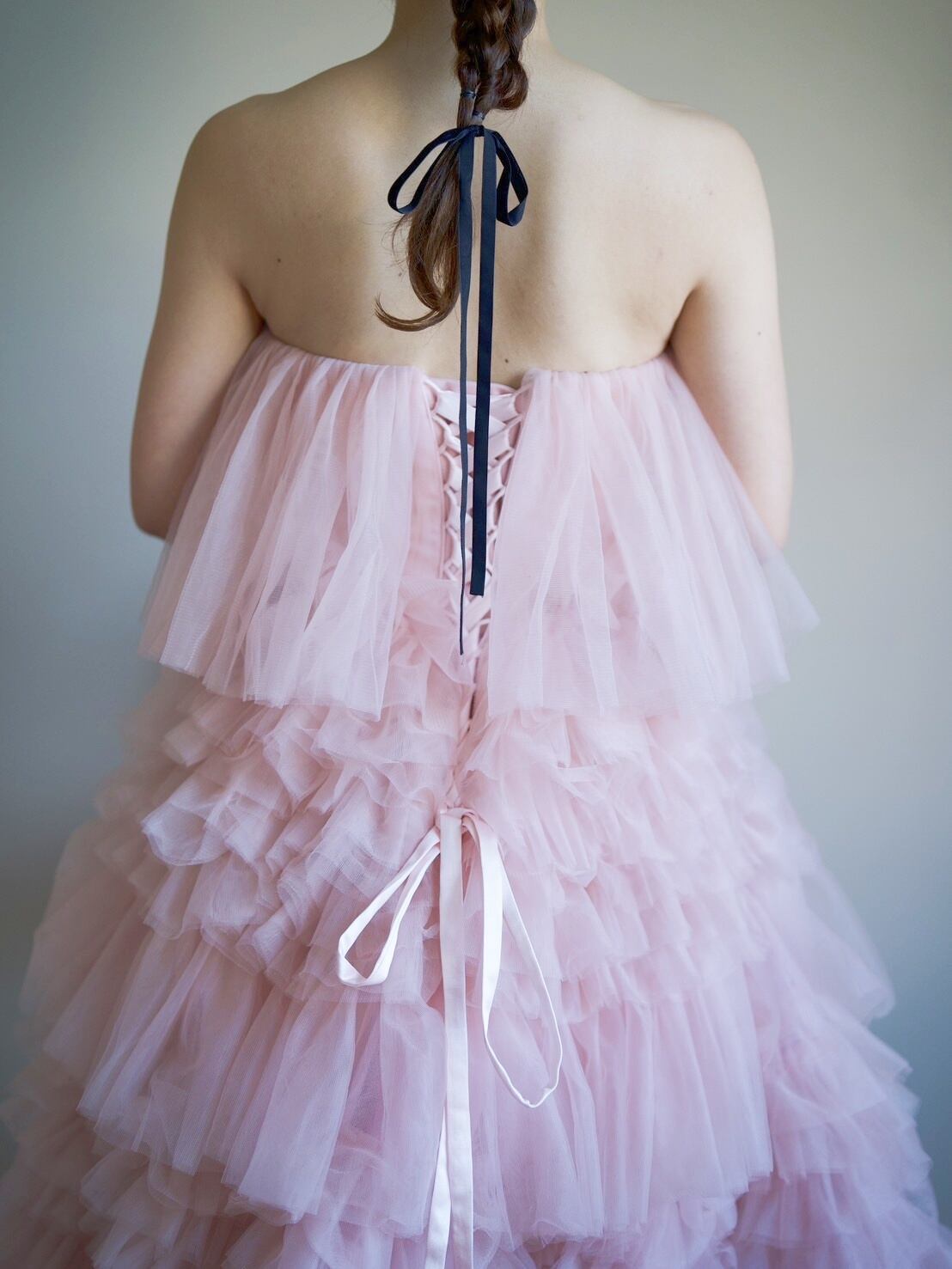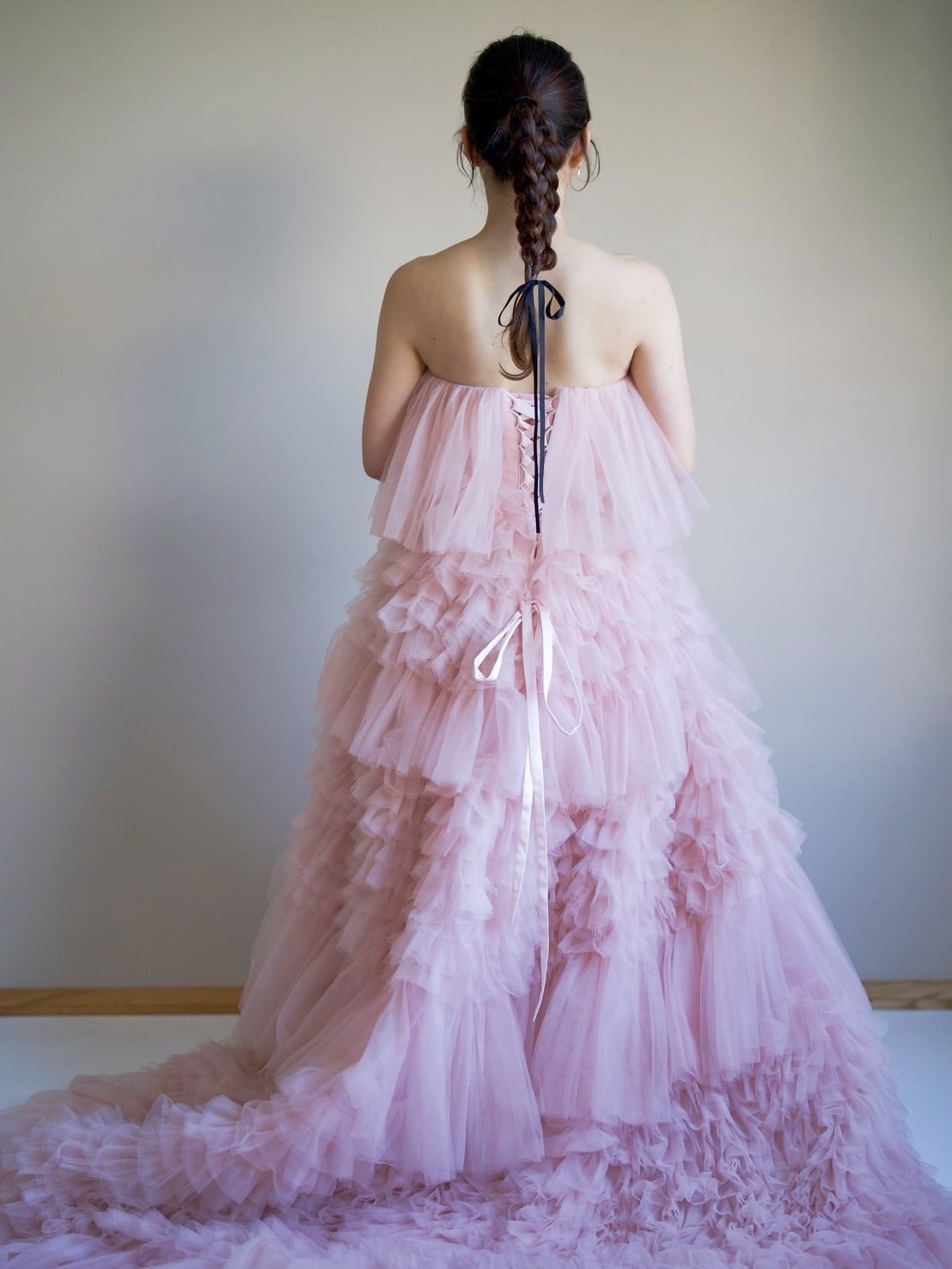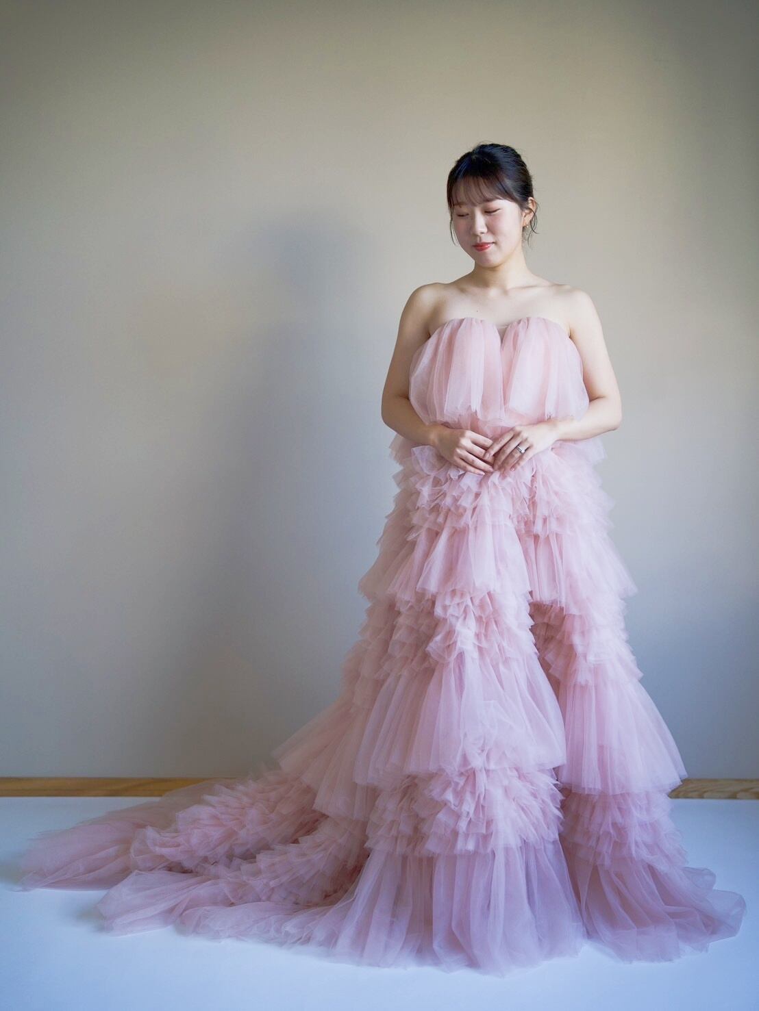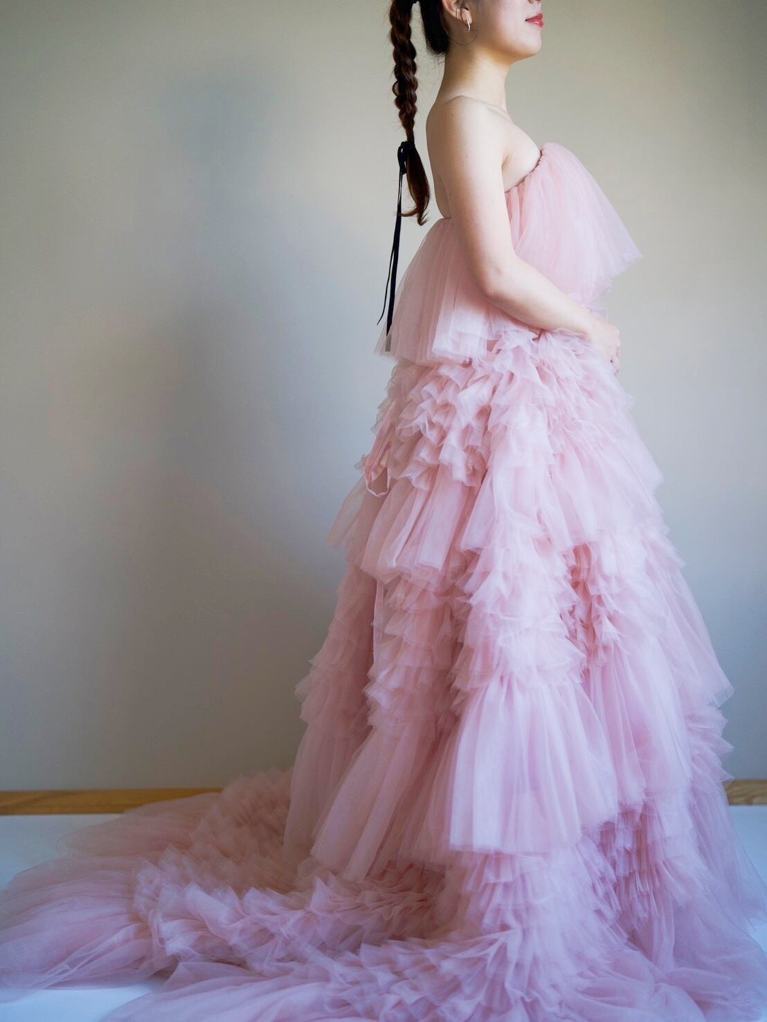 ベアトップ ピンク カラードレス 韓国風ドレス チュールドレス もこもこフリルドレス ボリューミー 前撮り
