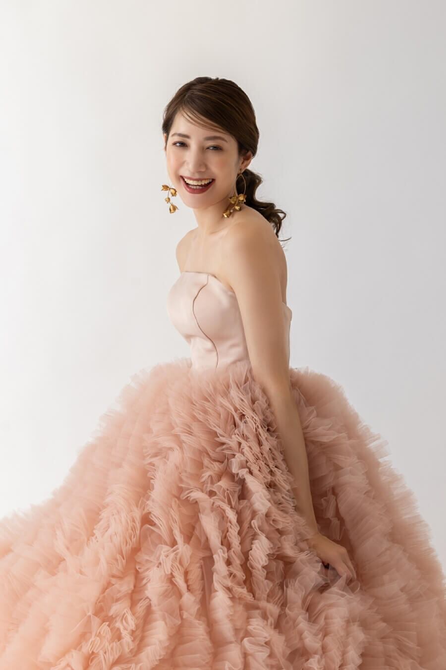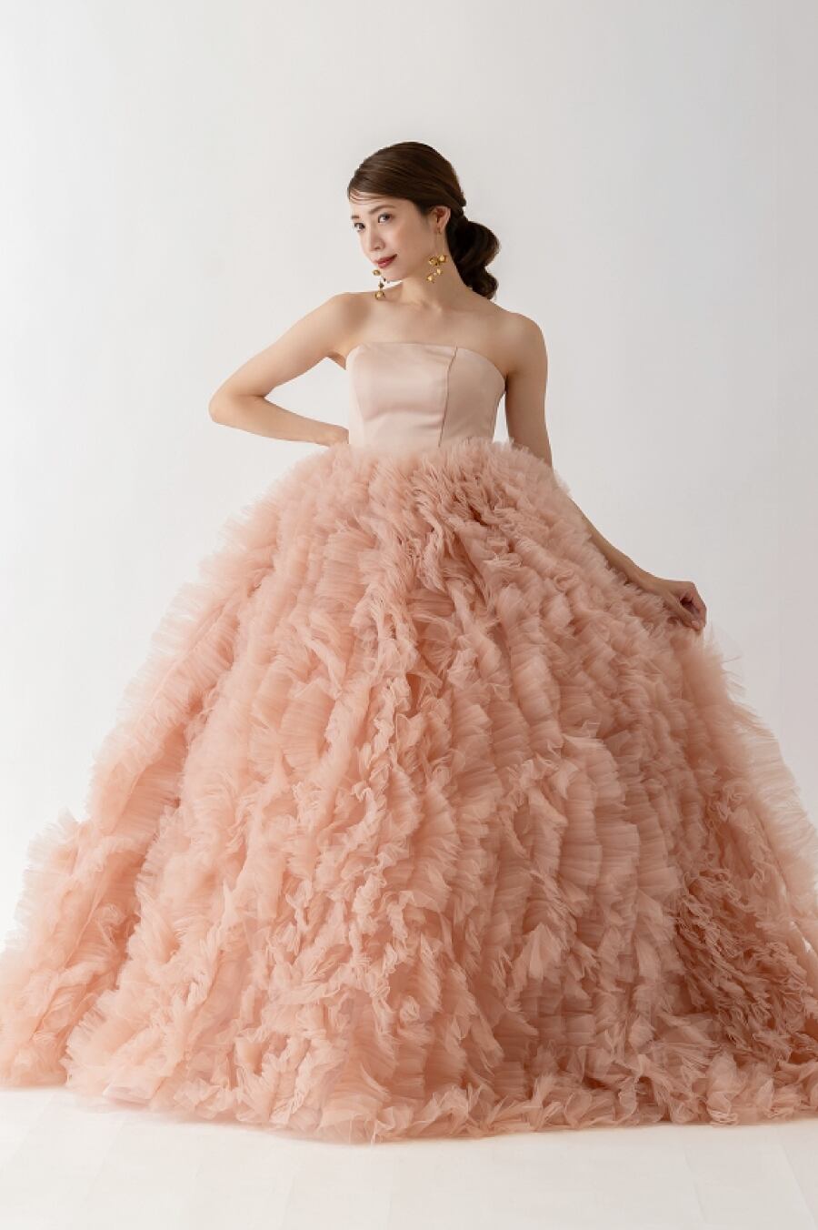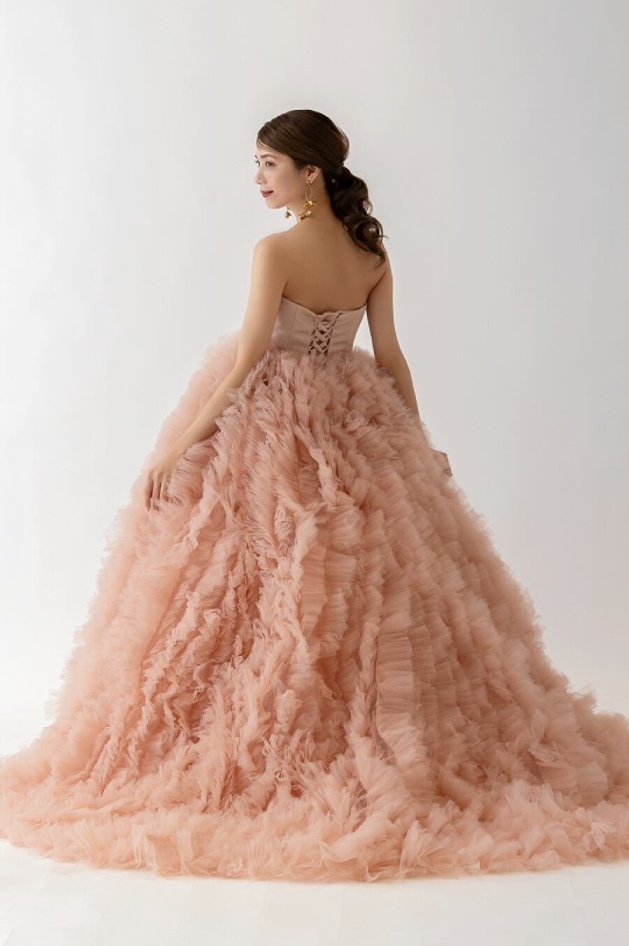 ベアトップ ピンク カラードレス 韓国風ドレス チュールドレス もこもこフリルドレス ボリューミー 前撮り