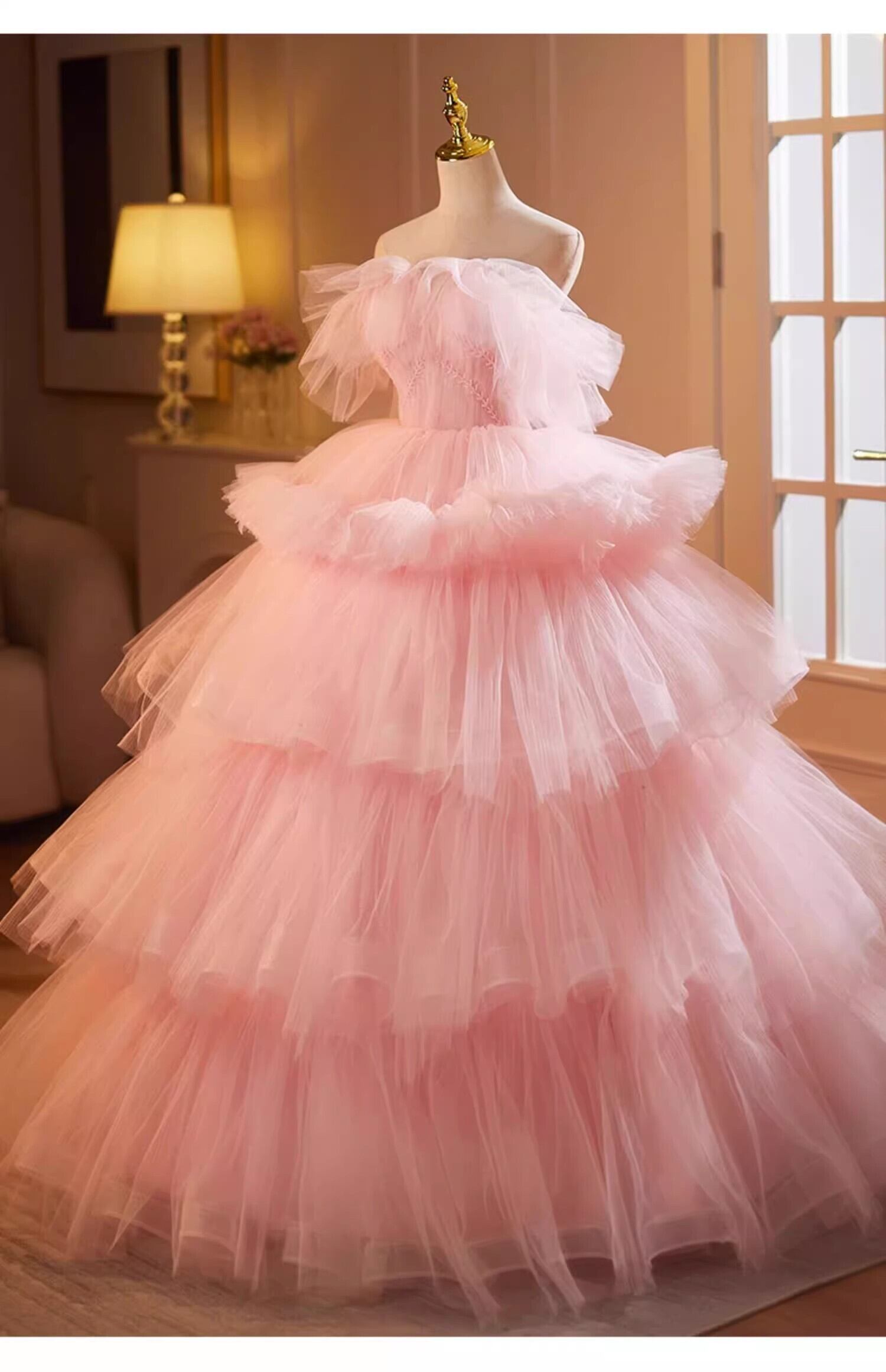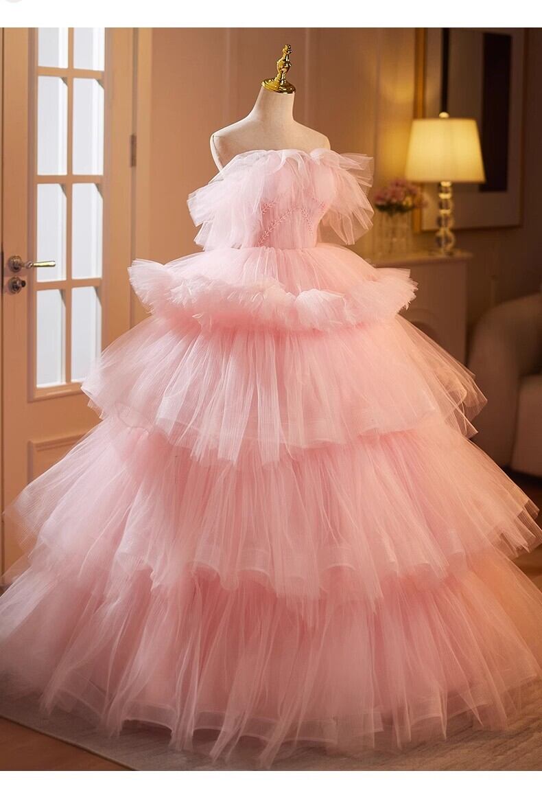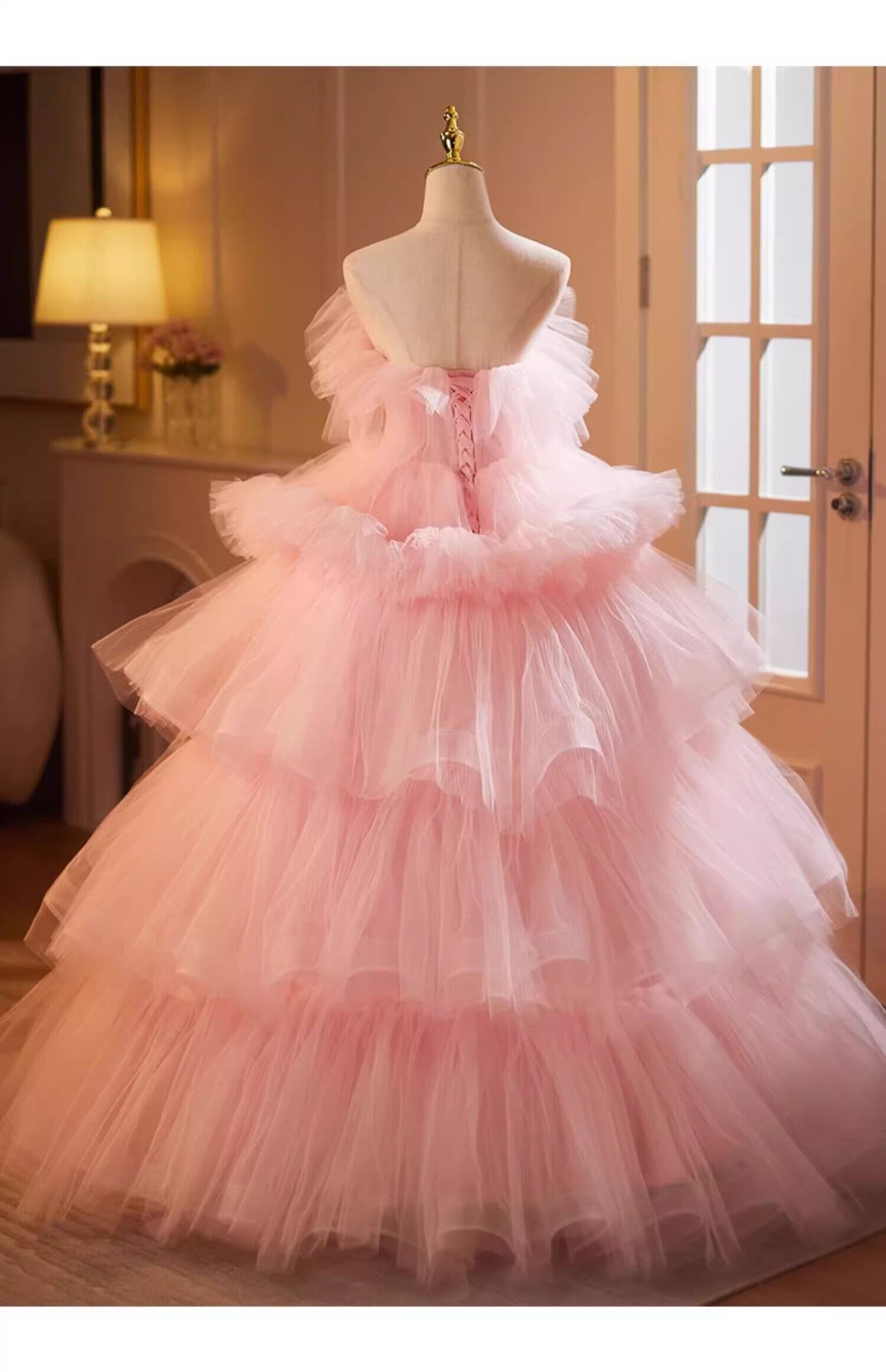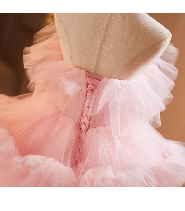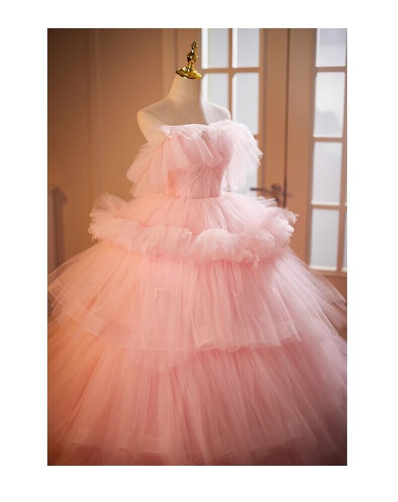 ピンク ベアトップカラードレス 韓国風ドレス チュールドレス もこもこフリルドレス ボリューミー 前撮り