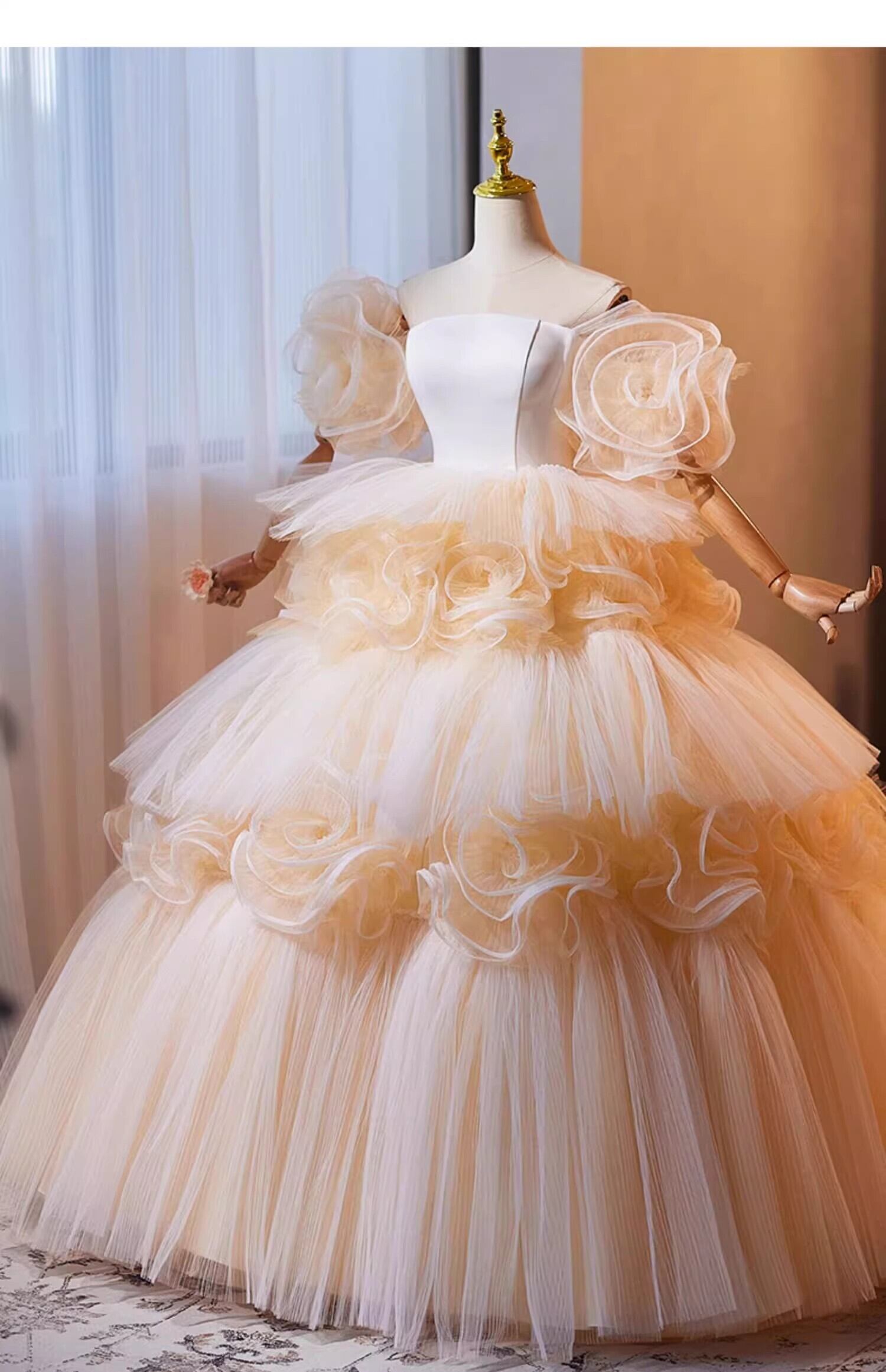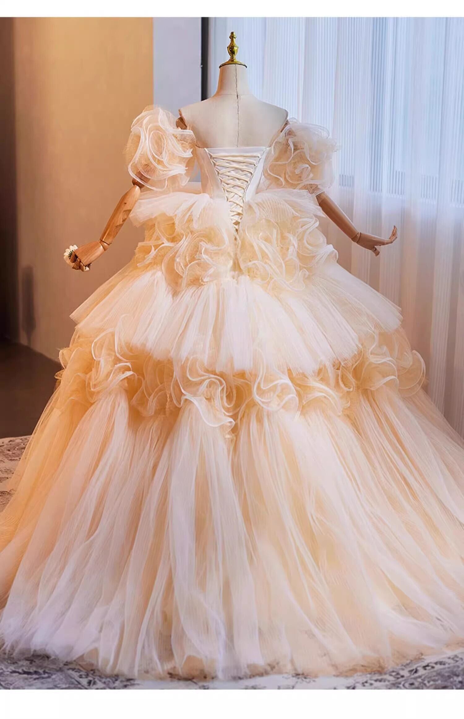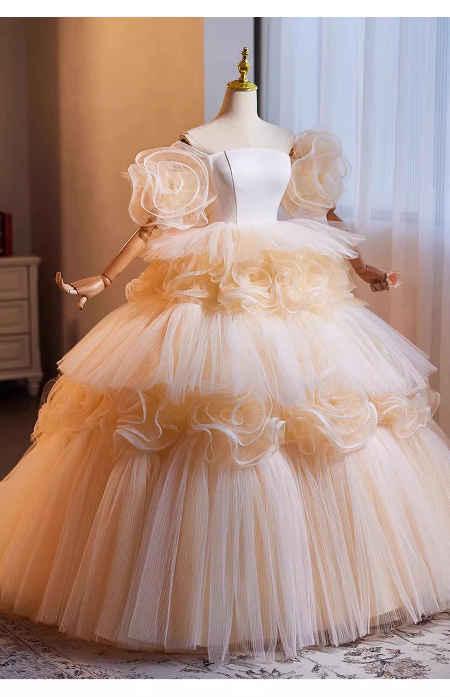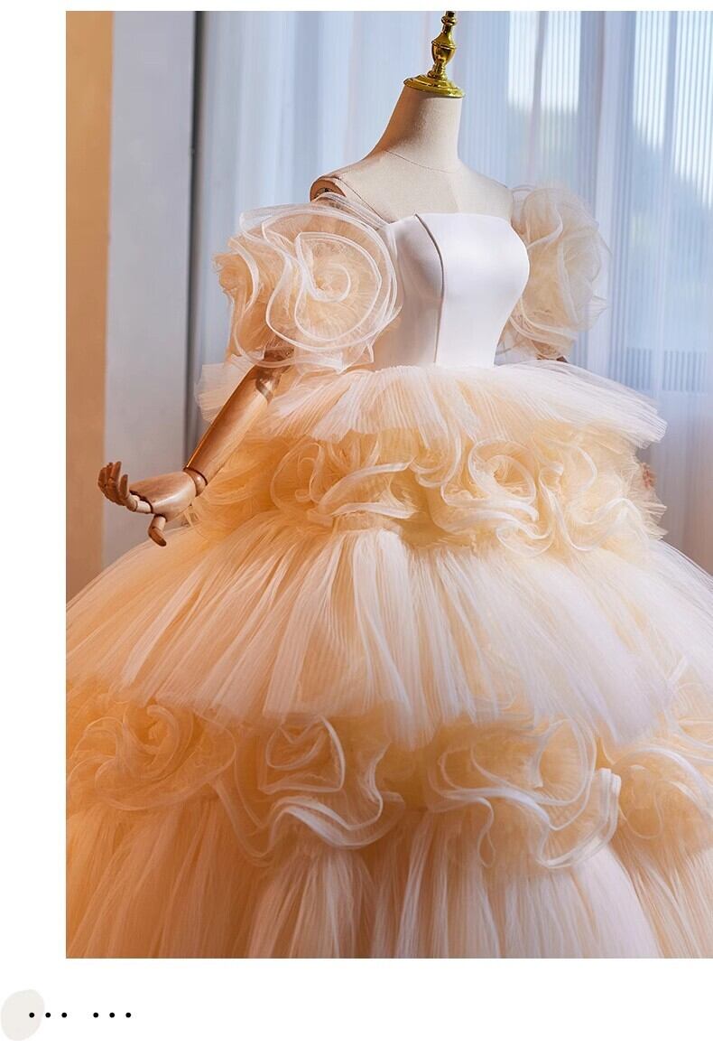 イエロー ベアトップカラードレス 韓国風ドレス チュールドレス もこもこフリルドレス ボリューミー 前撮り