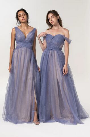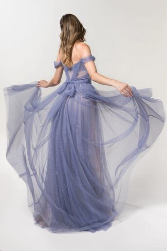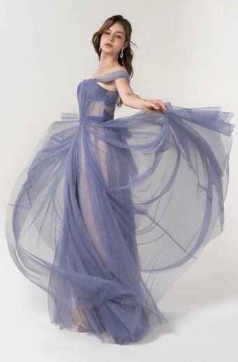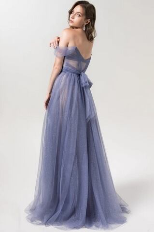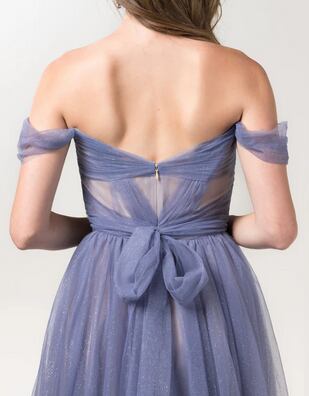 美品!紫みの青 パーティードレス ブルーカラードレス チュールスカート ダンスドレス ミディアムドレス オフショルダー