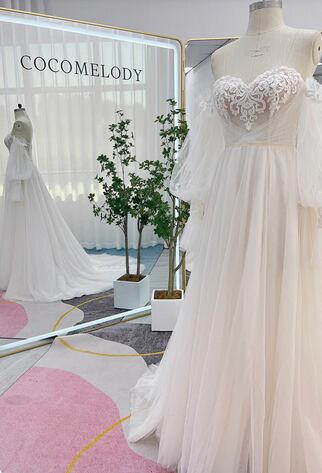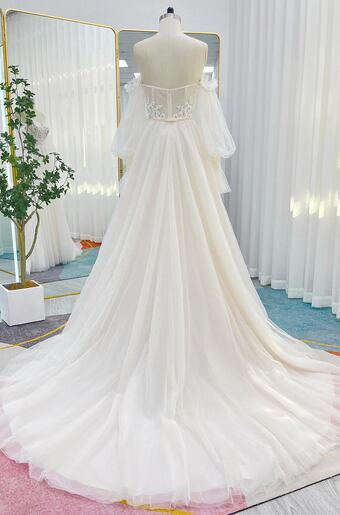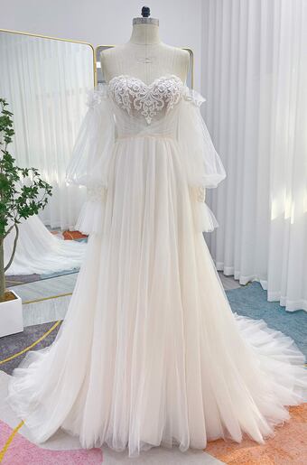 美品!オフショル ウエディングドレス モチーフ刺繡 ビショップスリーブ Aラインドレス オーダードレス ラグジュアリーフェミニン